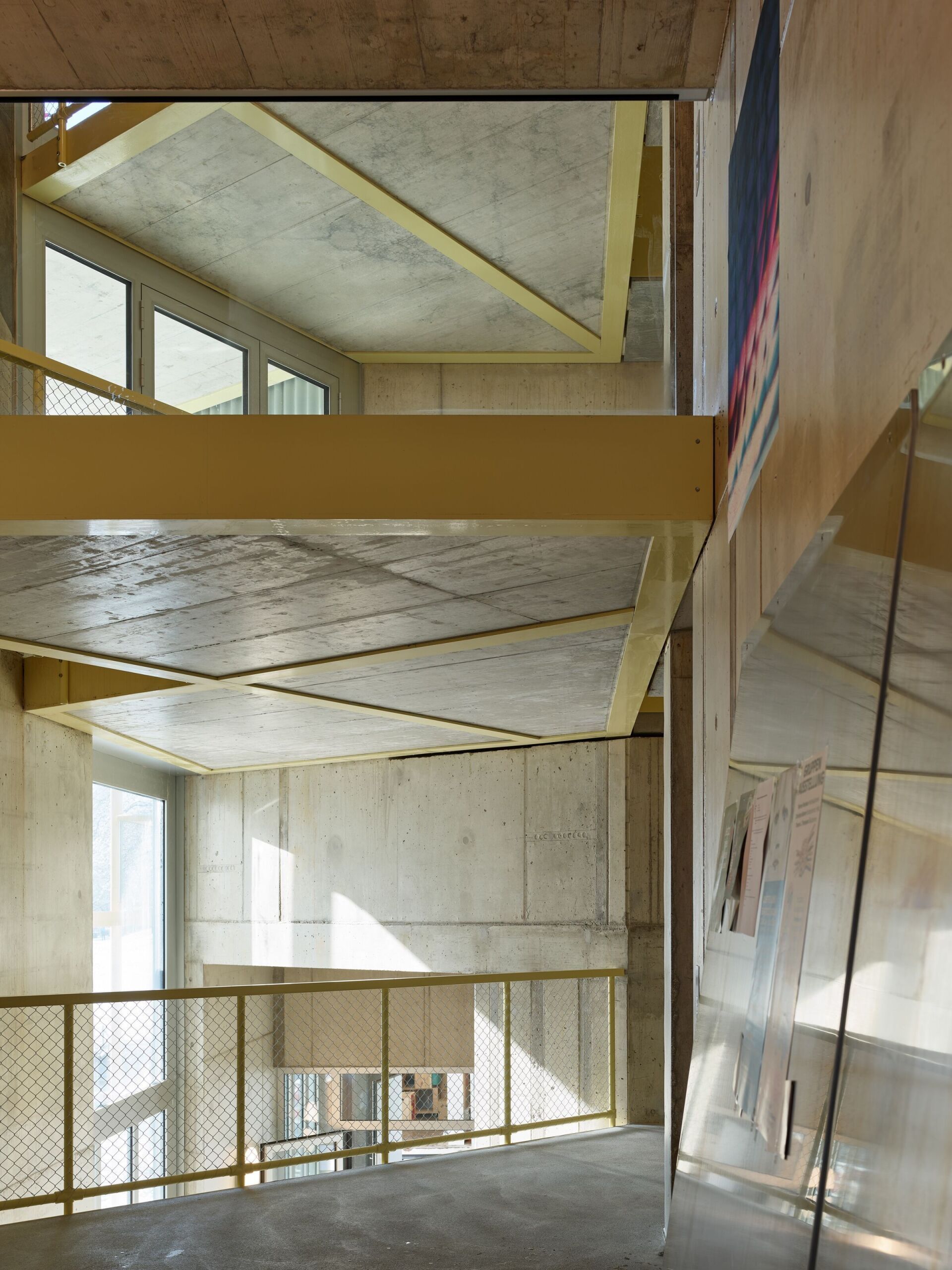 Ils ont ainsi proposé une grande coursive longeant tout l’immeuble et débouchant sur le Warmbächliweg. Elle sert de filtre entre public et privé. On y accède depuis le niveau de la rue par un escalier qui se prolonge et se révèle être une deuxième distribution verticale, en plus de la cage d’escalier intérieure de la tour. En conjuguant la profondeur de la coursive et une partie en saillie à son extrémité, les architectes ont créé des plates-formes généreuses qui sont plus que de simples zones de circulation et invitent à s’y arrêter le temps d’une discussion ou d’une rencontre entre voisin·e·s.
