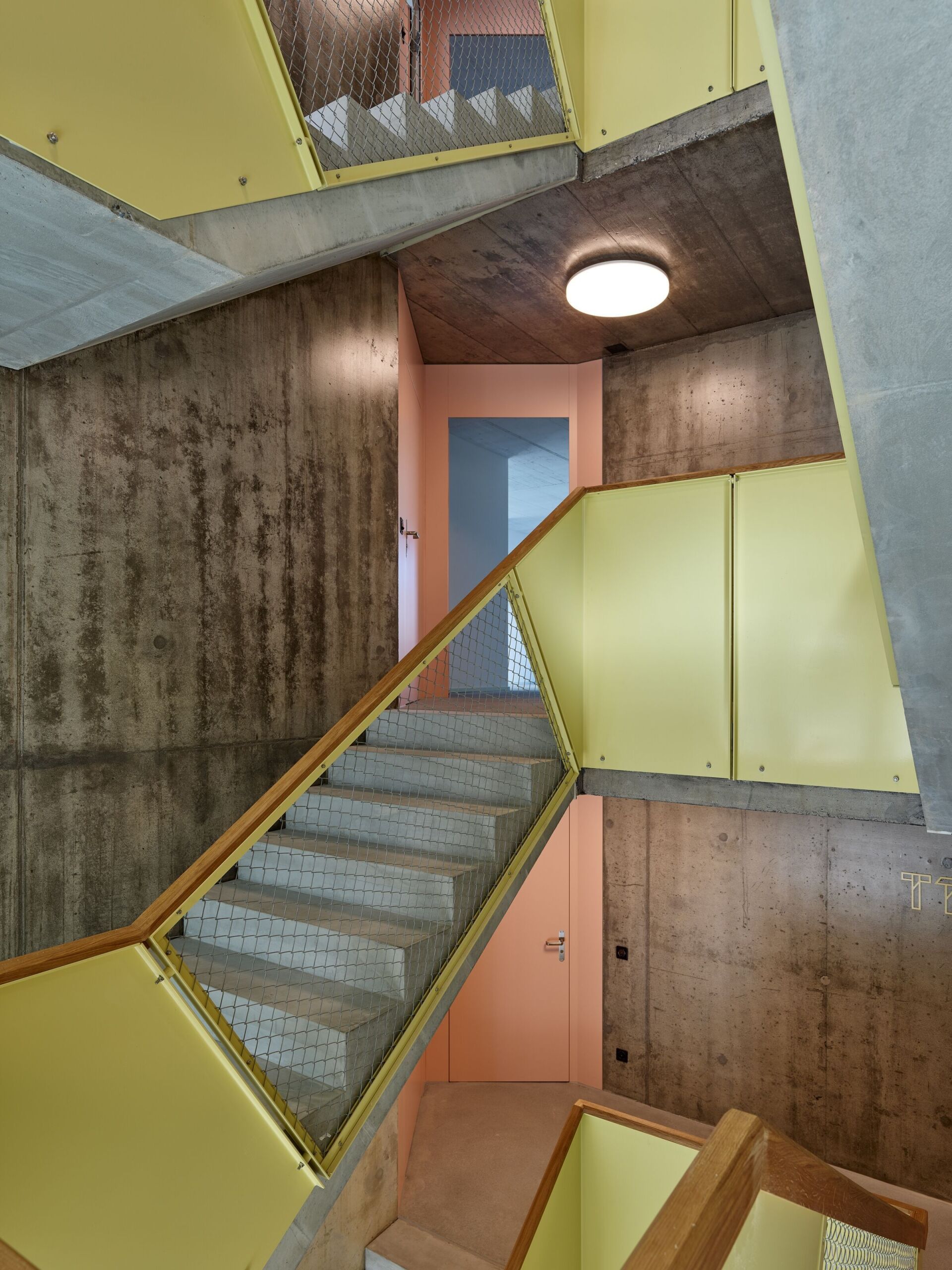 Chaque façade propose un visage différent et est calibré sur l’espace urbain adjacent. Trois d’entre elles sont animées par des bandes en métal qui rassemblent deux étages et atténuent visuellement l’échelle du grand volume. Côté cour, ces bandes se détachent de la façade pour former des balcons. Tous ces éléments en acier jaune dialoguent avec les plaques de fibrociment ondulées vert pâle et les cadres de fenêtres en aluminium anodisé incolore qui scintillent au soleil. Les fenêtres bois-métal sont fixées sur l’ossature bois de la façade qui reste invisible, créant une peau à la surface homogène. Tel un rideau fin, celle-ci enveloppe le bâtiment qui apparaît moins imposant qu’il ne l’est en réalité. Contrastant avec les tons pâles de jaune et de vert, le rouge intense des stores à projection et des stores verticaux donne à la façade son ton chaud. Le soin apporté à la sélection des matériaux et l’amour du détail dont témoigne la tectonique des façades sont pour beaucoup dans la cohérence de l’ensemble.Et la jovialité des couleurs en façade se poursuit dans la cage d’escalier de la petite tour: déployés ludiquement, les cadres jaunes des garde-corps et les cloisons légères rose saumon qui marquent les entrées des logements adoucissent l’aspect brut du béton apparent, alors que les mains courantes ajoutent la chaleur du bois à l’atmosphère du noyau de circulation verticale. Le jeu des évidements dans les dalles de la coursive se poursuit aussi dans la cage d’escalier pour y former à chaque étage une petite galerie qu’orneront bientôt des plantes grimpantes. Intérieur et extérieur s’imbriquent ainsi dans une composition spatiale aussi raffinée que complexe. Les matériaux mis en œuvre dans les logements, où prédominent les tons gris et blancs, se font discrets. On a souhaité y mettre en avant la qualité spatiale et seules les cuisines de couleur pastel reprennent le motif de la couleur utilisé pour les façades et les espaces de circulation.