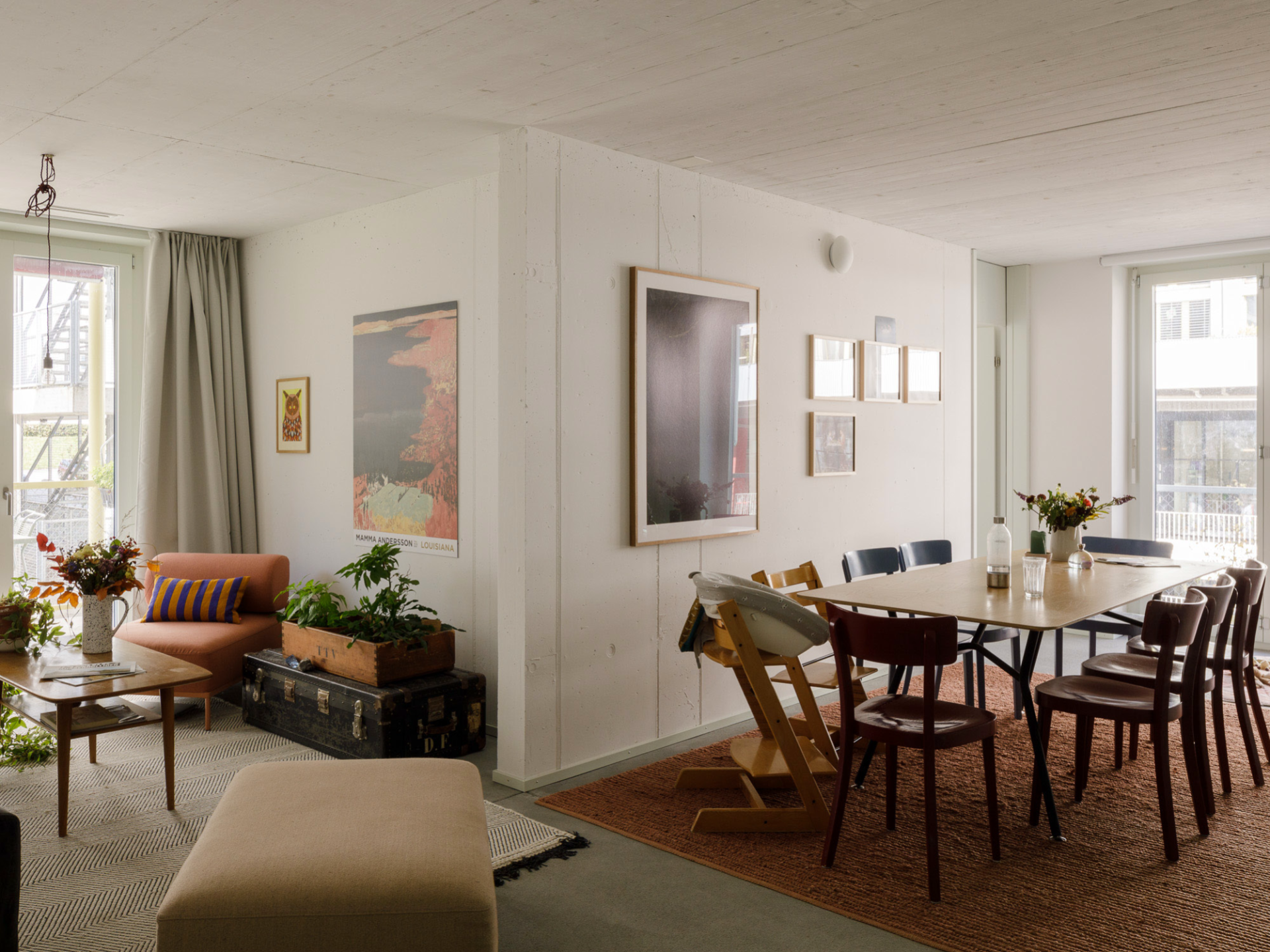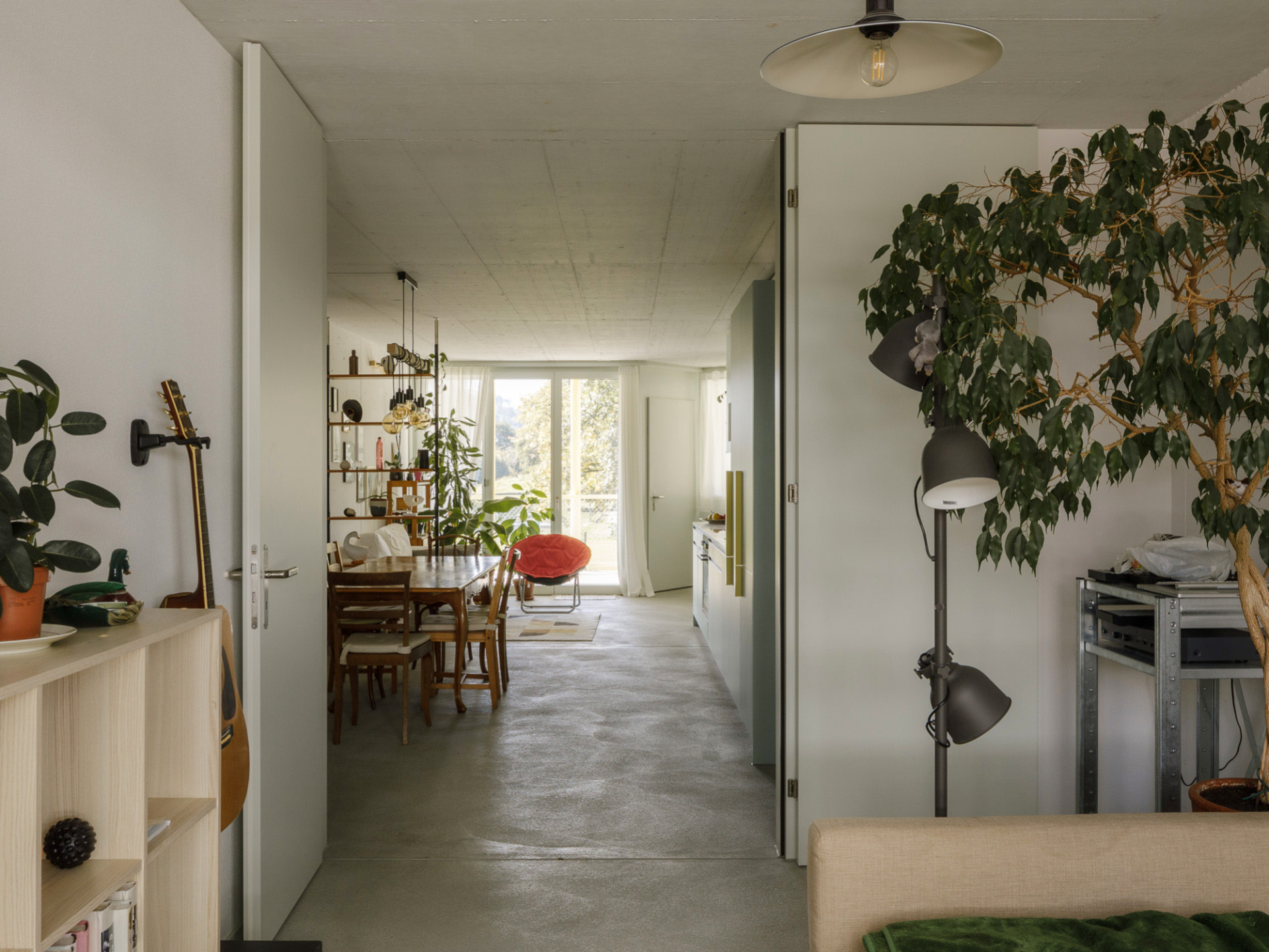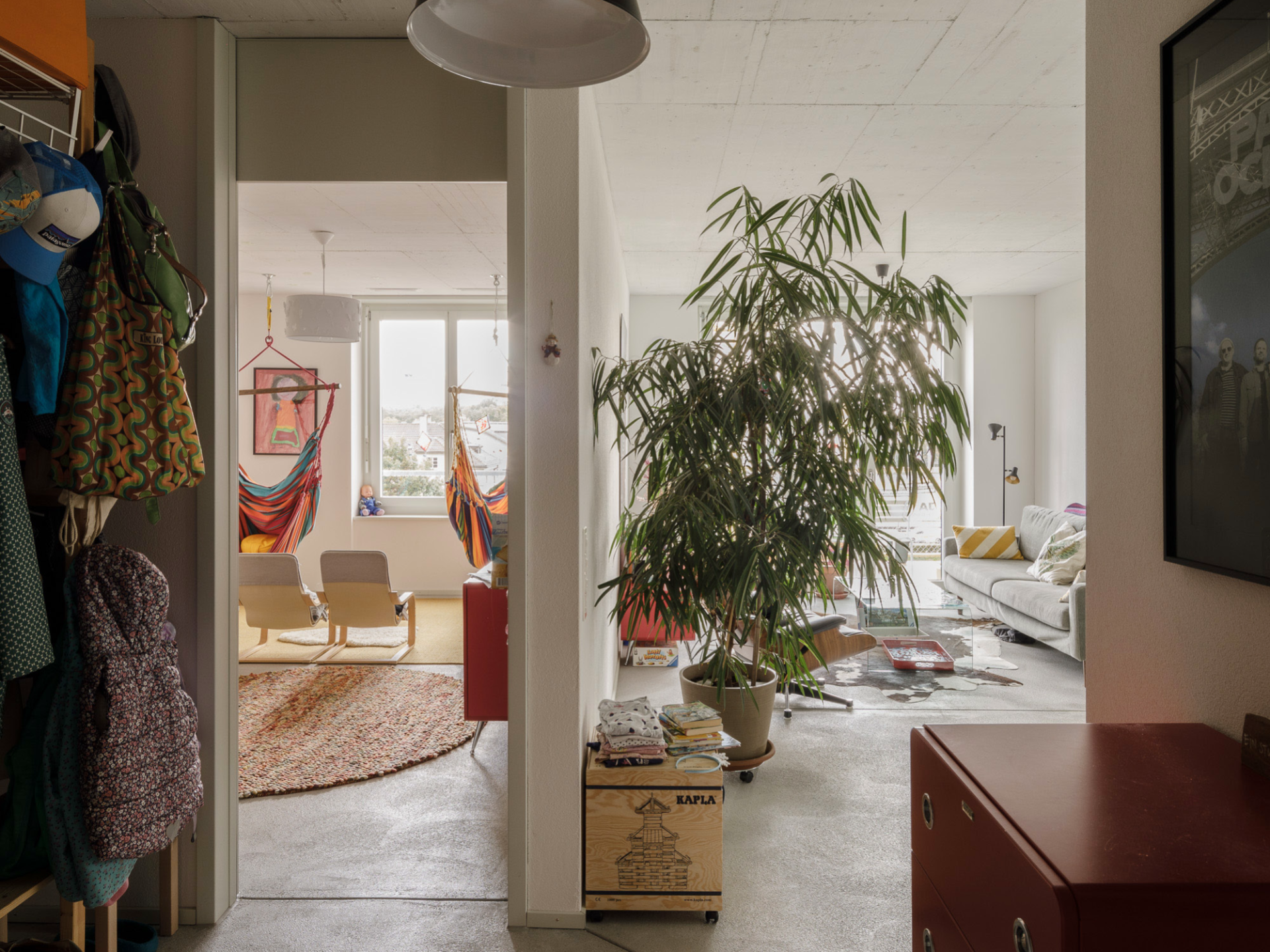 Pour Studio DIA, la durabilité sociale est synonyme d’une structure de bâtiment permettant dans le futur des adaptations permettant de nouvelles formes d’habitat. Les architectes ont organisé les logements en trois types qui sont d’une manière ou d’une autre connectés aux espaces extérieurs et de circulation au caractère semi-publics. Le volume haut abrite des logements occupant les quatre angles du volume, et tous profitent d’un balcon. Malgré l’importante profondeur induite par la surface de 18 par 20 mètres, les logements paraissent ouverts et clairs. Leur organisation n’a rien de spectaculaire à première vue. Mais à bien y regarder, une particularité finit par sauter aux yeux: les corridors de deux appartements n’en font qu’un et sont séparés par une simple cloison légère. Il est ainsi possible de les réunir sans grand effort. Conséquence: deux logements aux tailles et à l’organisation typiques du 20ème siècle peuvent devenir une seule grande unité offrant la possibilité d’explorer de nouvelles formes de travail et d’habitat. Un logement tel serait alors pourvu de deux cuisines et de deux balcons offrant aux résident-es la possibilité de bénéficier en même temps d’espaces extérieurs au soleil et à l’ombre. Peut-être cette option conviendra-t-elle un jour à une grande colocation ou à deux familles amies souhaitant se partager la garde et l’éducation des enfants? Une astuce qui, selon les architectes, permet d’anticiper spatialement une éventuelle évolution de la société.