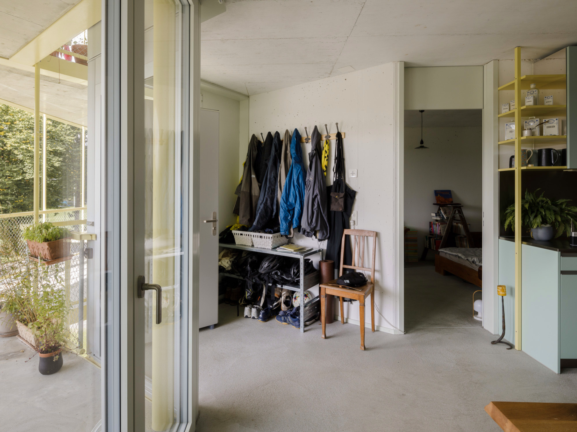 Stromboli séduit tout autant pour son offre de logements diversifiée et adaptable, que pour sa collection d’espaces à caractère semi-public, il ne parvient toutefois pas à réellement créer une cour avec ses acolytes du quartier Holliger. Un jardin communautaire convivial, créé et aménagé par les habitant·e·s, accueille le visiteur qui arrive depuis l’arrêt de bus situé près du Warmbächliweg. C’est un point de rencontre central pour la communauté de l’immeuble, qui plus est côté ensoleillé. Un escalier métallique soigneusement détaillé invite à rejoindre le niveau de la coursive semi-publique. On trouve aussi de ce côté l’accès au garage à vélos, important pour cette coopérative sans voitures, et l’entrée de la bibliothèque. Ce faisant, l’adresse principale du bâtiment ne se trouve pas côté cour, mais côté rue. Cela ne signifie pas pour autant que le bâtiment tourne le dos au petit parc, puisque la cage d’escalier s’y ouvre avec un foyer et un avant-toit. Mais, trop filigrane, l’appel timide ne semble pas en mesure de rivaliser avec la façade et sa polychromie marquée. Et l’on en vient presque à regretter que les gestes architecturaux généreux côté rue n’ont pas été reproduits côté cour. Les habitant-es des duplex sont les plus susceptibles de s’approprier celle-ci puisque les unités mitoyennes profitent d’un accès plain-pied et que leurs cuisines y sont orientées. Mais cela suffira-t-il à animer la cour? Une plus grande perméabilité du bâtiment l’aurait certainement assuré, en créant par exemple un espace commun reliant à la fois les deux côtés et les deux niveaux du terrain. Les habitant-es du quartier Holliger se partagent bien quelques espaces, mais ceux-ci sont presque exclusivement placés dans le bâtiment Holligerhof 8 (conçu par BHSF / parcelle O2) de la coopérative Warmbächli. Les répartir de manière cohérente entre les différents bâtiments aurait en ce sens été plus intéressant.