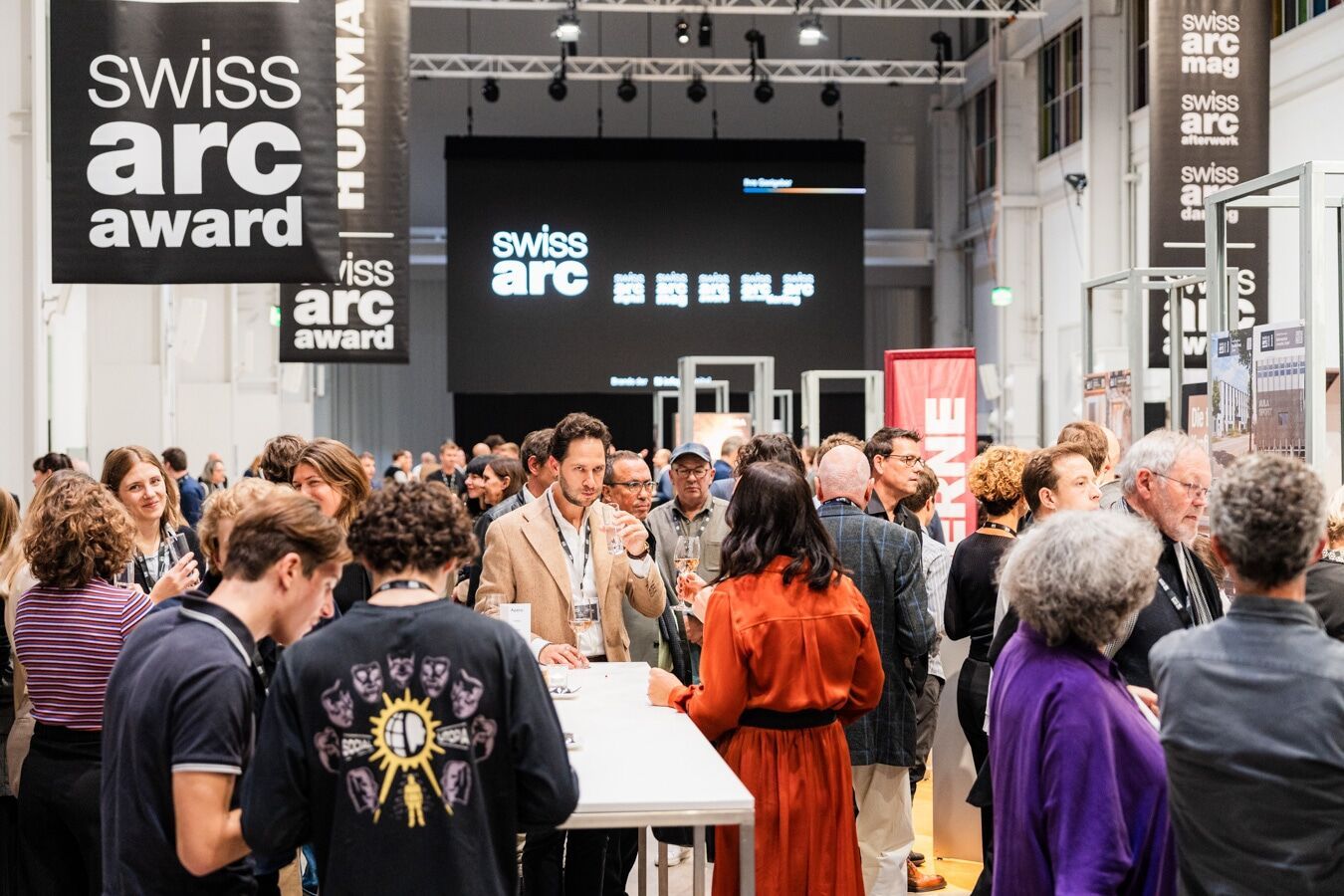Le Swiss Arc Award s’est depuis longtemps imposé comme un événement annuel incontournable dans le monde de l’architecture suisse. Plus qu’une simple remise de prix, ce gala allie la présentation de la culture architecturale et des innovations à une occasion de réseautage dans une ambiance unique. La soirée a débuté par une réception conviviale, suivie d’une visite des nouveautés présentées sur les stands des sponsors, puis de la cérémonie de remise des prix. La présentation de tous les projets présélectionnés à l’aide de grandes photos sur des totems a non seulement créé une ambiance particulière dans le hall, mais a également permis d’étudier tranquillement les bâtiments nominés et de découvrir les détails créatifs des projets. Après la partie scénique, l’immense hall 37 s’est transformé en un lieu de rencontre animé pour les 500 participants et invités. Les délices culinaires allaient des burgers gastronomiques au dîner volant à plusieurs plats. Au moment de prendre congé, chaque visiteur a reçu le magazine Arc Award fraîchement imprimé, qui présente les bâtiments nominés et primés. Avec les dossiers complets de tous les projets soumis en ligne sur Swiss Arc, il invite cette année encore à se plonger davantage dans les contributions variées et exceptionnelles, à la manière d’un annuaire bimédia de l’architecture suisse.