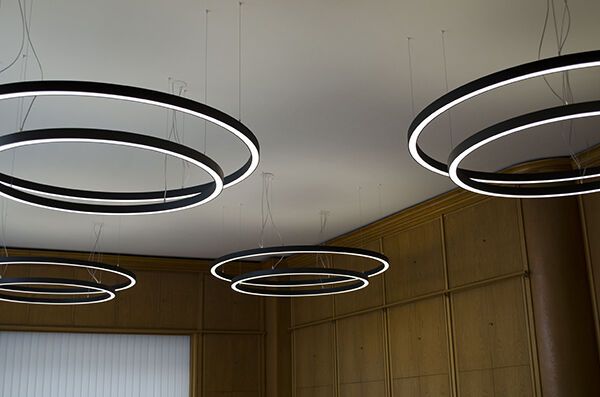 Les luminaires à double couronne en aluminium confèrent à ce secrétariat de Fribourg une ambiance de prestige.
