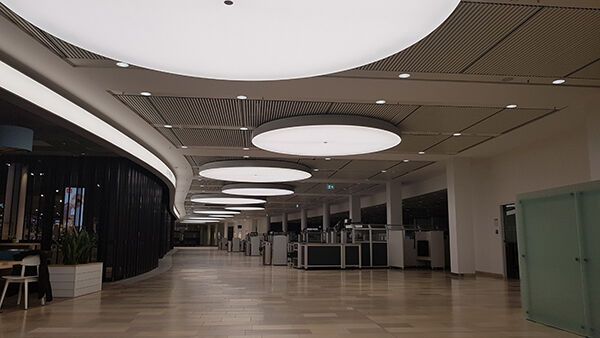Le terminal de l’aéroport devait être éclairé par de grands luminaires circulaires. De plus, il y avait au-dessus des magasins une bande lumineuse en forme de vague d’environ 50 mètres de long, imprimée avec différents lettrages. La taille des luminaires, avec un diamètre allant jusqu’à 4,50 mètres, imposait à elle seule des exigences particulières à la statique des luminaires. En outre, il a fallu intégrer des éléments de la technique du bâtiment tels que le système d’arrosage automatique. Là aussi, nos techniciens et designers ont réalisé des lampes spéciales. En raison de la taille des luminaires, nous avons opté pour une version sous forme de luminaire en toile tendue, qui est également une spécialité de Fluora Leuchten AG.