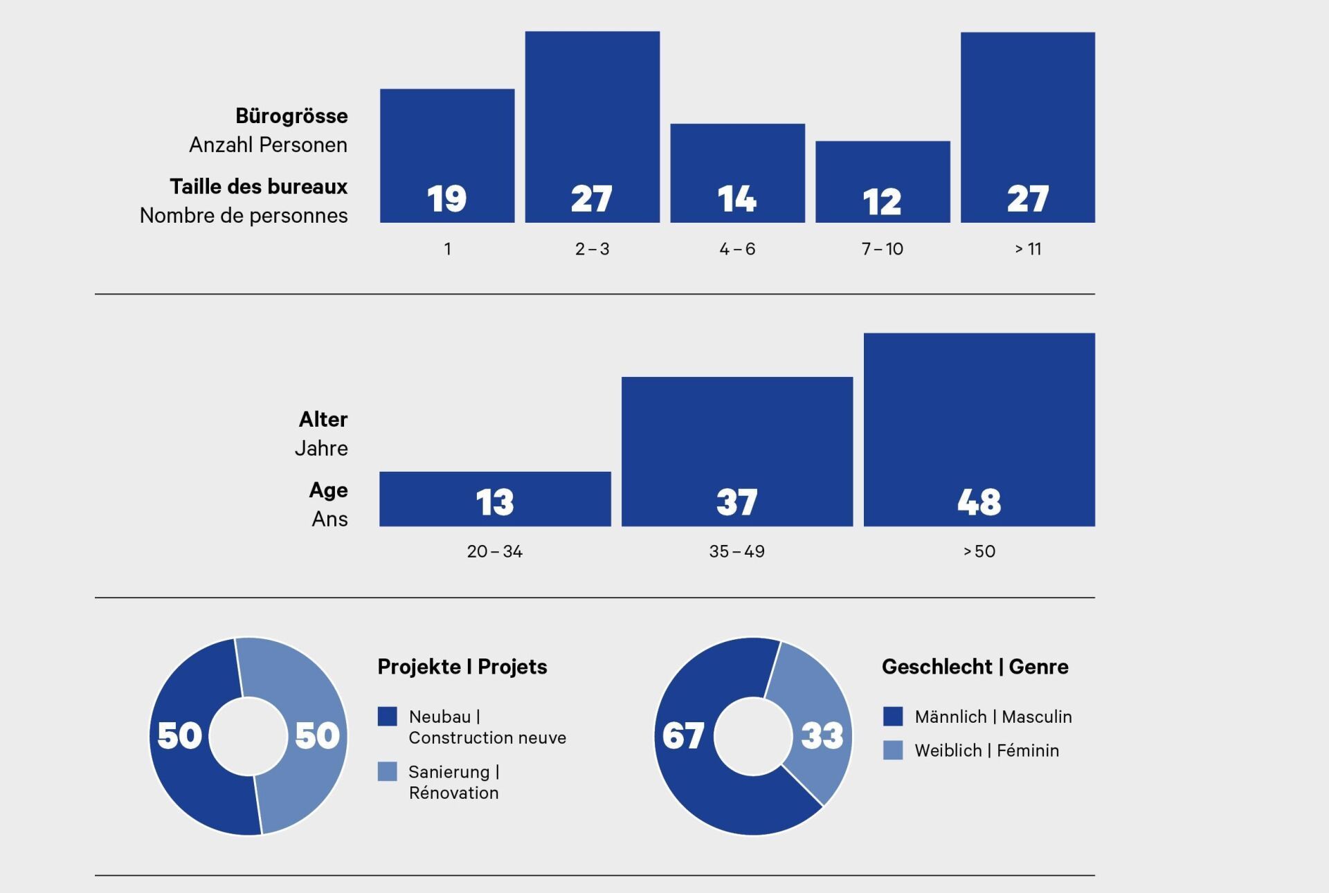 Un rapport détaillé d’environ 40 pages présente pour chaque entreprise un bilan individuel basé sur l’évaluation des architectes et planificateur·rice·s. Des analyses approfondies par région, profession, âge et sexe – et pour 2025 également par région linguistique – fournissent des indications précieuses pour optimiser le positionnement des marques et guider les stratégies à venir.
