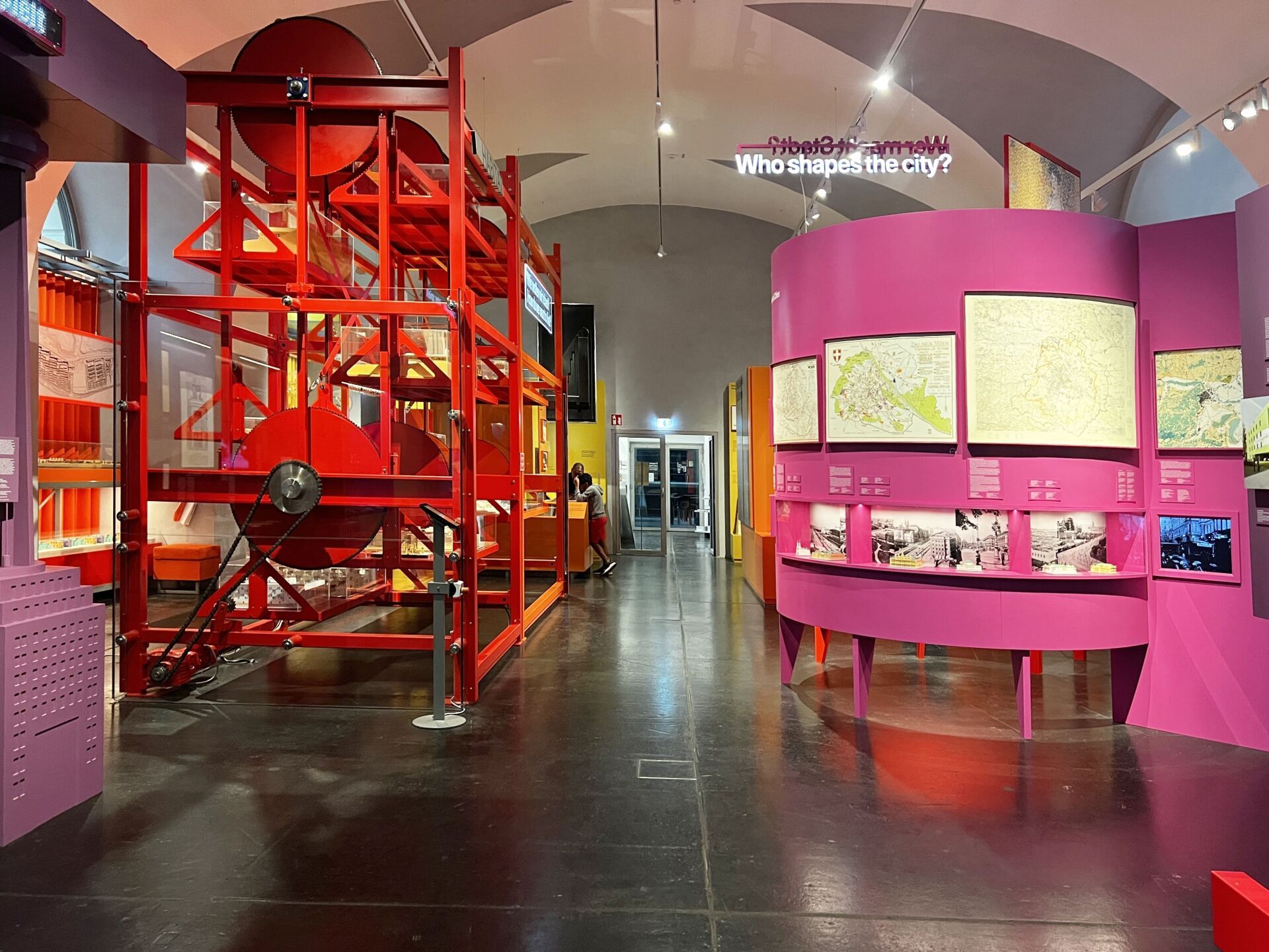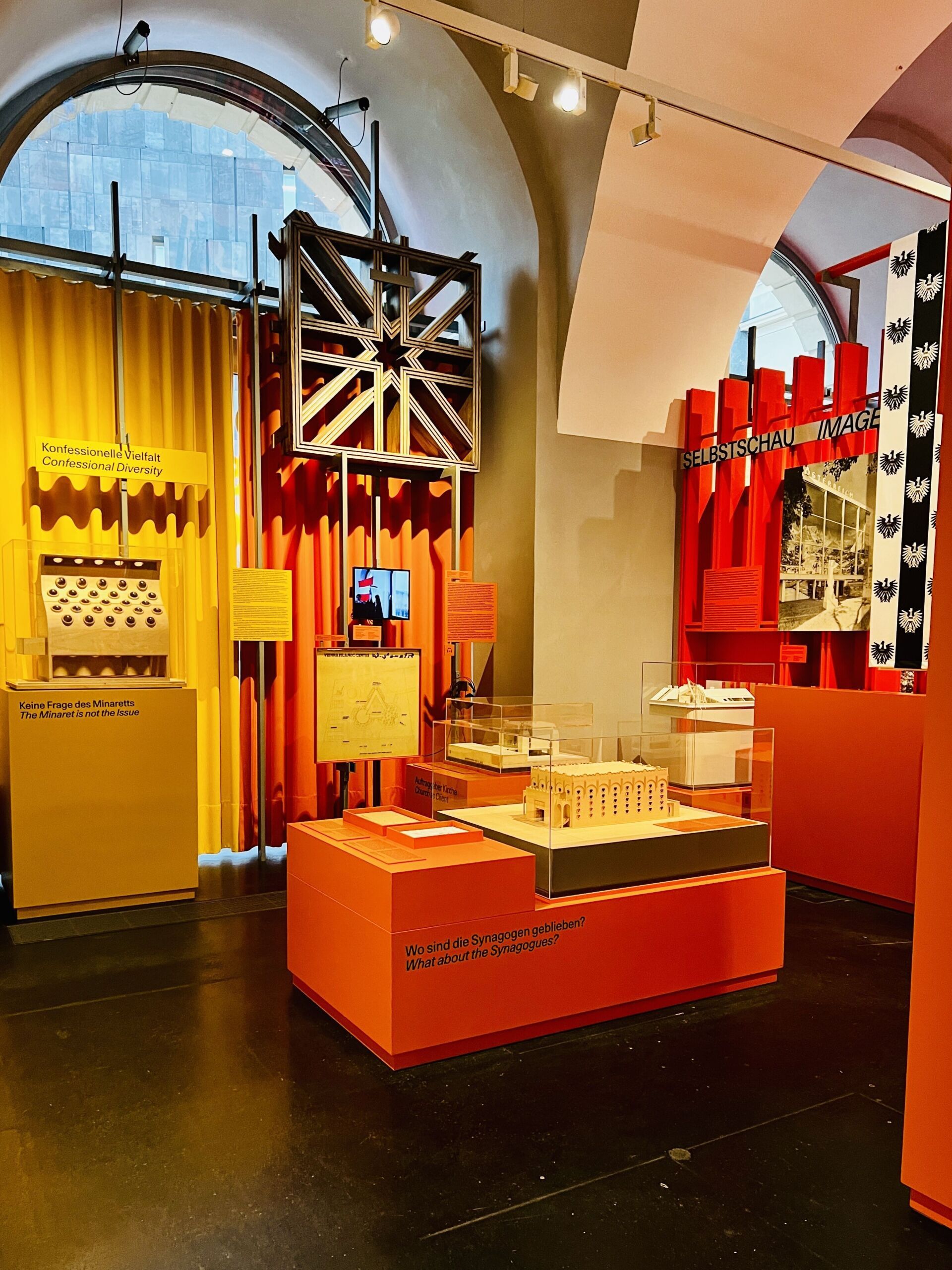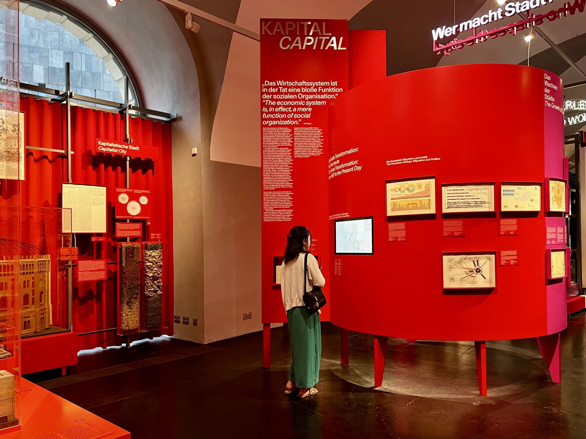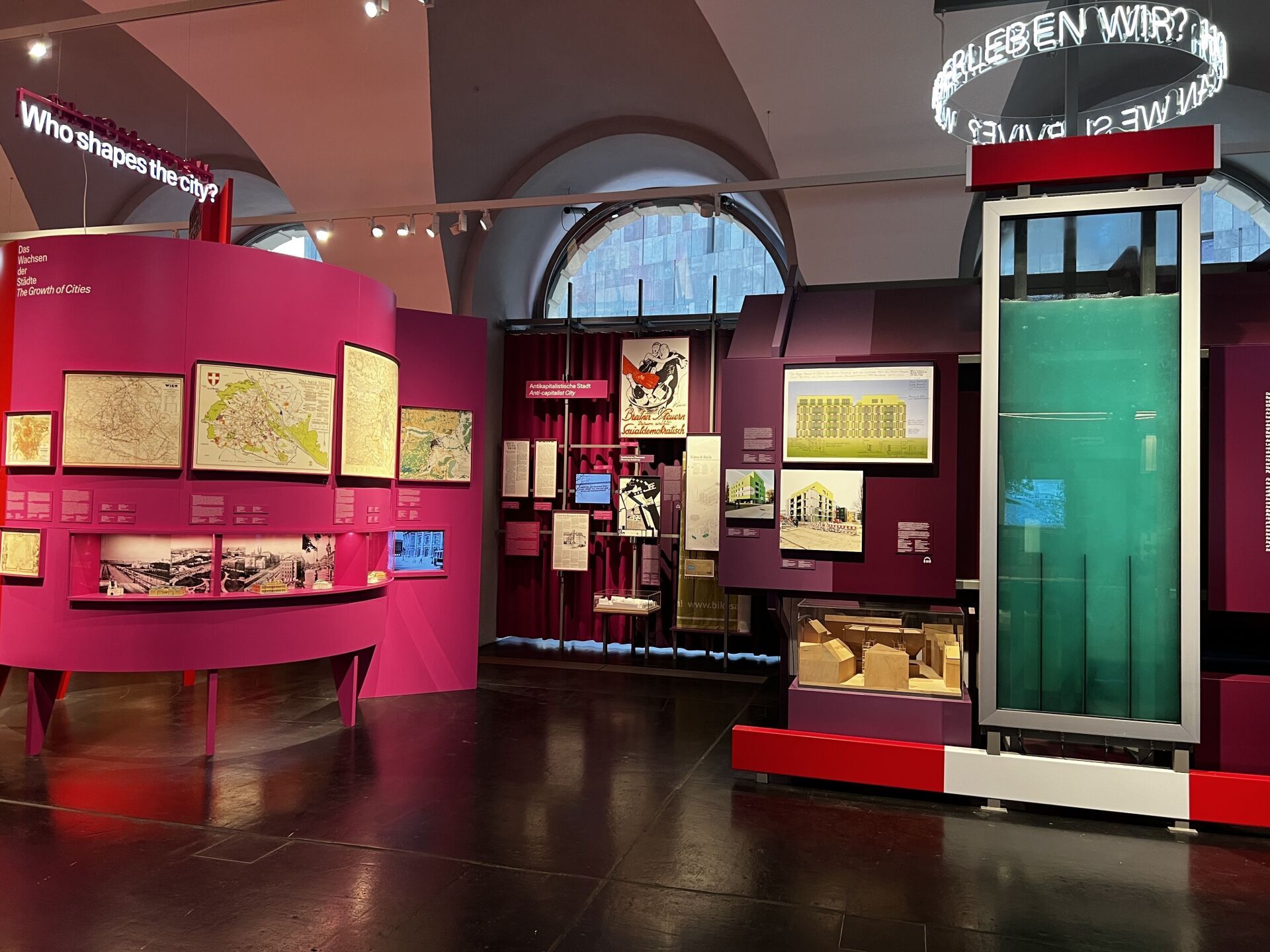 Lors de notre parcours, il apparaît clairement à quel point la dramaturgie spatiale est étroitement liée à la structuration du contenu. Chaque couleur correspond à un thème sans pour autant être trop démonstrative: un rouge vif pour «Kapital», un bleu profond pour «Gemeinwohl», un jaune soutenu pour «Bausteine». Cet ordre visuel offre des repères sans pour autant revendiquer une univocité. Au-dessus de nos têtes flottent des questions aux couleurs néon – «Wer macht Stadt?», «Wie überleben wir?» – telles des fils conducteurs qui traversent tous les espaces et accompagnent la réflexion en marchant.