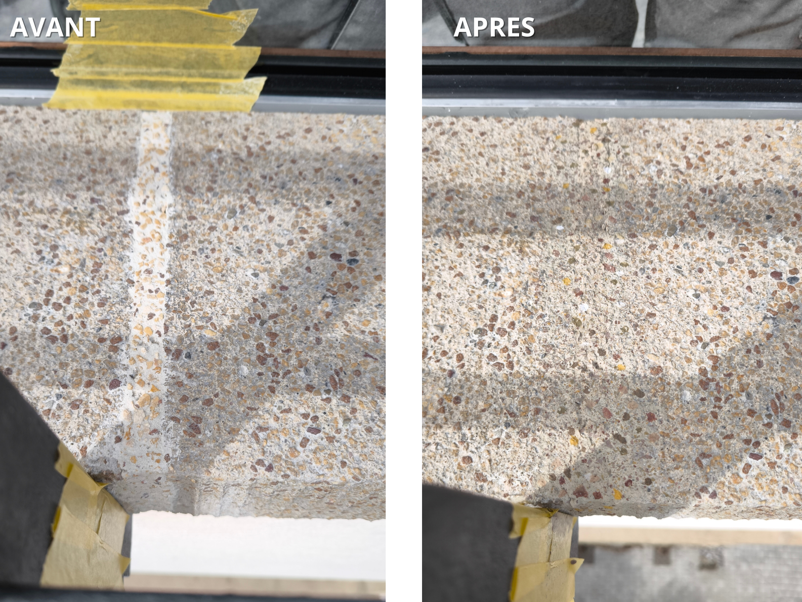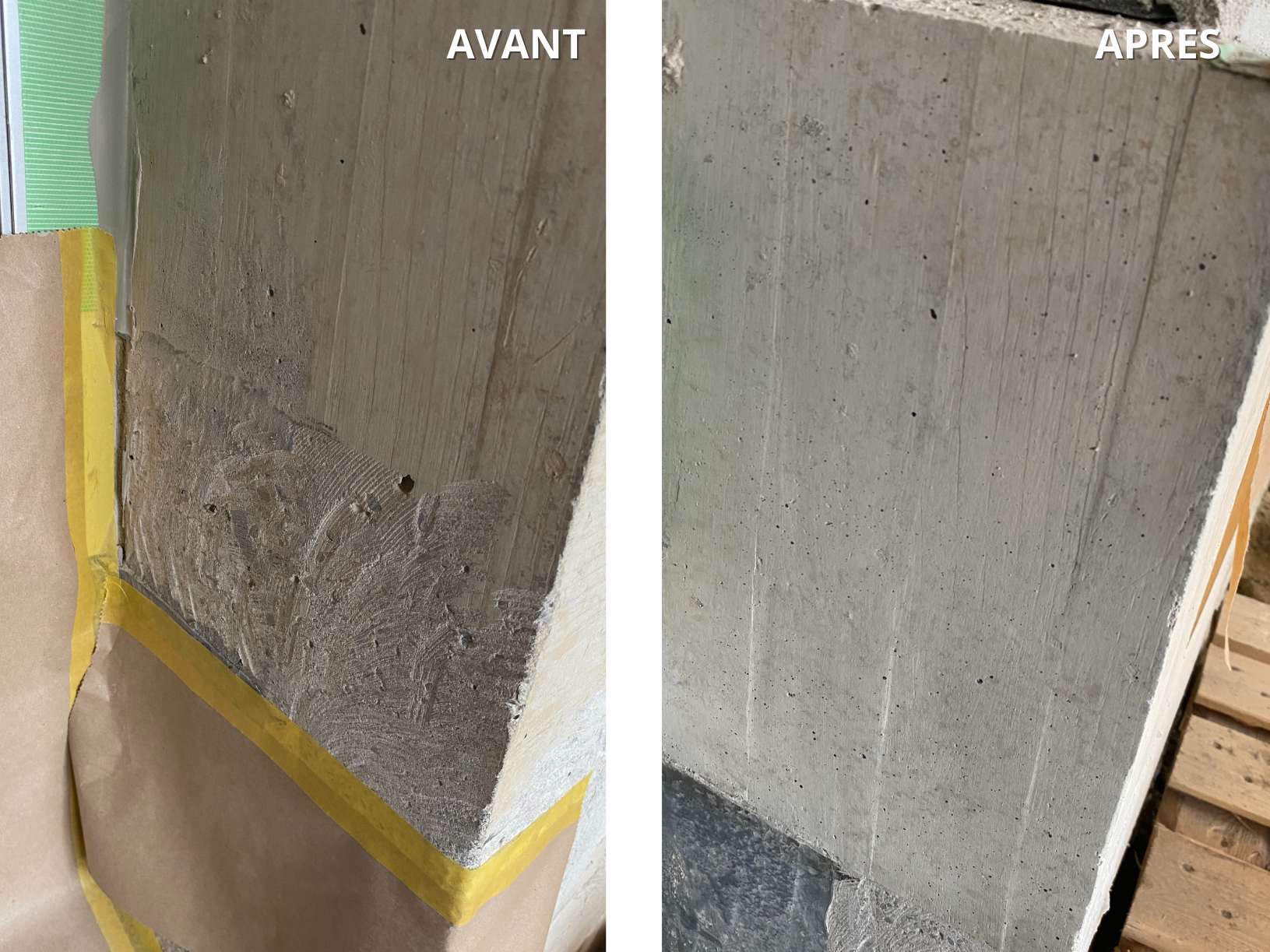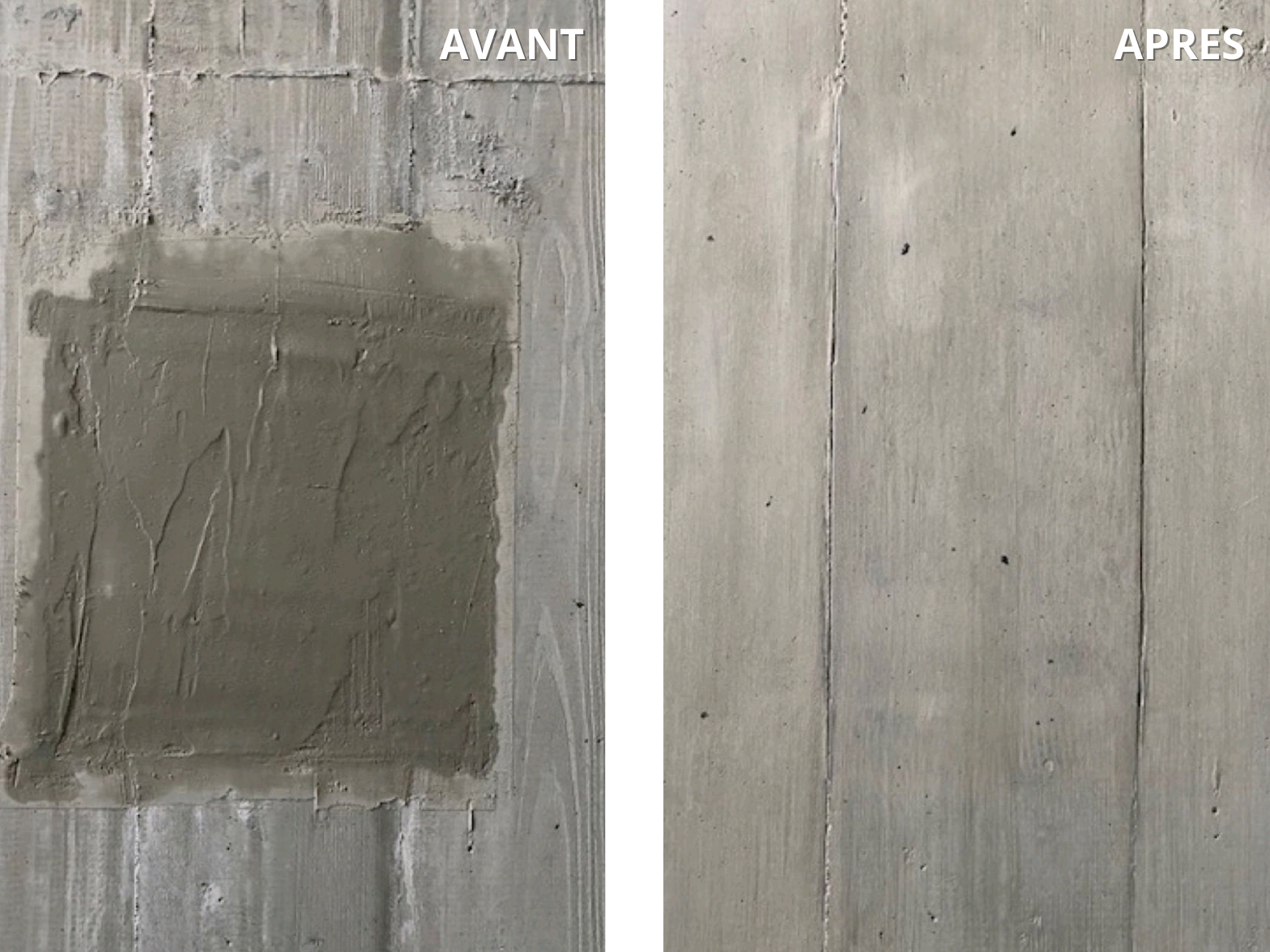 Parfois, notre travail devient presque chirurgical: reboucher un trou laissé par un électricien, refermer une ouverture, effacer une cicatrice, gommer les traces d’un coup de meuleuse… Autant d’opérations minutieuses que notre métier de «cosmétique du béton» permet d’accomplir avec précision et respect de la matière.