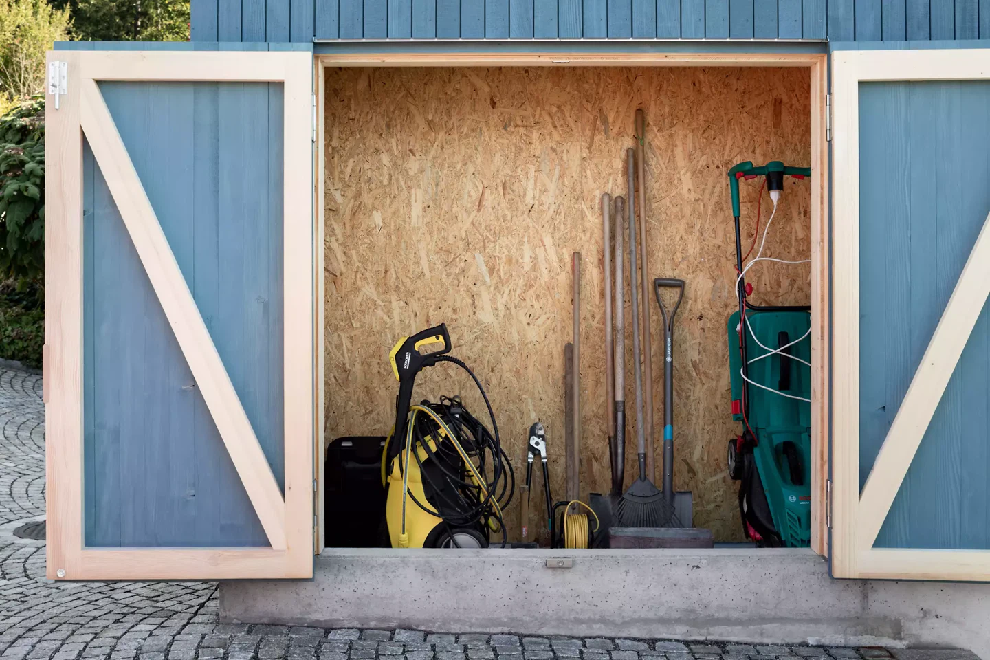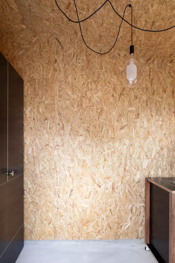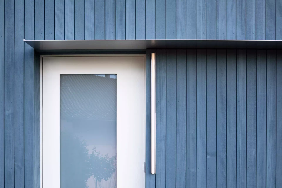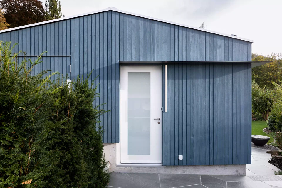 L'accès à l'abri de jardin se fait par trois marches qui descendent vers la terrasse avec vue sur le lac et soleil couchant. L'entrée est soulignée par un auvent métallique filigrane, qui se répète dans une version réduite sur les portes du garage et des placards. La lampe extérieure à côté de la porte est conçue comme un profilé en U fin et dirige la lumière supérieure vers le haut le long de la pente et la lumière inférieure vers le bas. À l'instar d'un couteau suisse, les portes de l'abri de jardin peuvent être ouvertes et fermées. Côté rue, on trouve un local à vélos et, sur le côté, un placard extérieur pour les outils de jardinage et les outils. Lorsqu'elles sont fermées, les portes du garage et les portes des placards disparaissent dans la façade comme des portes tapissées. Les portes ouvertes permettent d'apercevoir les murs intérieurs naturels recouverts de panneaux OSB.
