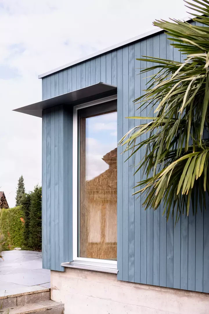 Le défi consistait à ajouter à l'ensemble existant un élément qui s'intègre harmonieusement, tout en formant un bâtiment de tête avec son propre caractère et en reprenant le rythme existant. Lorsqu'elle est fermée, la maison de jardin se présente comme une petite maison archétypale avec une porte, des fenêtres et un toit en pente. Elle suit le rythme de l'ensemble, double le volume du garage, mais joue sa propre mélodie. Alors que le garage est crépis et présente un avant-toit, l'abri de jardin est en bois avec un socle en béton et un revêtement en lattes de bois sans avant-toit. Contrastant avec la façade jaune clair du bâtiment existant, l'abri de jardin reprend le bleu-gris de la porte d'entrée.