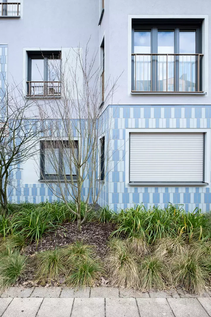 Le bâtiment d'angle forme un espace théâtral avec une vue dégagée sur la profondeur du bloc urbain. De grands balcons offrent aux appartements familiaux une pièce extérieure à part entière, où le lien direct entre l'intérieur et l'extérieur peut être vécu et où la vie urbaine acquiert une qualité supplémentaire. Des accès directs depuis les cages d'escalier vers la cour intérieure verdoyante, qui a été délibérément conçue sans jardins privés, mais avec un abri de jardin servant de lieu de rencontre pour des événements communautaires, ainsi que des aires de jeux et de détente, activent l'espace de la cour et en font ainsi une partie essentielle de la vie urbaine.