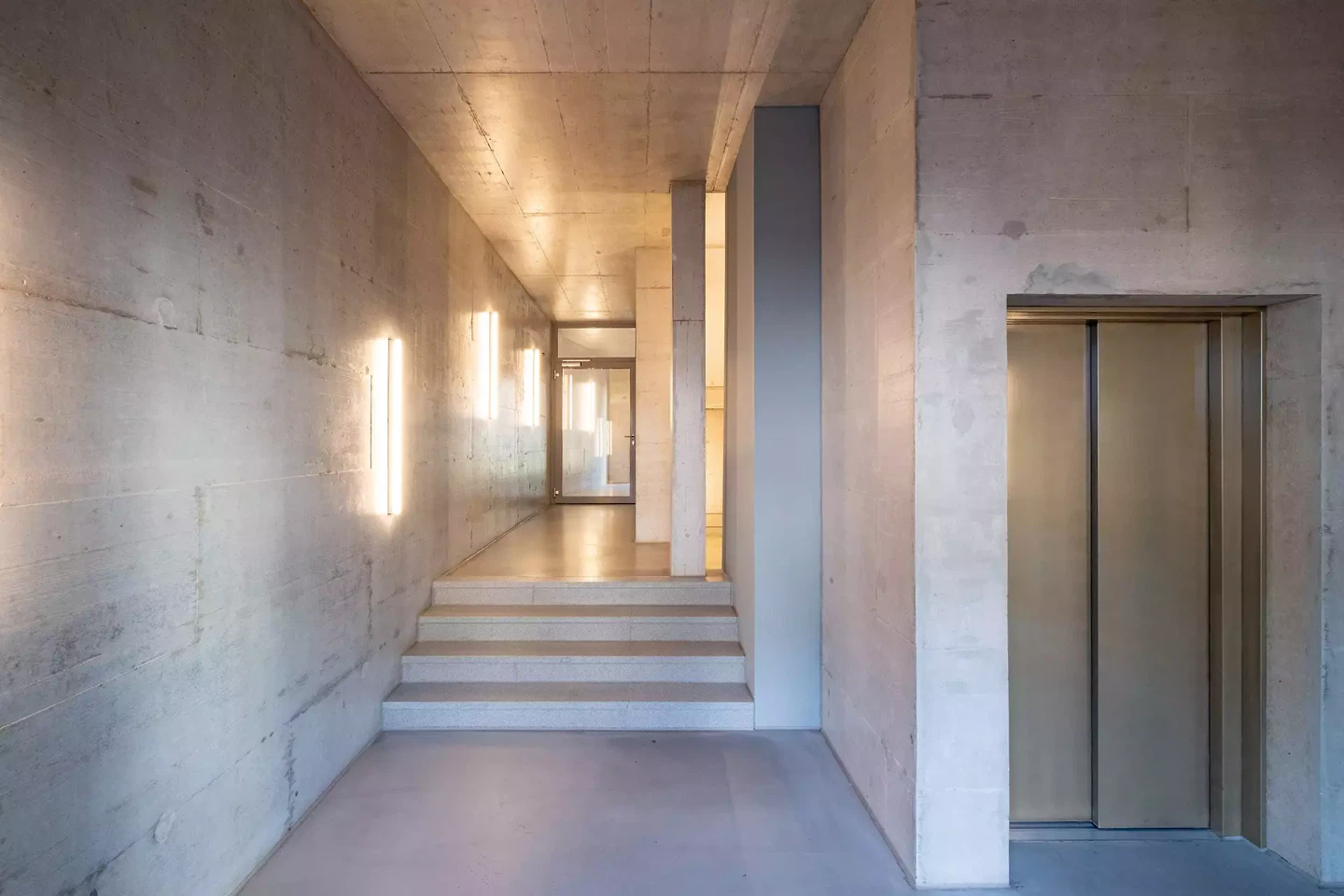 Outre les lieux de rencontre typiques à l'extérieur, ce sont surtout les espaces quotidiens – nos espaces de circulation à l'intérieur du bâtiment – qui constituent des lieux de rencontre. En leur accordant de la place et en les aménageant de manière réfléchie, on en fait des lieux de rencontre quotidiens qui contribuent à l'identification avec le cadre de vie et favorisent le bon fonctionnement de la communauté résidentielle. Ainsi, les entrées et les cages d'escalier ont été délibérément laissées spacieuses et leur aménagement oscille entre la rugosité du béton brut, combinée à une lasure argentée et à de fins détails de balustrade.
