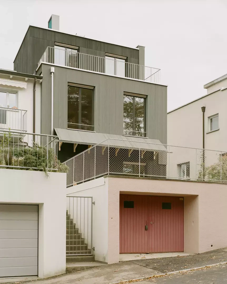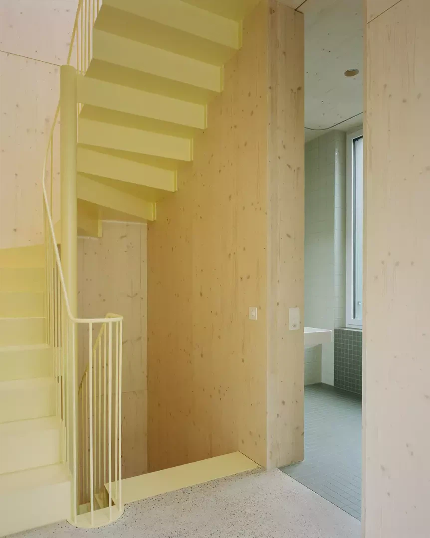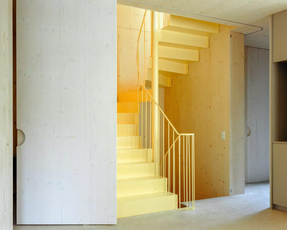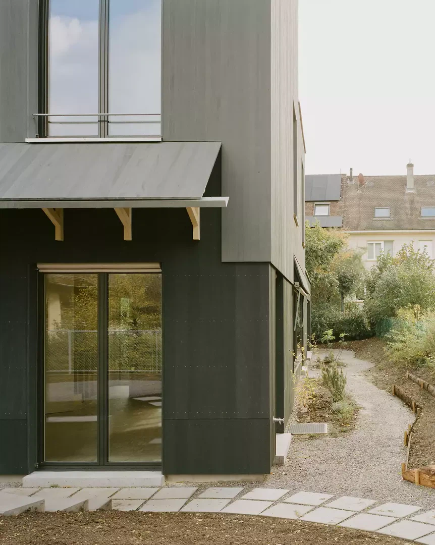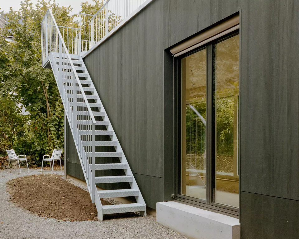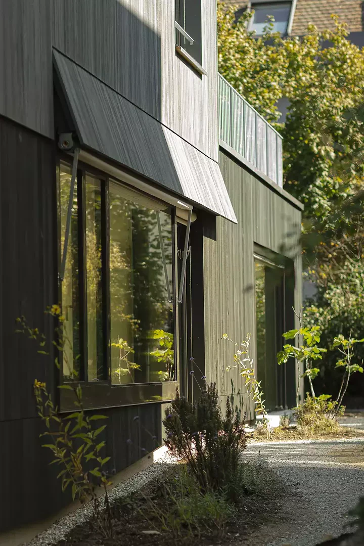 L’inspiration réside dans l’association d’une construction bois claire avec des expériences spatiales différenciées, ainsi que dans une interprétation contemporaine de la typologie traditionnelle de la maison en rangée. Les maîtres d’ouvrage et les futurs usagers ont été étroitement associés au processus de conception; leurs attentes en matière de flexibilité, de matérialité et d’usage ont été directement intégrées au projet. La façade est vert foncé, filigrane et presque papierisée; les auvents sont découpés, entaillés et relevés. Les largeurs des fenêtres et les détails sont uniformes à l’étage, ce qui confère une impression calme et homogène. La construction suit le principe du construire simplement: les surfaces du gros œuvre servent en grande partie de finition, les parois intérieures et les portes sont réalisées en panneaux trois plis, et les subdivisions peuvent être aménagées de manière flexible à l’aide de rideaux. Un escalier en acier élancé, mis en valeur par des accents colorés, relie les niveaux. Des solutions pragmatiques, comme la pompe à chaleur installée sur le toit et conçue comme une « cheminée » contemporaine visible, illustrent la manière d’aborder les enjeux énergétiques actuels. Le jardin est aménagé simplement, mais offre des usages variés ainsi qu’un lien direct avec la terrasse du premier étage.