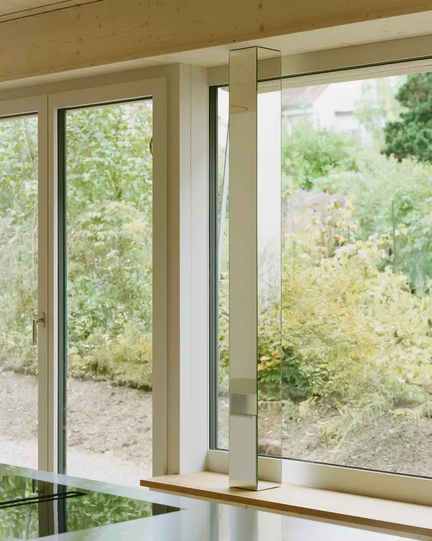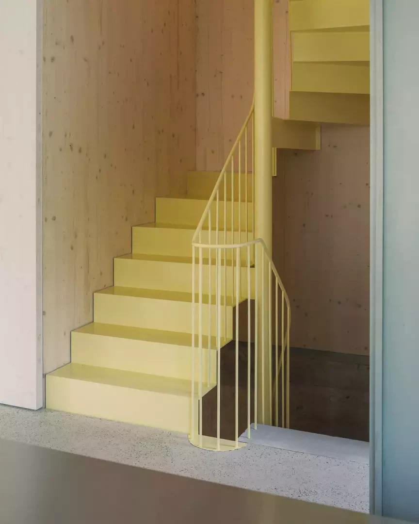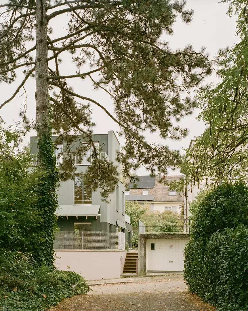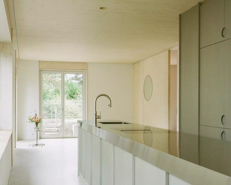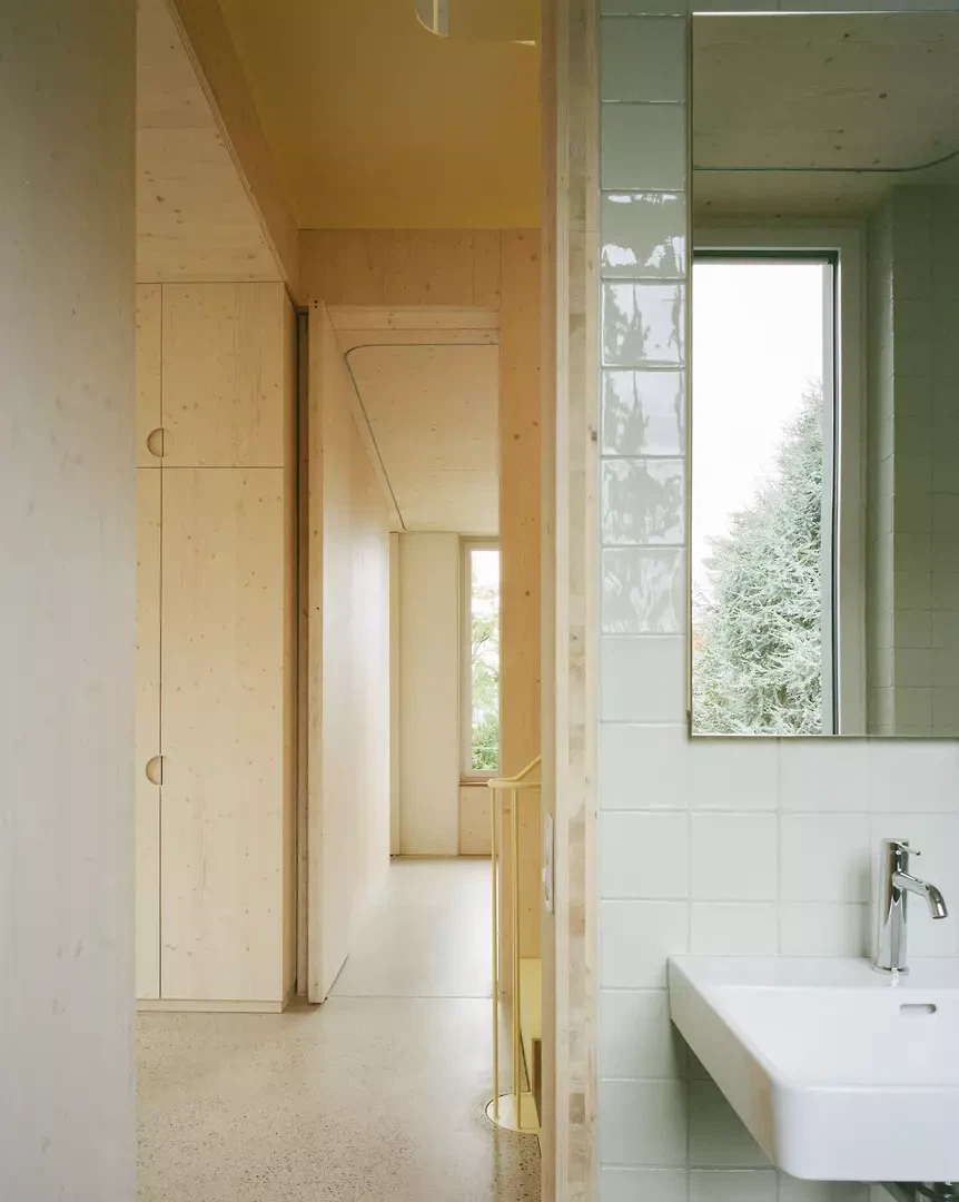 L’inspiration réside dans l’association d’une construction bois claire avec des expériences spatiales différenciées, ainsi que dans une interprétation contemporaine de la typologie traditionnelle de la maison en rangée. Les maîtres d’ouvrage et les futurs usagers ont été étroitement associés au processus de conception; leurs attentes en matière de flexibilité, de matérialité et d’usage ont été directement intégrées au projet. La façade est vert foncé, filigrane et presque papierisée; les auvents sont découpés, entaillés et relevés. Les largeurs des fenêtres et les détails sont uniformes à l’étage, ce qui confère une impression calme et homogène. La construction suit le principe du construire simplement: les surfaces du gros œuvre servent en grande partie de finition, les parois intérieures et les portes sont réalisées en panneaux trois plis, et les subdivisions peuvent être aménagées de manière flexible à l’aide de rideaux. Un escalier en acier élancé, mis en valeur par des accents colorés, relie les niveaux. Des solutions pragmatiques, comme la pompe à chaleur installée sur le toit et conçue comme une « cheminée » contemporaine visible, illustrent la manière d’aborder les enjeux énergétiques actuels. Le jardin est aménagé simplement, mais offre des usages variés ainsi qu’un lien direct avec la terrasse du premier étage.