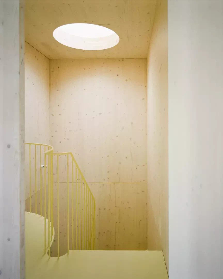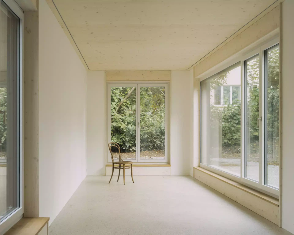 Le projet démontre une mise en œuvre cohérente de matériaux simples et de principes constructifs clairs, garantissant en même temps une haute qualité architecturale. L’étroite articulation entre conception et réalisation, assurées par une même entité, a permis une coordination optimale des matériaux, de la construction et du concept spatial. La construction en bois, en tant que matériau central, a contribué de manière déterminante à la réussite de l’ouvrage. Comparé aux réalisations précédentes de notre bureau, le projet s’inscrit dans une réflexion continue sur les parcelles étroites, la construction en bois et des concepts d’aménagement intérieur flexibles. Des premières esquisses jusqu’au bâtiment achevé, la conception de la façade et l’organisation spatiale ont été ajustées aux conditions du site, aux besoins des usagers et aux exigences techniques.