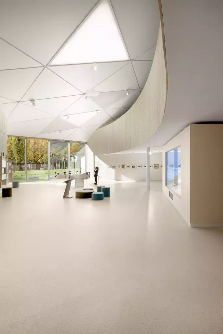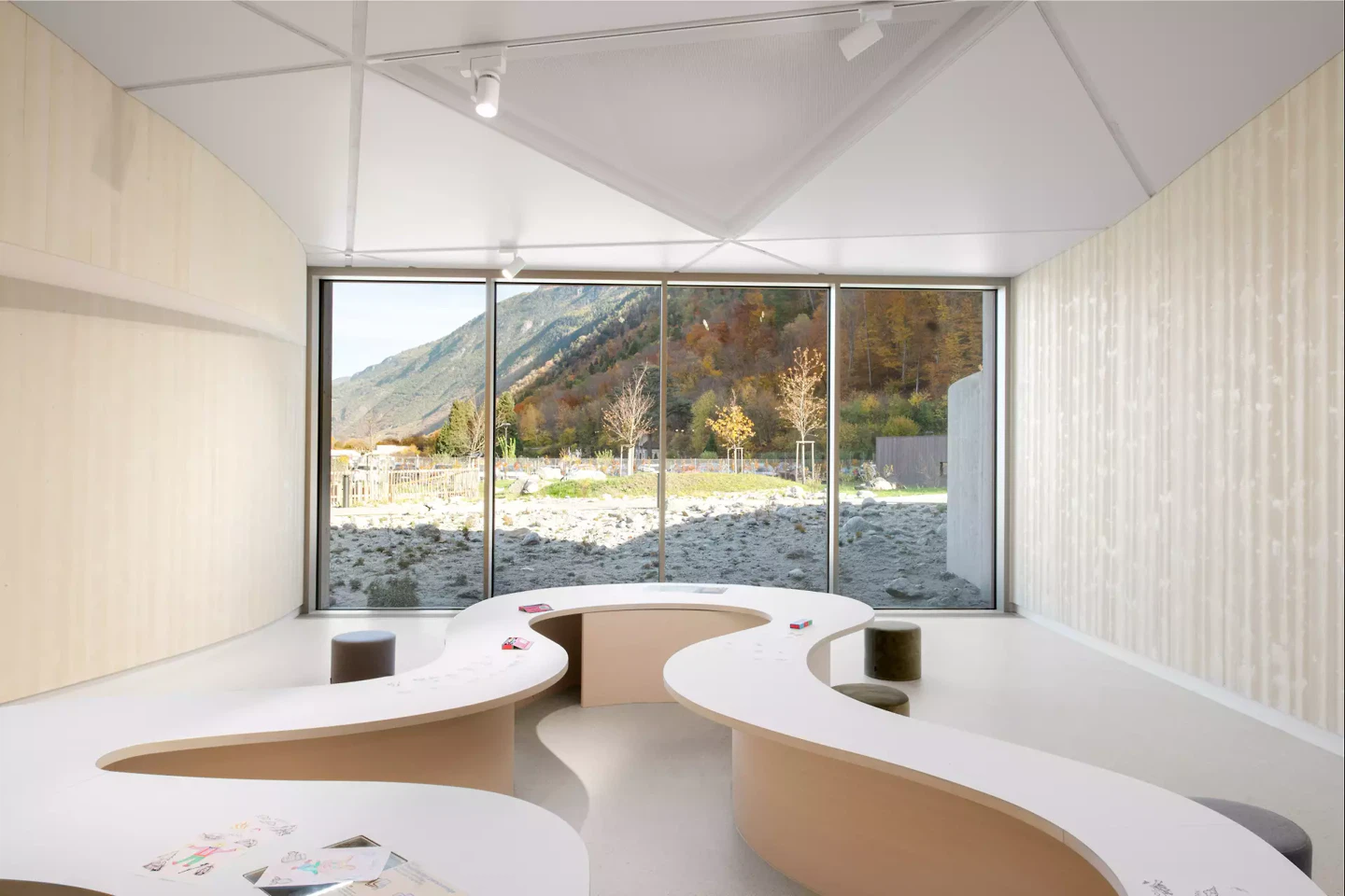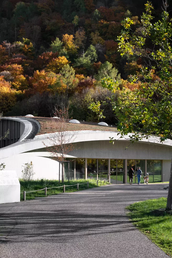 L’architecture du bâtiment principal se distingue par son inspiration biométrique: une empreinte stylisée de patte de chien visible depuis les aires, véritable symbole du projet. Cette forme organique abrite des espaces fluides et interconnectés, favorisant une circulation intuitive entre intérieur et extérieur. Coiffée d’une toiture géodésique végétalisée, la structure s’ancre subtilement dans le paysage, tout en incarnant une forte identité visuelle. L’aménagement paysager décline, autour du bâtiment, une mosaïque de milieux naturels alpins, évoquant l’univers du légendaire chien Barry. Quatre biotopes – vergers, forêts d’altitude, végétation morainique et boisements de plaine – offrent une expérience immersive, sensible et pédagogique.