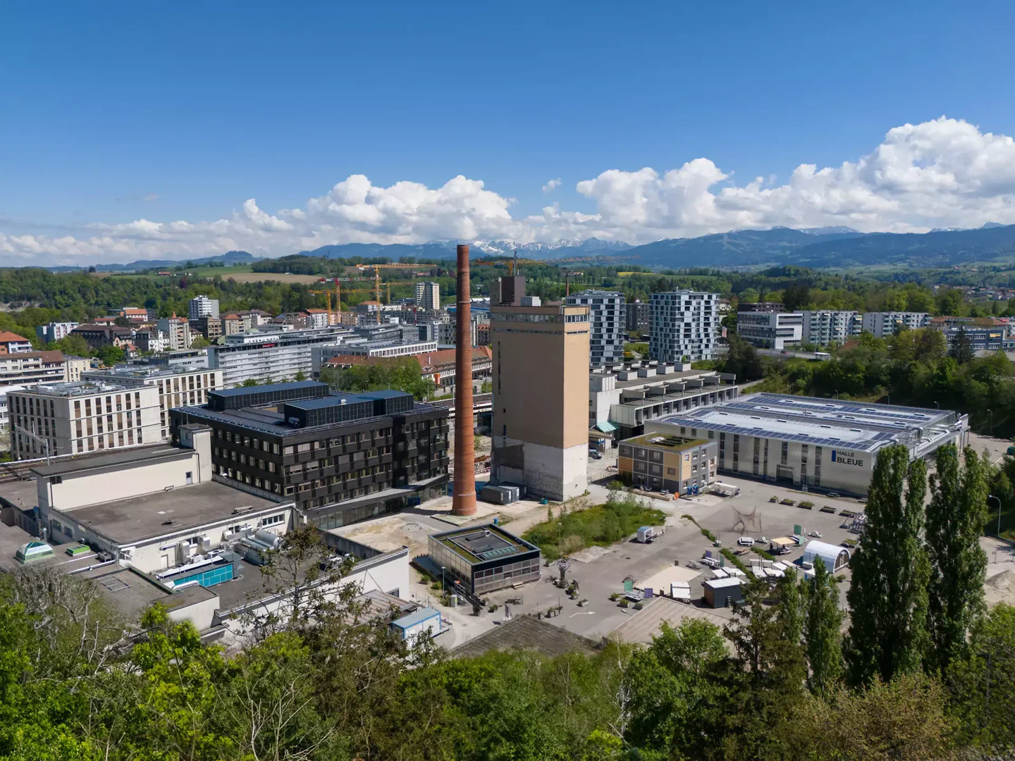 L’implantation de bluefactory sur le site abandonné de la brasserie Cardinal redonne vie à un lieu historique cher à la ville de Fribourg. Le quartier se pare alors d’une identité innovante et mixte reflétée par la matérialisation du nouveau bâtiment B. Il récupère ainsi son importance pour le développement économique de la ville et du canton. En s’articulant autour de la cheminée et du silo existants, le projet valorise le patrimoine industriel tout en renforçant la centralité de l’espace public.