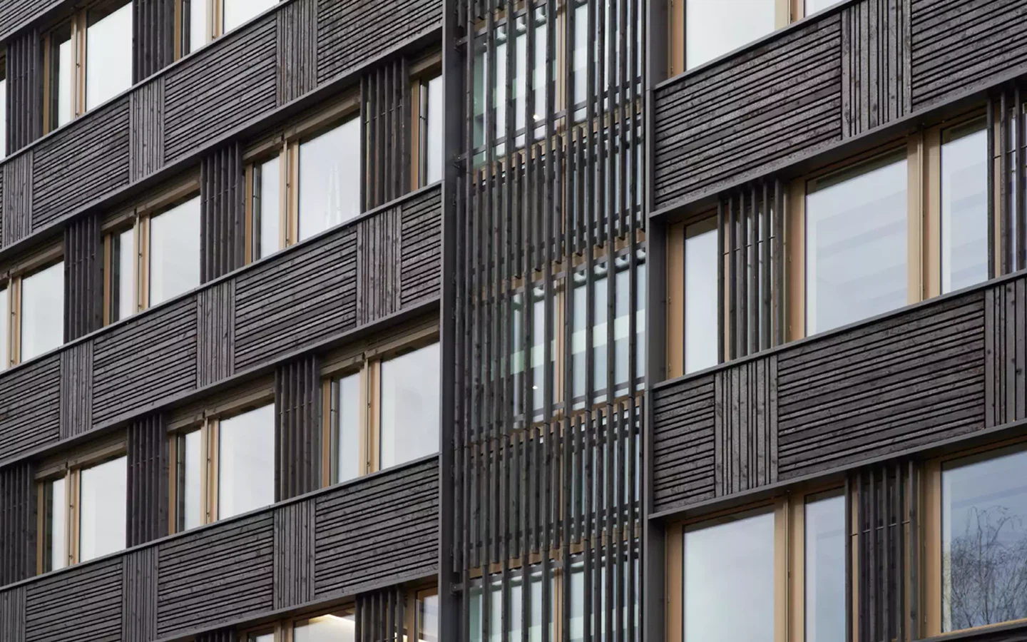 Le bois brûlé contraste fortement avec la façade patrimoniale du bâtiment A et ainsi la souligne. Stabilisé dans le temps, ce matériau ne demande aucun entretien. L’apparence du bois brûlé souligne l’expression forte des horizontales en façade. Son relief, sa mise en œuvre et ses nuances de couleurs apportent une vibration à cette façade à caractère industriel rendant le bâtiment moins imposant et plus tactile. L’intégration urbaine, la mixité identitaire, la diversité des animations et l’originalité des infrastructures font de bluefactory un lieu d’innovation vivant. Le quartier accueille entreprises innovantes, institutions académiques, artisans, restaurants, jardins partagés et acteurs culturels, créant un tissu vivant et inclusif. En tant que premier bâtiment pérenne du site, le bâtiment B incarne toutes ces valeurs et permet à bluefactory de s’implanter solidement dans le paysage fribourgeois.