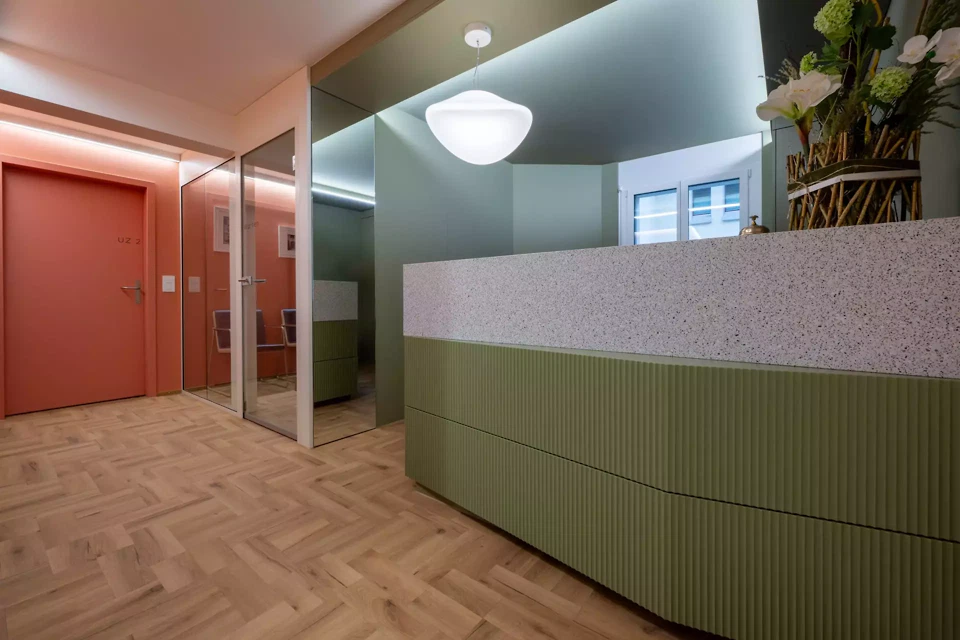 Le concept de projet ne conçoit pas le cabinet comme une simple succession fonctionnelle de salles de traitement, mais comme un paysage spatial cohérent. Les couleurs, les matériaux et la lumière y jouent des rôles d’orientation et des fonctions psychologiques :