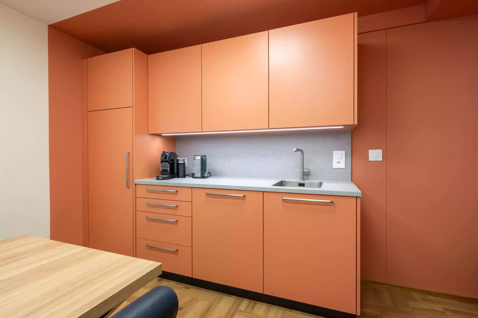 L’un des plus grands défis de ce projet était le délai. La mandante devait quitter le cabinet existant avant Noël 2025. Trouver des locaux adaptés dans un laps de temps aussi court s’est avéré difficile. À partir du printemps 2025, de nombreux objets ont été visités, beaucoup d’entre eux étant toutefois trop petits ou trop grands. Par la suite, des relevés de mesures, des études d’aménagement et des estimations de coûts ont été réalisés pour différents objets. Lorsque des locaux appropriés ont finalement été trouvés, le calendrier était déjà très avancé, si bien que le début de la planification n’a pu avoir lieu qu’en septembre 2025. Cela représentait également un défi considérable pour les entreprises impliquées, celles-ci étant à ce moment-là déjà souvent complètes jusqu’à la fin de l’année. Grâce à notre réseau bien établi, il a néanmoins été possible de concilier une planification «en vol» avec le début des travaux. Le service des constructions de Stans a accompagné le projet de manière constructive dès le départ, ce qui a permis de maintenir une demande de permis de construire volontairement légère. Grâce à la confiance de toutes les parties prenantes et à une mandante qui a soutenu dès le début le concept chromatique audacieux, la transformation d’un ancien bureau – y compris l’adaptation d’un mur porteur – a pu être réalisée avec succès en l’espace de sept semaines.