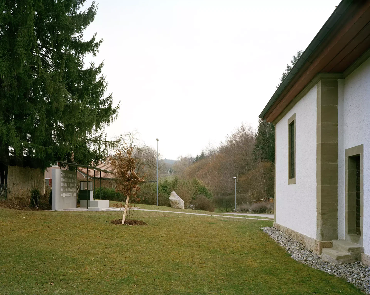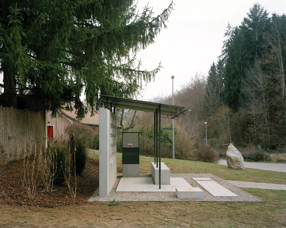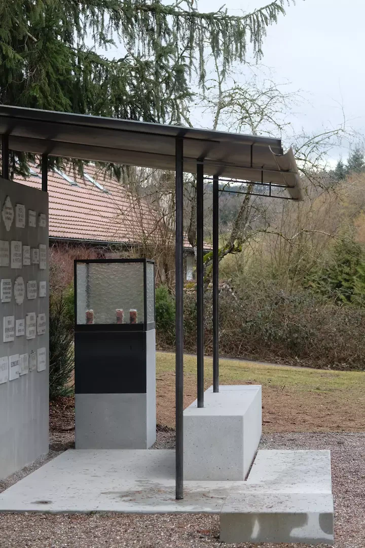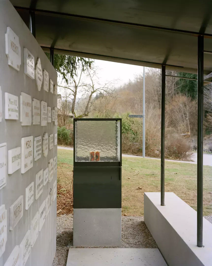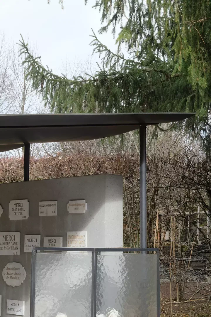 Le Candle Pavilion repose sur une économie de moyens assumée: peu d’éléments, mais chacun essentiel, mis en œuvre avec rigueur et précision. Une composition simple d’éléments linéaires, ponctuels ou surfaciques: un mur, une assise, une vitrine et une toiture. Le pavillon prend la forme d’une intervention paysagère, structurée par des éléments minéraux qui émergent du sol et en définissent sa présence. La dalle en béton établit un périmètre et délimite les différents éléments qui composent l’ensemble. Elle contient et ordonne les «objets» qui participent à la composition du projet. Un mur en béton se dresse pour accueillir les ex-votos et forme un dos pour le pavillon, offrant une surface à la fois protectrice et capable de capter la lumière. À proximité, une vitrine s’insère avec précision dans ce dispositif minéral: élément plus délicat, elle instaure un dialogue entre transparence et masse, entre métal et minéral. Une assise monolithique complète l’ensemble, invitant à la pause et à la contemplation.