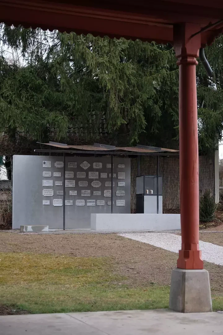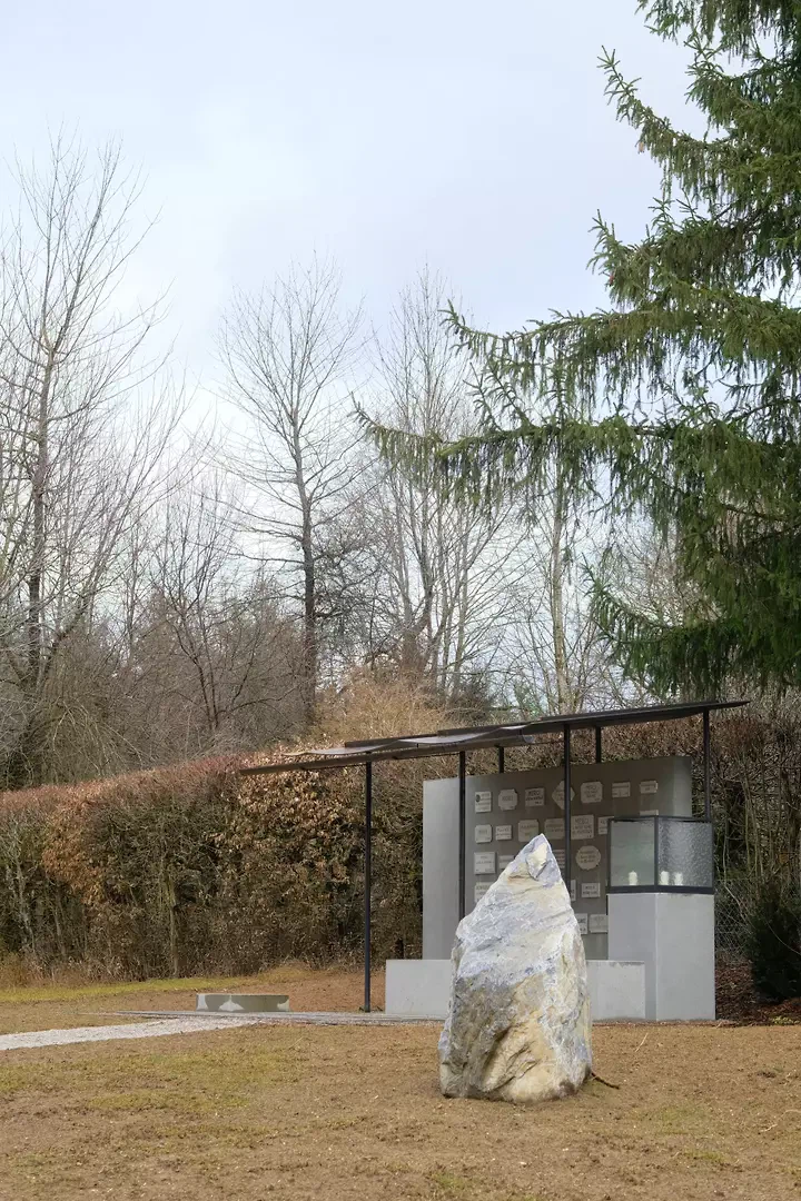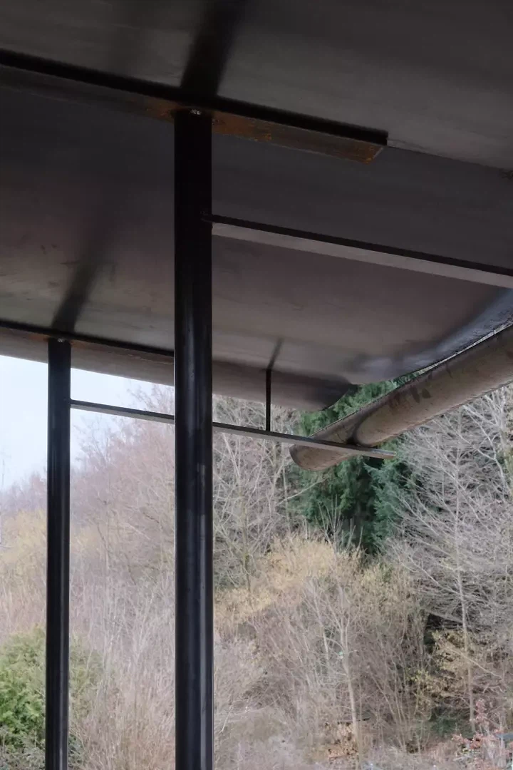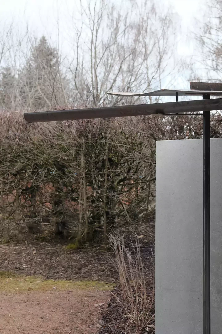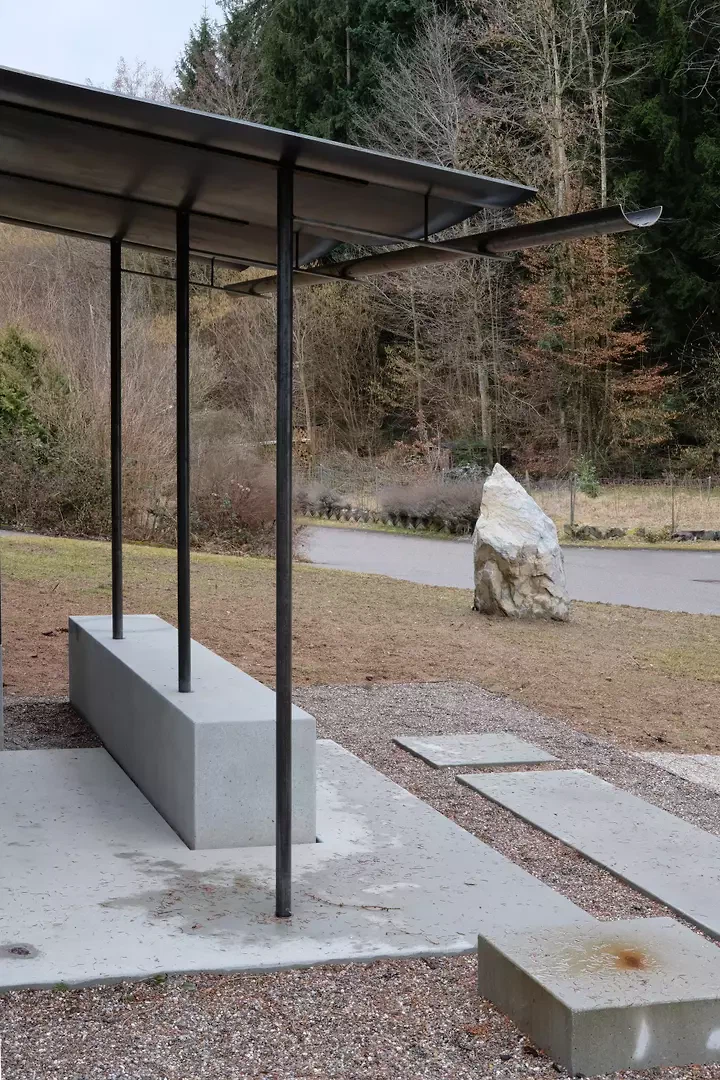 La toiture fine en acier couvre partiellement l’ensemble et contient les différents éléments. Elle repose ponctuellement sur les éléments minéraux qui composent le projet. Constituée de poteaux métalliques élancés, elle prend appui avec retenue sur ces pièces, révélant par contraste leur poids et leur inertie. Chaque élément est dessiné spécifiquement et l’architecture naît de la précision des assemblages et de la lisibilité des rencontres entre les différents éléments. Le temps devient un acteur du projet: la patine, les traces d’usage et les variations de teinte inscrivent progressivement l’ouvrage dans son environnement. L’architecture et la nature y interagissent selon la lumière et les saisons.