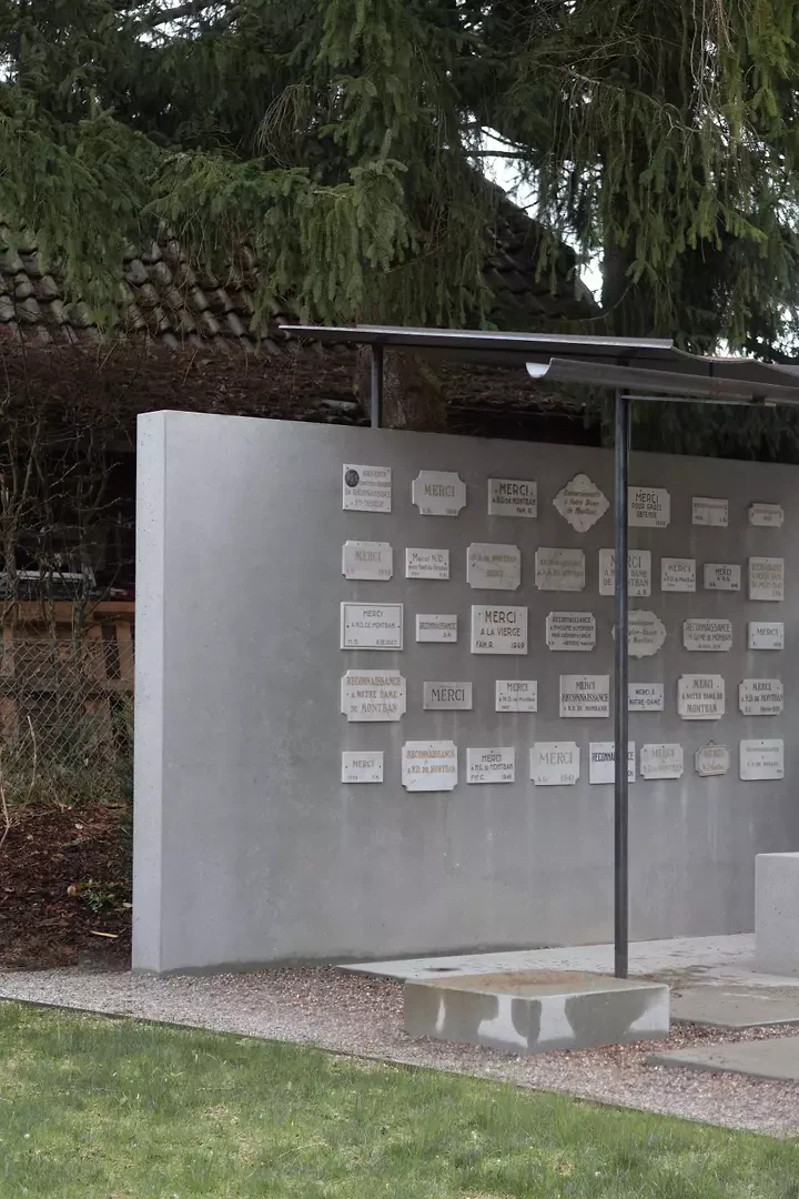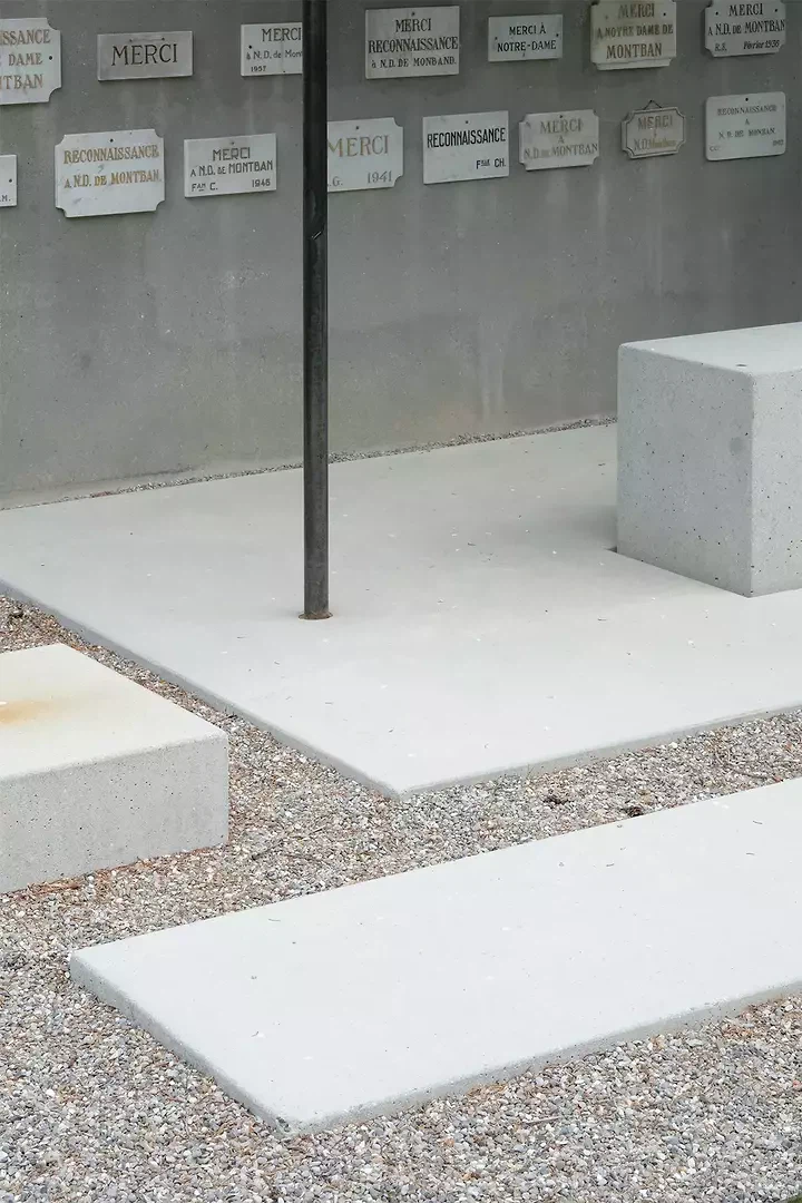 Le Candle Pavilion repose sur une économie de moyens assumée: peu d’éléments, mais chacun essentiel, mis en œuvre avec rigueur et précision. Une composition simple d’éléments linéaires, ponctuels ou surfaciques: un mur, une assise, une vitrine et une toiture. Le pavillon prend la forme d’une intervention paysagère, structurée par des éléments minéraux qui émergent du sol et en définissent sa présence. La dalle en béton établit un périmètre et délimite les différents éléments qui composent l’ensemble. Elle contient et ordonne les «objets» qui participent à la composition du projet. Un mur en béton se dresse pour accueillir les ex-votos et forme un dos pour le pavillon, offrant une surface à la fois protectrice et capable de capter la lumière. À proximité, une vitrine s’insère avec précision dans ce dispositif minéral: élément plus délicat, elle instaure un dialogue entre transparence et masse, entre métal et minéral. Une assise monolithique complète l’ensemble, invitant à la pause et à la contemplation.