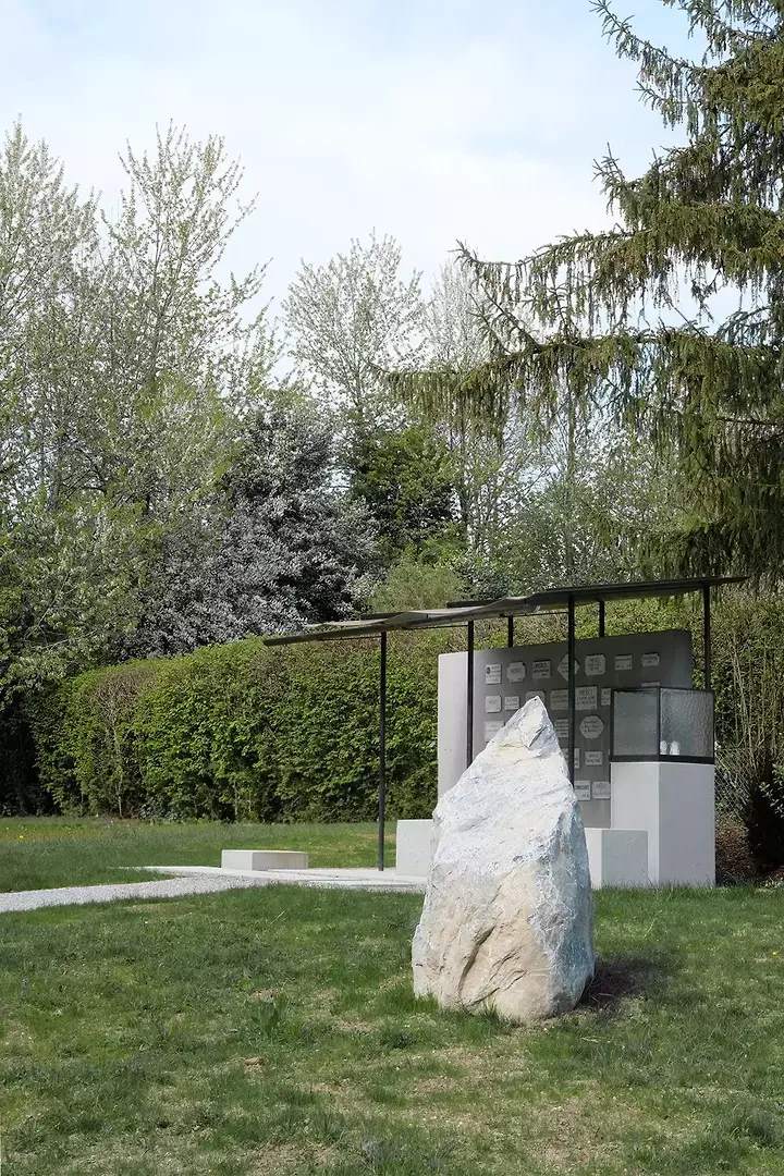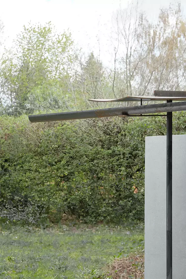 La toiture fine en acier couvre partiellement l’ensemble et contient les différents éléments. Elle repose ponctuellement sur les éléments minéraux qui composent le projet. Constituée de poteaux métalliques élancés, elle prend appui avec retenue sur ces pièces, révélant par contraste leur poids et leur inertie. Chaque élément est dessiné spécifiquement et l’architecture naît de la précision des assemblages et de la lisibilité des rencontres entre les différents éléments. Le temps devient un acteur du projet: la patine, les traces d’usage et les variations de teinte inscrivent progressivement l’ouvrage dans son environnement. L’architecture et la nature y interagissent selon la lumière et les saisons.