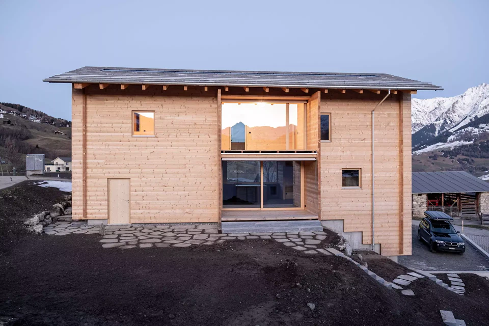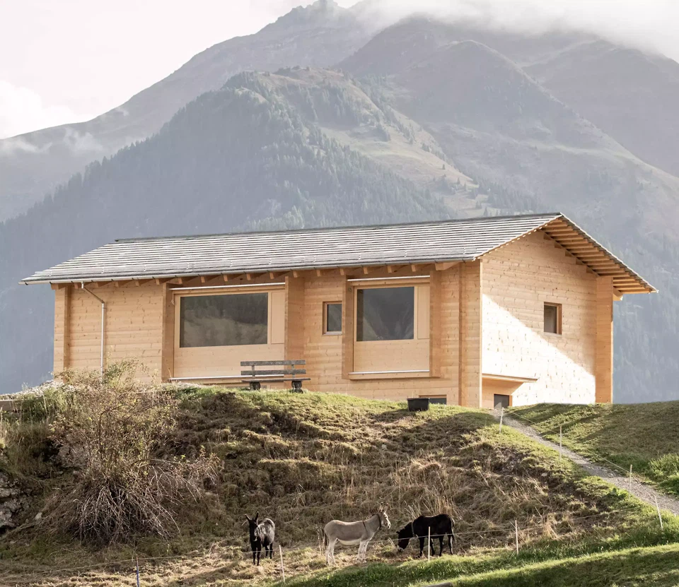 Le projet naît de l’initiative d’une jeune famille amie souhaitant une maison qui s’inscrive naturellement dans le tissu villageois tout en affirmant une identité propre. Il se veut également une contribution à une manière collective de poursuivre la construction au sein du village, comme partie intégrante d’un tissu social qui renforce le voisinage et perpétue le savoir du bois traditionnel – ses principes constructifs, ses techniques artisanales et ses logiques matérielles. Dans ce contexte, se pose la question de la légitimité contemporaine d’une nouvelle maison individuelle en milieu alpin. La réponse réside dans une posture architecturale claire: «Construire uniquement là où la construction, le matériau et la durée de vie offrent une perspective à long terme.» La construction en madriers est pensée dans des horizons temporels qui dépassent largement le présent, comme un système robuste capable de durer sur plusieurs générations et, dans le cas extrême, d’être démonté puis réemployé dans ses composants. Face au fait que les constructions existantes de ce type dans des villages comme Vella sont difficilement accessibles financièrement pour les habitants, la nouvelle construction devient ainsi une alternative assumée et responsable.