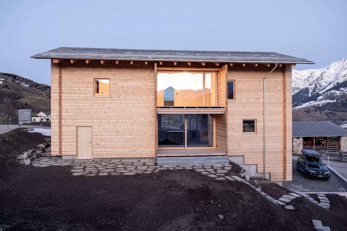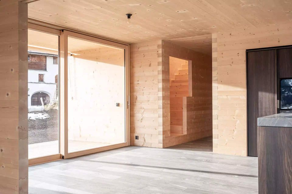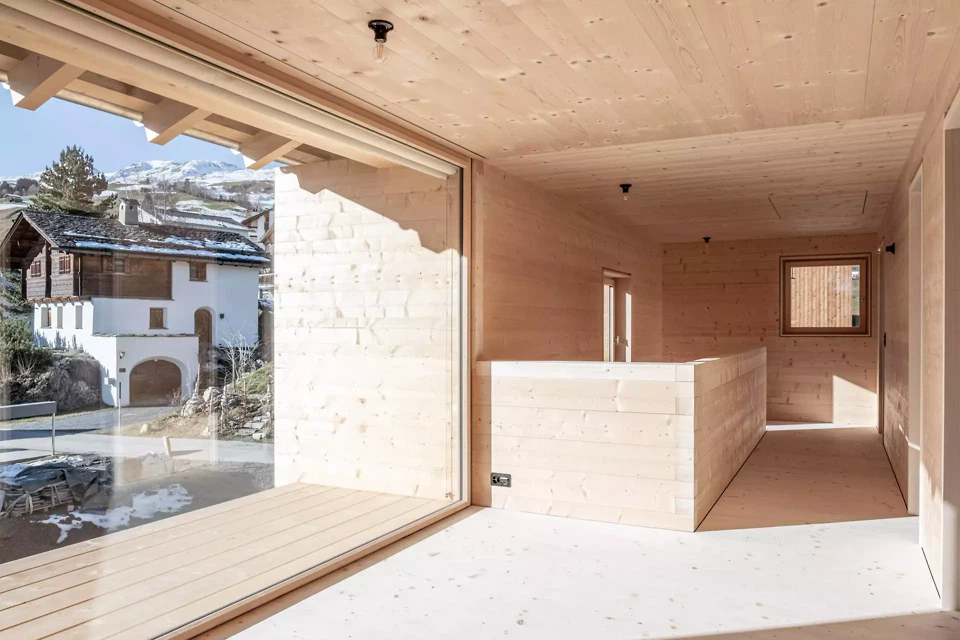 L’implantation suit la logique urbaine locale. Un volume allongé, parallèle à la grange-étable voisine, reprend les structures existantes et en développe l’orientation. Celle-ci définit des cadrages visuels précis vers le paysage et le village, tout en organisant la structure intérieure. Au centre se trouve la construction comme principe générateur d’espace. La construction en madriers n’est pas considérée comme une simple technique, mais comme un système de conception structurant l’espace. Les couches de bois assemblées avec précision, leurs emboîtements dans les angles et la logique de leurs connexions produisent une structure dense et continue à partir de laquelle les espaces se développent. Des cellules spatiales porteuses, plus compactes et dédiées aux fonctions de service, structurent la maison et tendent entre elles une succession graduée d’espaces ouverts et baignés de lumière (principe positif/négatif). De larges vitrages apparaissent comme des extensions spatiales, s’ouvrant sur le paysage et tissant des liens entre intérieur et extérieur. Les surfaces en bois finement travaillées, réalisées selon une technique traditionnelle d’origine japonaise consistant à retirer à la lame de fines couches de bois semblables à du papier, renforcent la qualité lumineuse et la présence sensorielle du matériau dans l’espace. La continuité spatiale est accentuée par des relations visuelles et des transitions ciblées, créant une séquence de situations permettant différentes formes de cohabitation – du retrait à des espaces partagés.