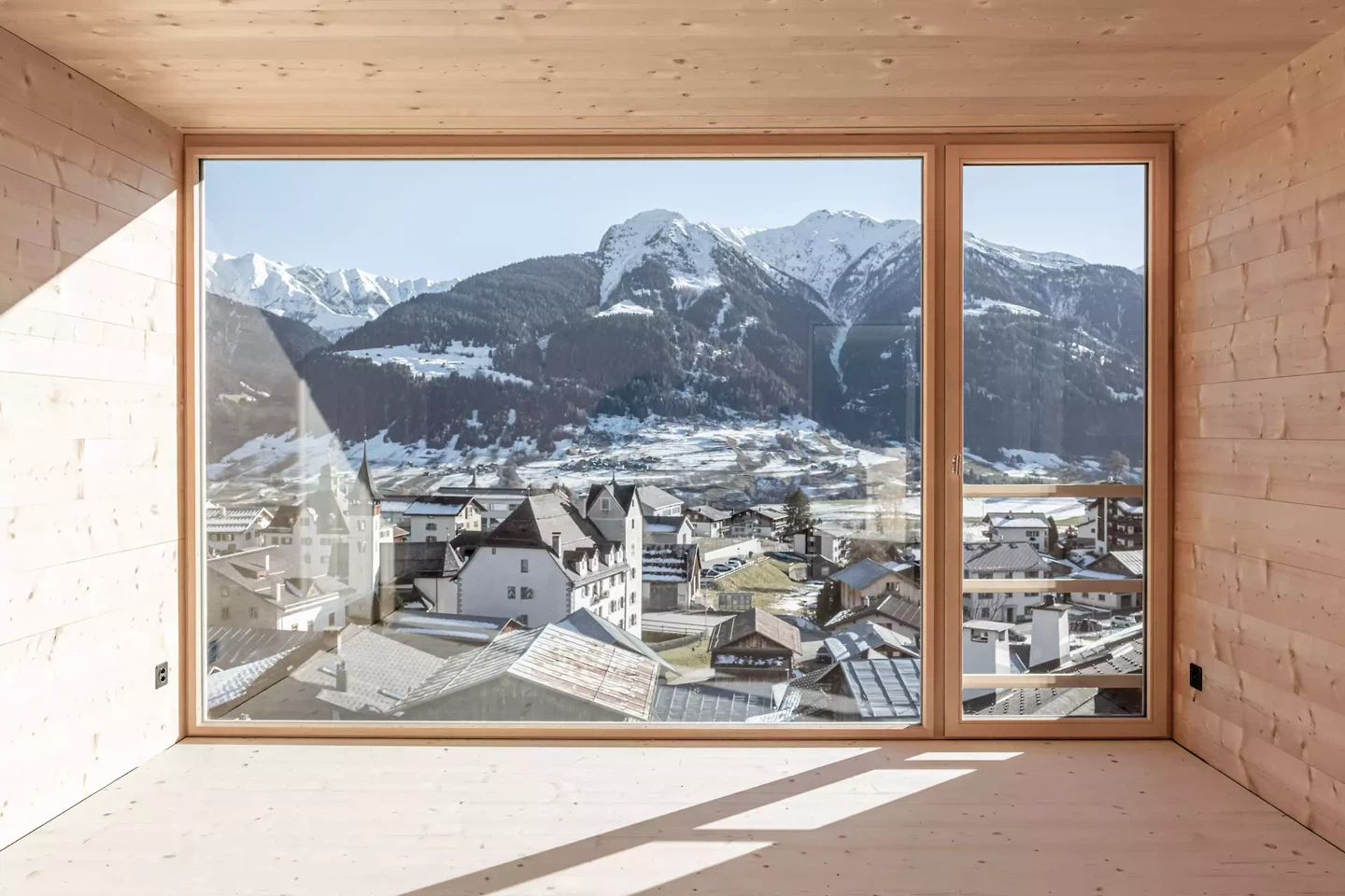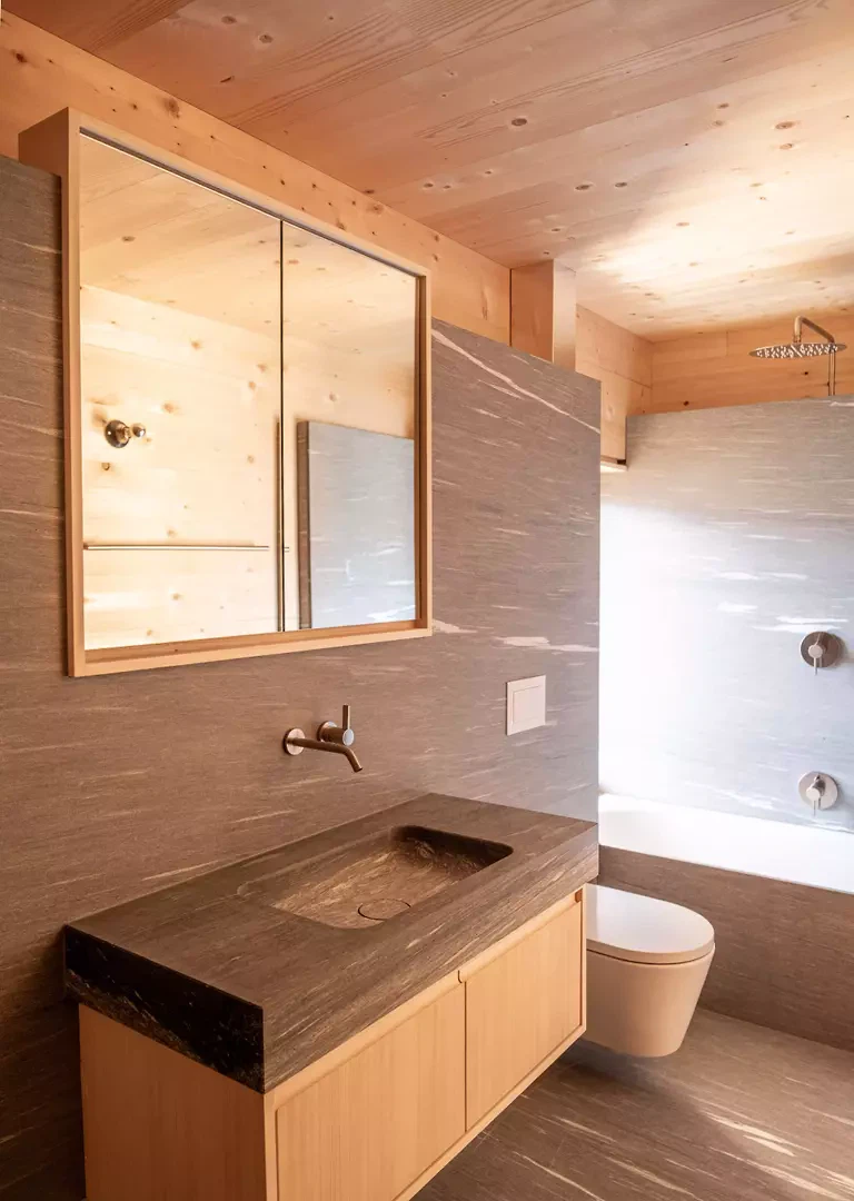 La durabilité découle directement du matériau et de la construction. Le bois comme matériau principal, associé à une isolation en cellulose ainsi qu’à d’autres matériaux naturels tels que la laine de mouton et le liège, permet une structure ouverte à la diffusion, économe en ressources et durable, sans membranes supplémentaires. Le processus de construction lui-même rend l’architecture perceptible : les espaces naissent de la structure et développent leur atmosphère à partir de la logique de l’assemblage, de la lumière et des proportions. Parallèlement, le projet renforce l’artisanat local et s’inscrit dans la culture constructive régionale. La maison en madriers se comprend comme une continuation de la tradition bois locale, issue de la logique du lieu, de la construction et du matériau, ainsi que d’une posture qui ne considère la construction en milieu alpin comme légitime que si elle est écologiquement et socialement soutenable à long terme.