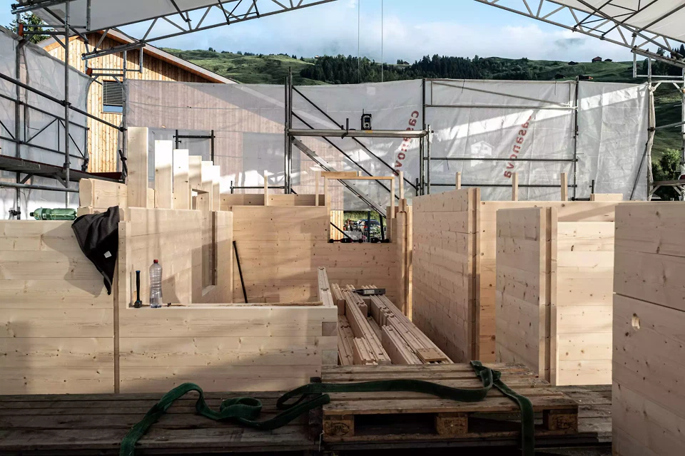 Les exigences constructives du bois déterminent le projet dès le départ. Le comportement de tassement du bois – pouvant atteindre plusieurs centimètres par étage en raison du retrait des différentes couches de madriers – est intégré à la conception et pris en compte dans tous les détails d’assemblage. Une toiture lourde en quartzite de Vals complète ce système en apportant la charge nécessaire pour assurer un tassement homogène. Au centre demeure la structure en bois elle-même, composée de plus d’un millier de pièces fabriquées avec précision, préfabriquées en atelier à l’aide de procédés numériques, puis usinées avec rainures, languettes, feuillures, perçages et évidements, avant d’être assemblées sur place en quatre semaines par des charpentiers.