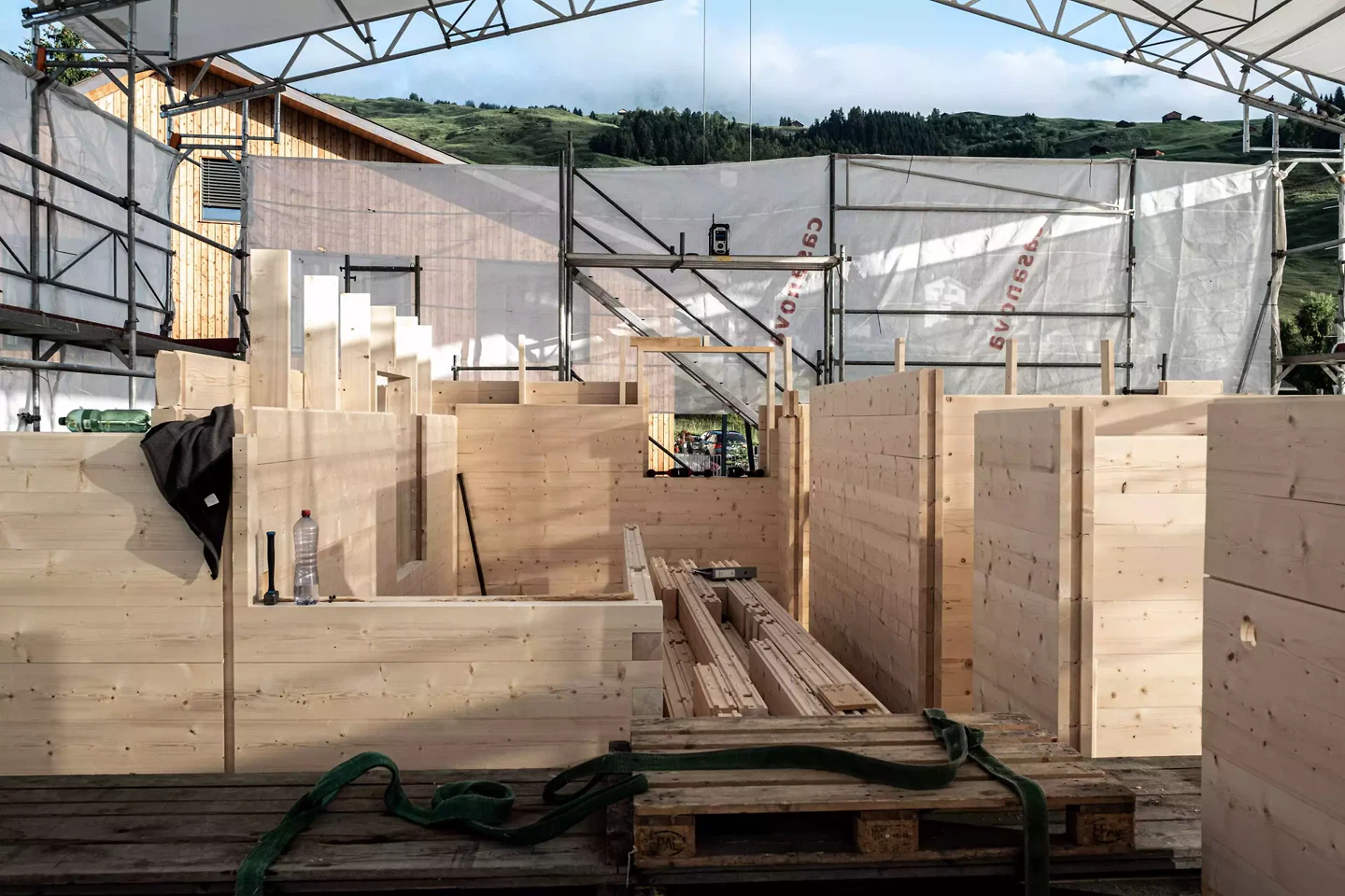 L’élément central est le bois lui-même, assemblé avec précision dans une construction en madriers. Ce n’est pas tant un produit isolé qui est déterminant, mais l’interaction entre le matériau, l’assemblage artisanal et la préfabrication assistée par ordinateur.