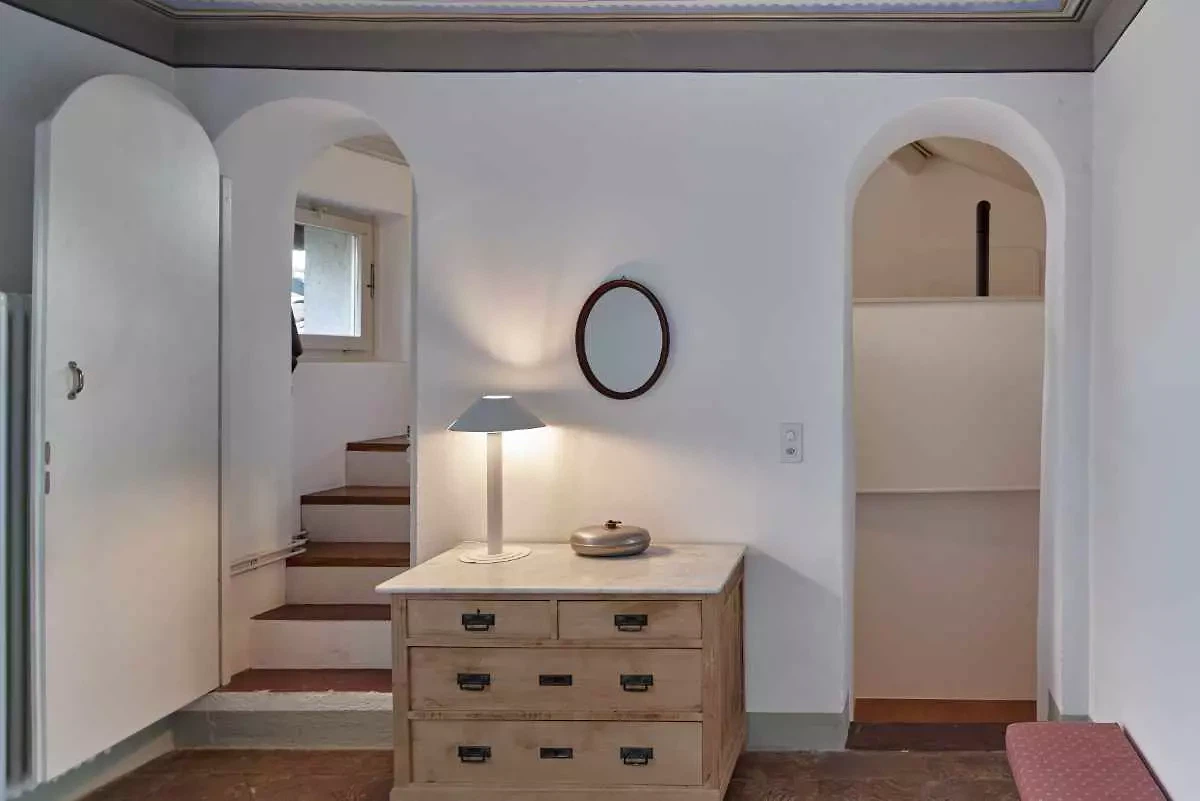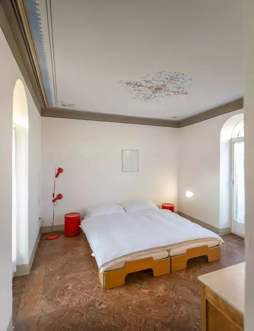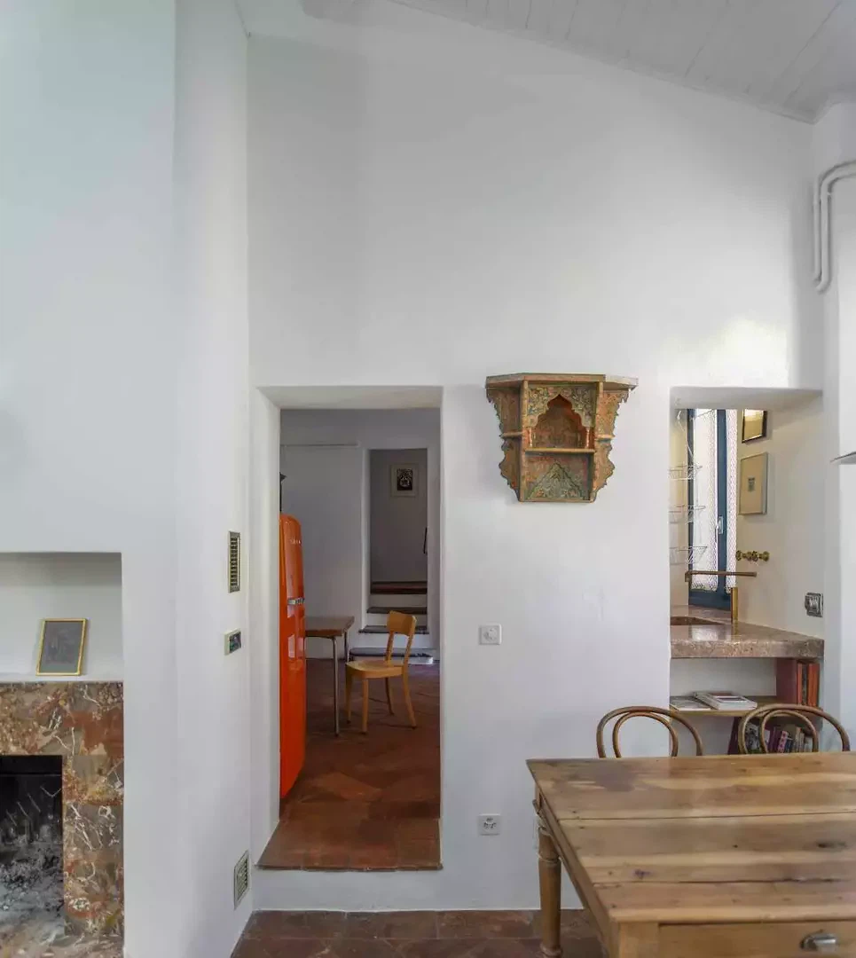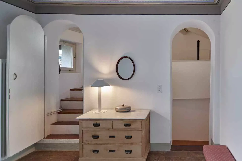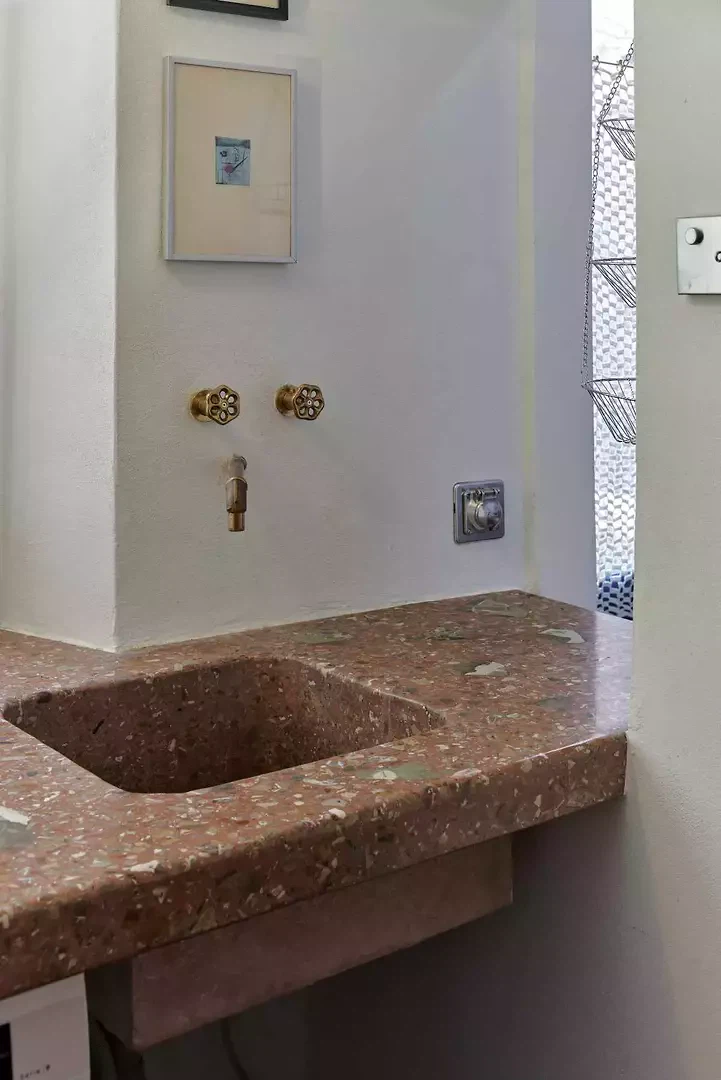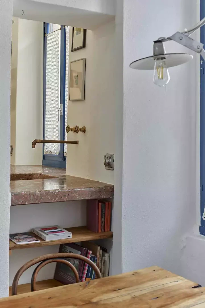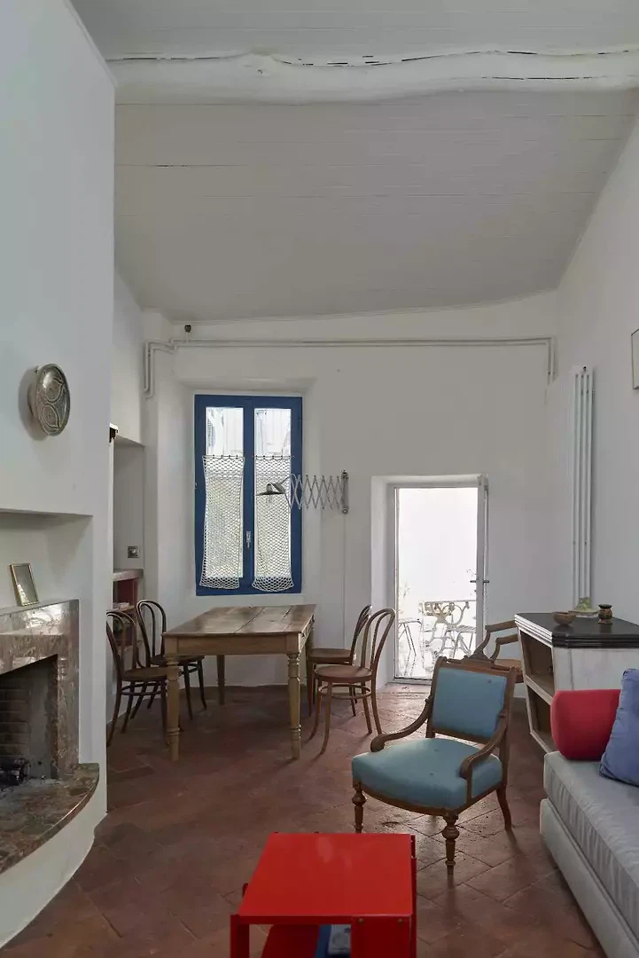 La fresque florale au plafond présentait des signes de détachement et a été restaurée par une consolidation de la couche porteuse par le haut ; la décoration picturale a ensuite été restaurée également. L'escalier situé au-dessus de la cheminée en marbre d'Arzo dans le salon était équipé d'une rampe non conforme aux normes et a été sécurisé par la construction d'un nouveau mur affleurant la maçonnerie existante. L'escalier et la cheminée ont ainsi été réunis en un seul volume blanc. La palette de couleurs d'origine (murs et plafonds blancs, encadrements de fenêtres bleus, carreaux blancs et bleus et peinture bleue dans la salle de bains) a été conservée et restaurée. Le sol d'origine, composé de vieux carreaux de terre cuite marbrés, a été conservé, restauré et traité avec un produit protecteur. La cuisine a été réaménagée avec l'installation d'un nouveau plan de travail en marbre Arzo, spécialement conçu pour cette pièce. Une nouvelle table de cuisine a été conçue avec une grande fleur en marbre encastrée dans le plan de travail en marbre.