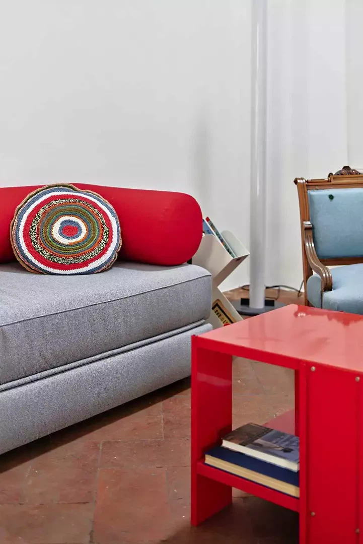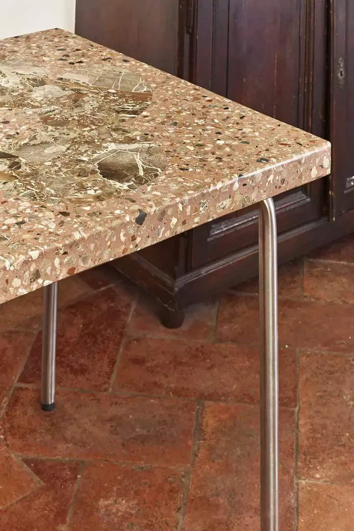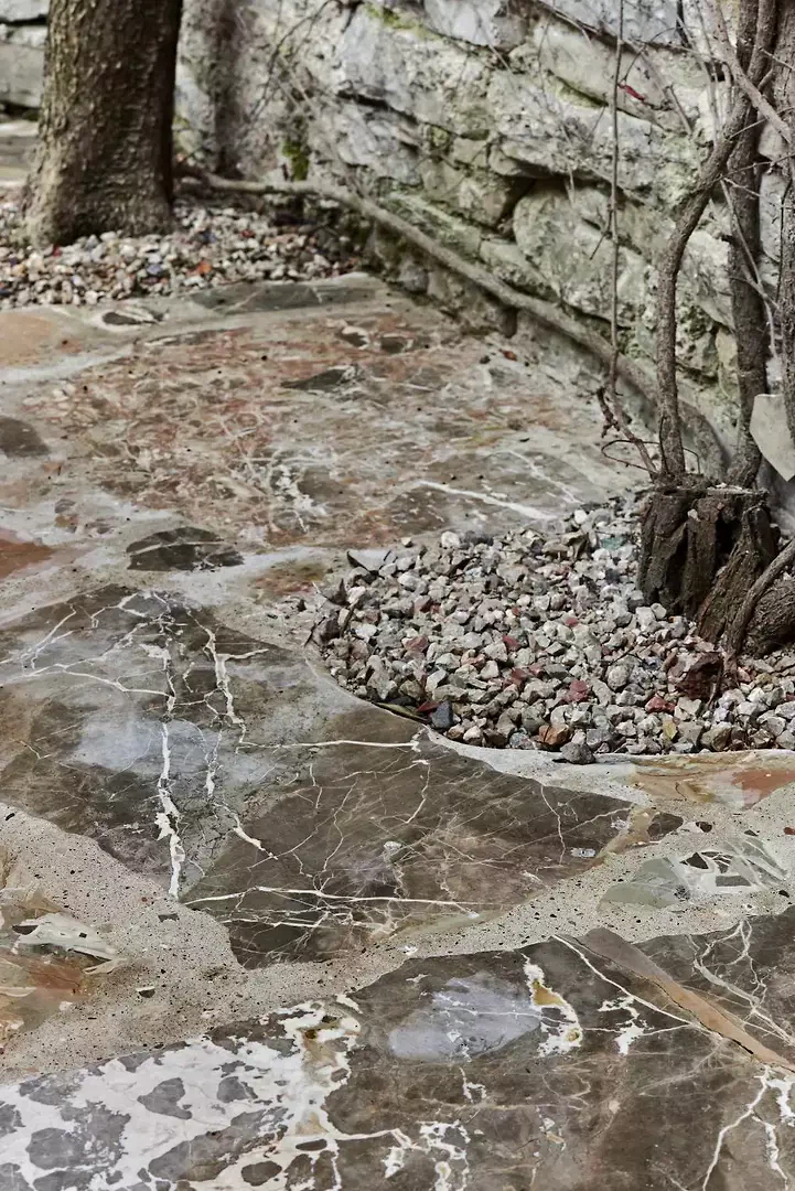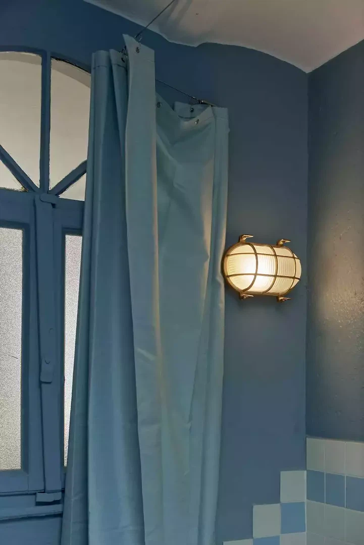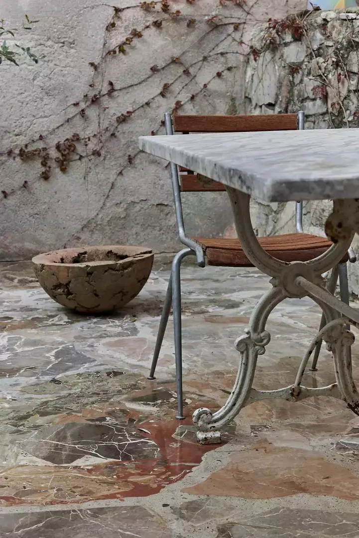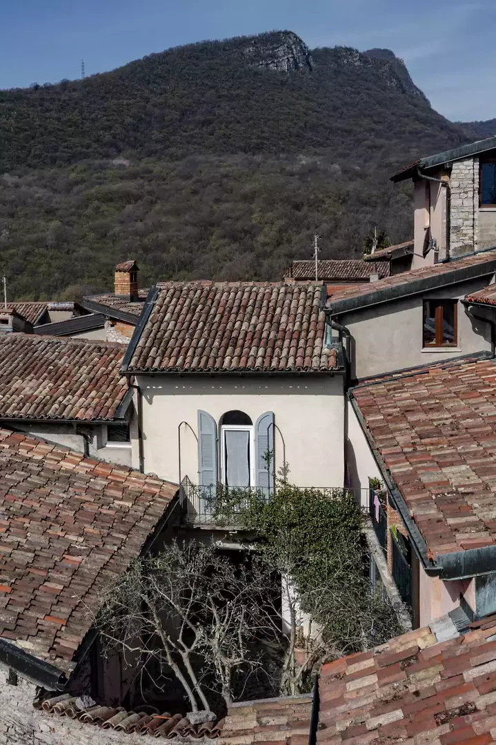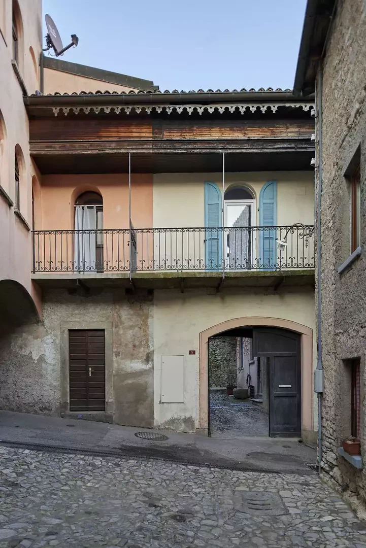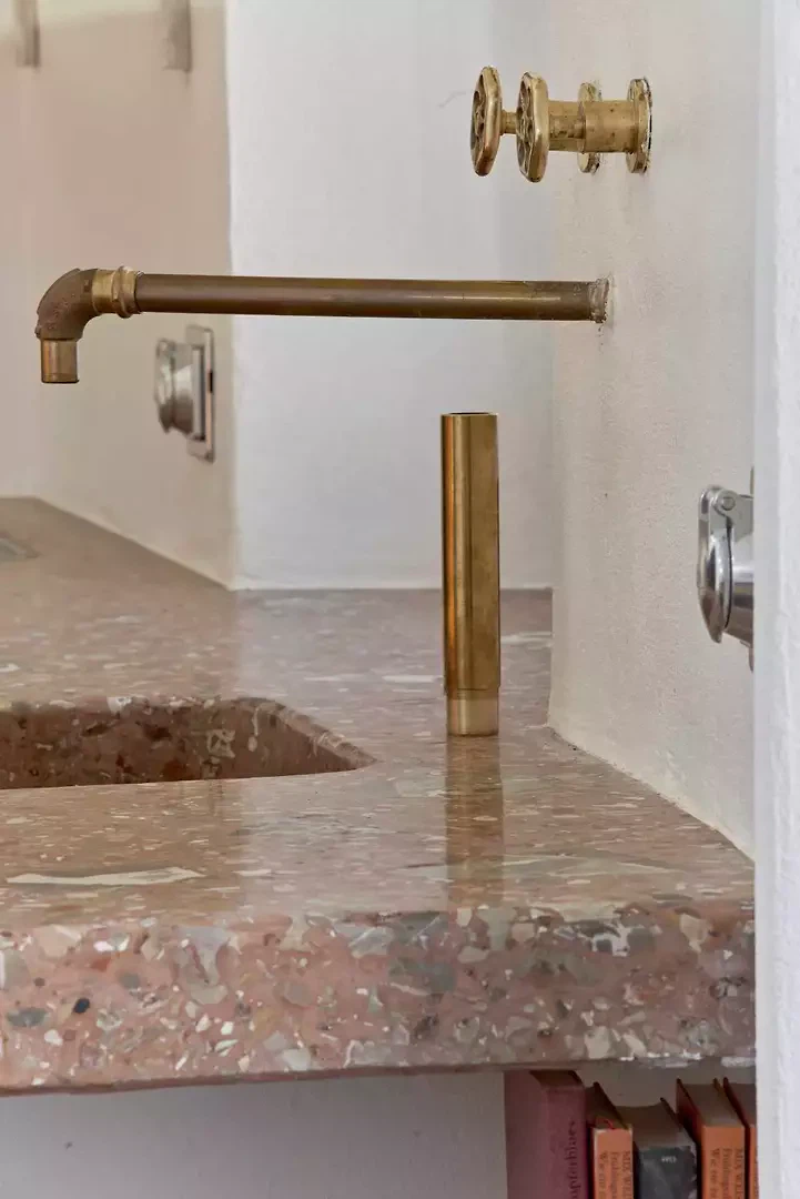 La fresque florale au plafond présentait des signes de détachement et a été restaurée par une consolidation de la couche porteuse par le haut ; la décoration picturale a ensuite été restaurée également. L'escalier situé au-dessus de la cheminée en marbre d'Arzo dans le salon était équipé d'une rampe non conforme aux normes et a été sécurisé par la construction d'un nouveau mur affleurant la maçonnerie existante. L'escalier et la cheminée ont ainsi été réunis en un seul volume blanc. La palette de couleurs d'origine (murs et plafonds blancs, encadrements de fenêtres bleus, carreaux blancs et bleus et peinture bleue dans la salle de bains) a été conservée et restaurée. Le sol d'origine, composé de vieux carreaux de terre cuite marbrés, a été conservé, restauré et traité avec un produit protecteur. La cuisine a été réaménagée avec l'installation d'un nouveau plan de travail en marbre Arzo, spécialement conçu pour cette pièce. Une nouvelle table de cuisine a été conçue avec une grande fleur en marbre encastrée dans le plan de travail en marbre.