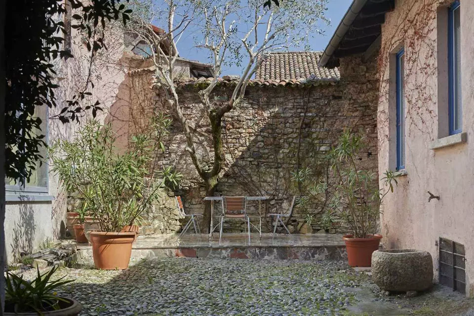 Des sculptures de Petra Weiss sont exposées dans la maison. Tous les rideaux ont été fabriqués sur mesure. La cour intérieure avec son olivier et son espace de vie extérieur a été pavée de dalles de marbre Arzo et bordée d'un nouveau parterre de fleurs planté d'herbes aromatiques.