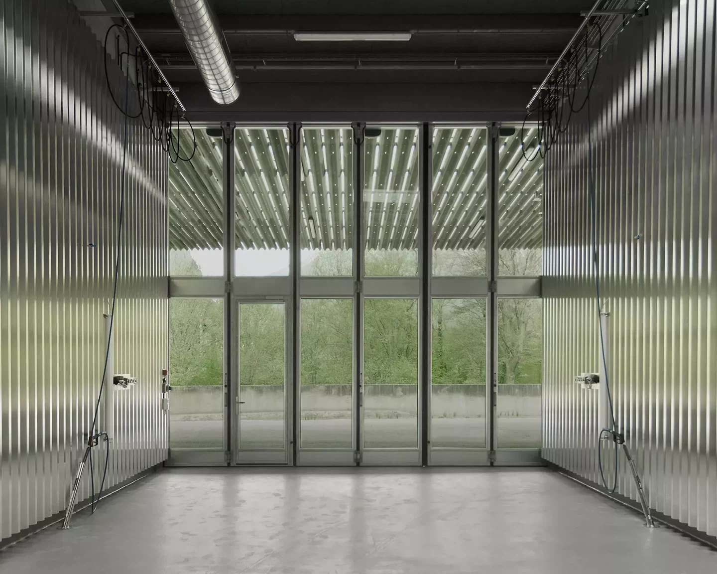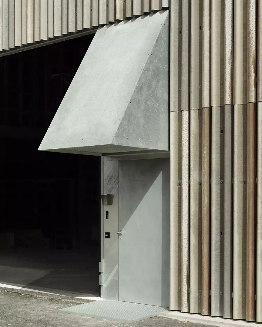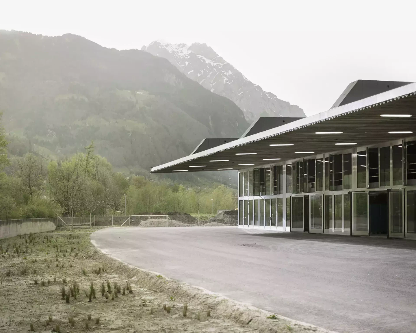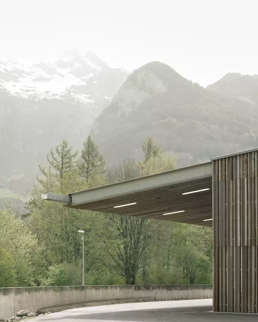 Situé à la limite sud de Schattdorf, ce lieu est marqué par l'activité commerciale, les infrastructures et de fortes influences environnementales. Un mur anti-inondation en béton entoure le terrain côté sud. Toute l'eau s'écoule dans la Stille Reuss. Une charpente en bois solide et recouverte absorbe les charges élevées dues au trafic et à la neige. Les revêtements du toit permettent de grandes portées et un avant-toit largement en saillie. L'organisation simple de la maison se fait à travers deux espaces simples: la voie intérieure, à partir de laquelle toutes les fonctions de l'atelier sont accessibles, et l'espace extérieur sous l'auvent. Cet espace ouvert permet d'effectuer divers travaux à l'abri de la neige, de la pluie et du soleil. Toutes les fonctions bénéficiant de la lumière du jour, telles que les bureaux et les ateliers, s'ouvrent vers le sud, la végétation et le ruisseau. La façade métallique robuste, fabriquée à partir de glissières de sécurité recyclées provenant de l'autoroute voisine, confère à la maison une identité propre dans la zone industrielle. Elle témoigne des tâches d'un centre d'entretien, de sa fonction protectrice et de l'influence des conditions météorologiques sur la maison.