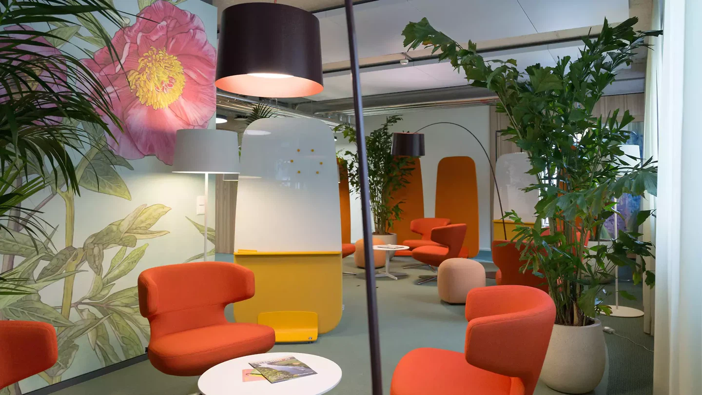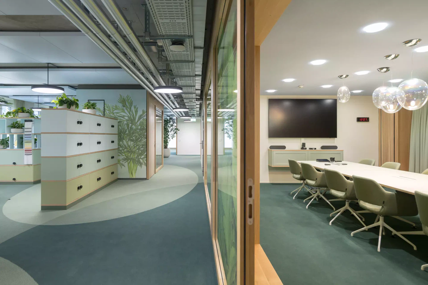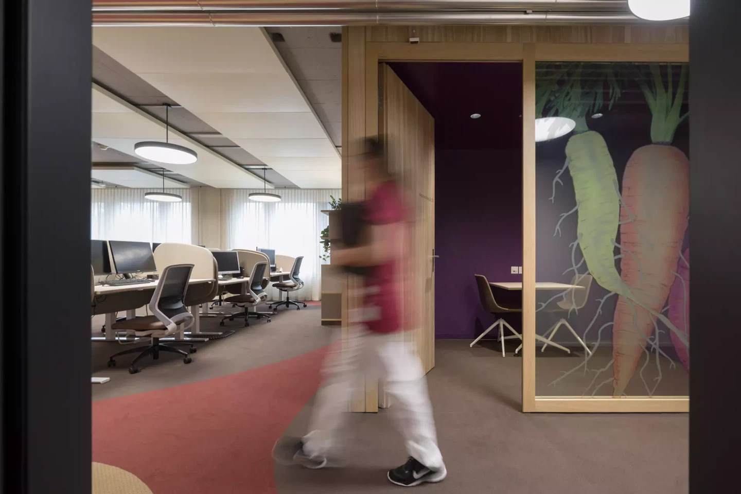 Afin de répondre à ces exigences différenciées dans le plan, les surfaces ont été zonées sur mesure. Un jeu volontaire de différents revêtements de sol définit les zones de travail et de collaboration à la fois visuellement et de manière tactile, sans interrompre la fluidité de l’espace. Des boxes de réunion, en tant qu’éléments «espace dans l’espace», structurent en outre le plateau. Ils créent des transitions intuitives et fluides entre les zones communicatives et dynamiques et les postes de travail protégés et calmes. En tant que points d’ancrage centraux et colonne vertébrale fonctionnelle, les grandes salles de réunion s’imposent. Le design des espaces de travail devient ici une posture, et non un simple aménagement mobilier. L’architecture de Darlington Meier, avec son approche centrée sur l’humain, a défini une enveloppe spatiale forte et une échelle conceptuelle claire. Nous avons repris cette base et l’avons traduite dans l’aménagement intérieur grâce à notre expertise approfondie en workspace design, au service de notre clientèle. Les nouveaux environnements de travail expriment notre ambition de placer, sans compromis, l’humain au centre de la conception dans la complexité de son flux de travail quotidien.