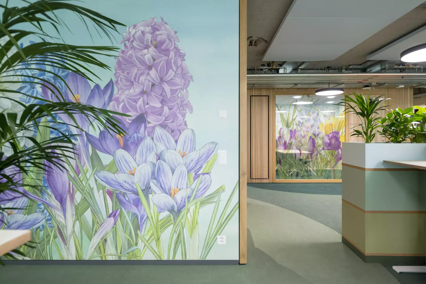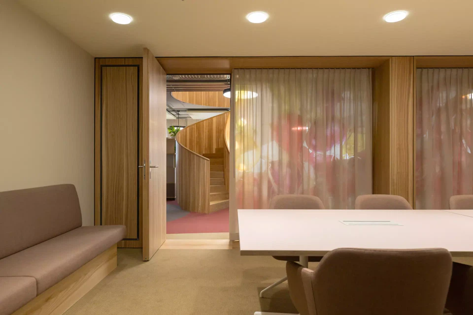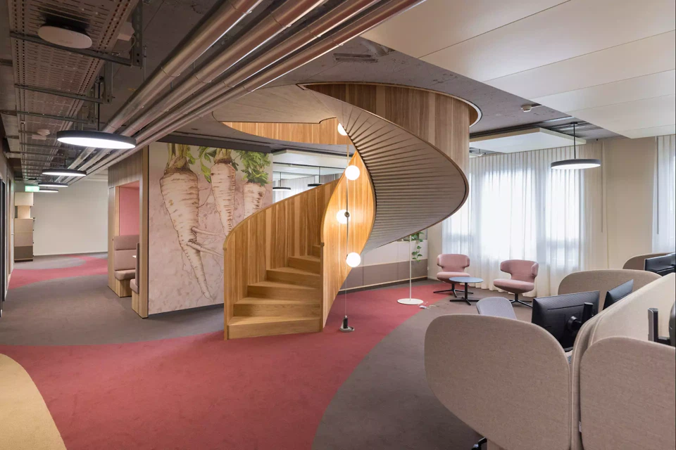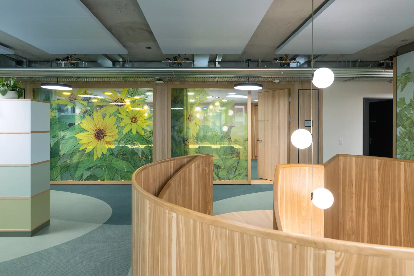 L’Hôpital cantonal d’Uri était confronté à une tension typologique classique: deux étages, deux cultures, un seul bâtiment. Au deuxième étage, le corps médical et les services de conseil – immédiats, opérationnels, proches de l’activité. Au troisième étage, la direction, les finances, les ressources humaines et la direction des soins – stratégiques, administratifs, avec un autre rythme. Sous la devise «grandir ensemble», ces deux niveaux ont été reliés entre eux. L’idée directrice repose sur une logique verticale : du bas vers le haut, de l’action opérationnelle à la réflexion stratégique. Le «substrat» du deuxième étage constitue la base fonctionnelle, profondément ancrée dans la réalité du travail clinique. Au troisième étage, l’espace se déploie en un « univers végétal ». L’escalier en colimaçon qui relie les niveaux n’est pas un simple élément de circulation, mais la transition spatiale entre deux états d’agrégation d’une même institution. Les espaces sont visuellement portés par l’illustration transversale aux étages d’Eva Kläui: elle rompt avec finesse la séparation verticale et tisse les deux univers fonctionnellement distincts en un ensemble atmosphérique.