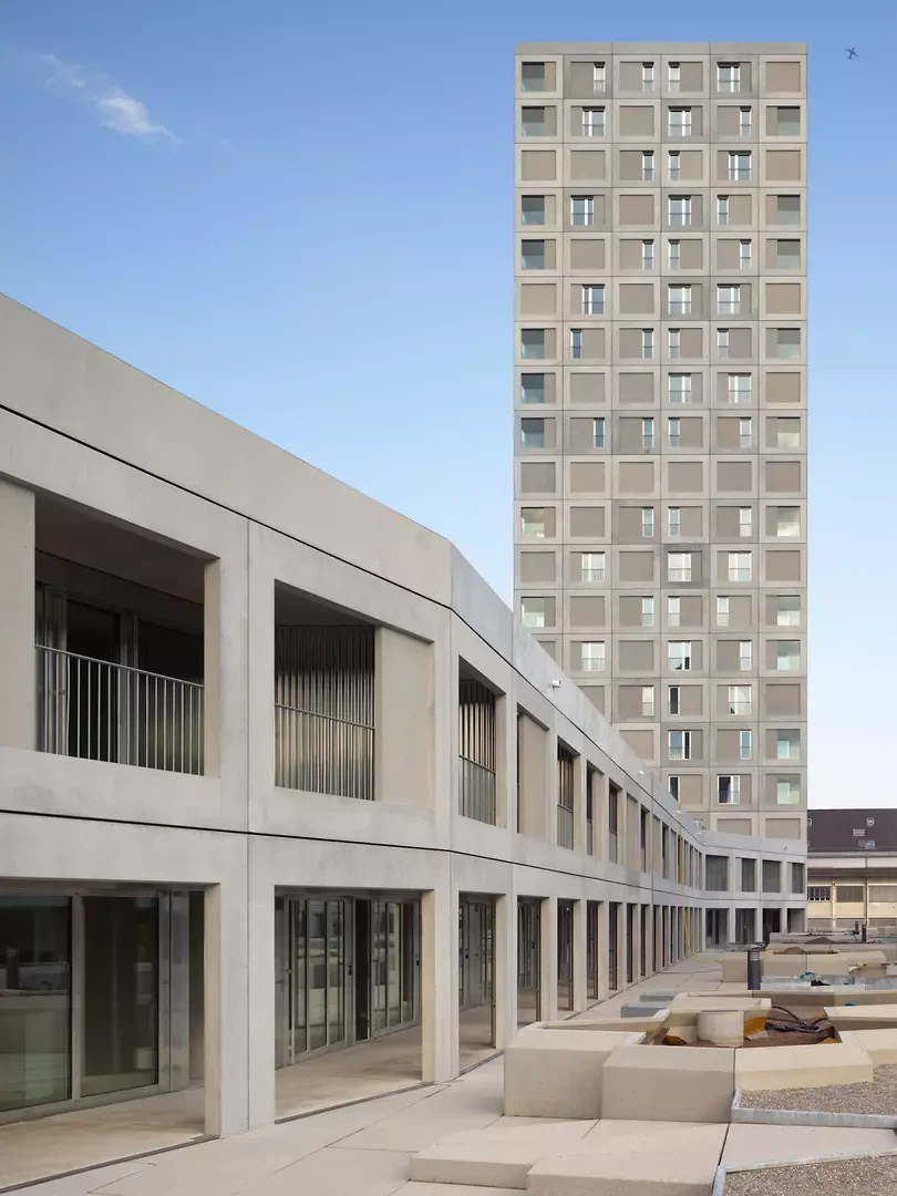 Dans le socle se trouvent les townhouses en duplex (appartements de 3½, 4½ et 5½ pièces), tous desservis par des colonnades au niveau de la cour intérieure. Le premier niveau accueille, à quelques exceptions près, les espaces communs, tandis que le second regroupe les espaces privés. Les loggias sont situées au-dessus des colonnades. Dans les deux tours, des typologies à quatre logements par étage sont réalisées, comprenant majoritairement des appartements de 3½, 4½ et 5½ pièces, ainsi que quelques logements de 1½ et 7½ pièces. Les loggias, protégées du vent et du bruit, sont intégrées au volume du bâtiment et orientées vers les quatre points cardinaux. Les fortes nuisances sonores autour des tours, ainsi que les exigences en matière de protection acoustique, ont fortement influencé la conception des plans, notamment la disposition des pièces et des loggias.