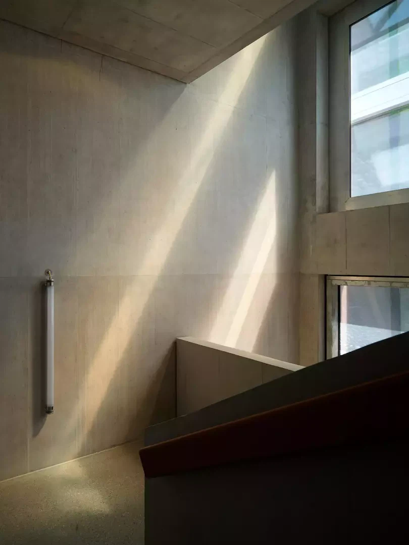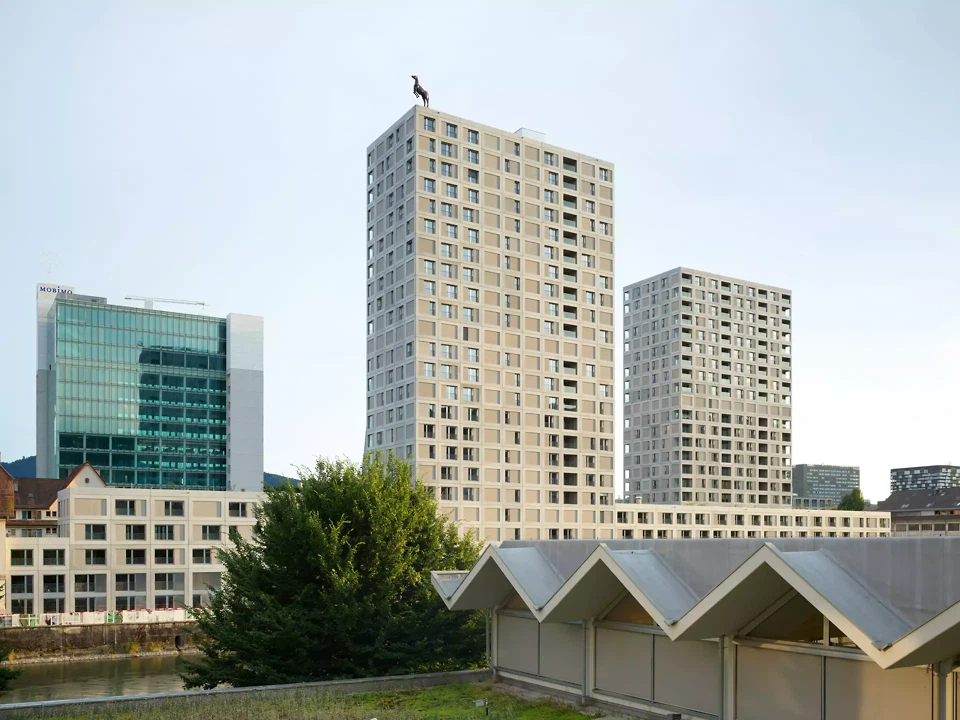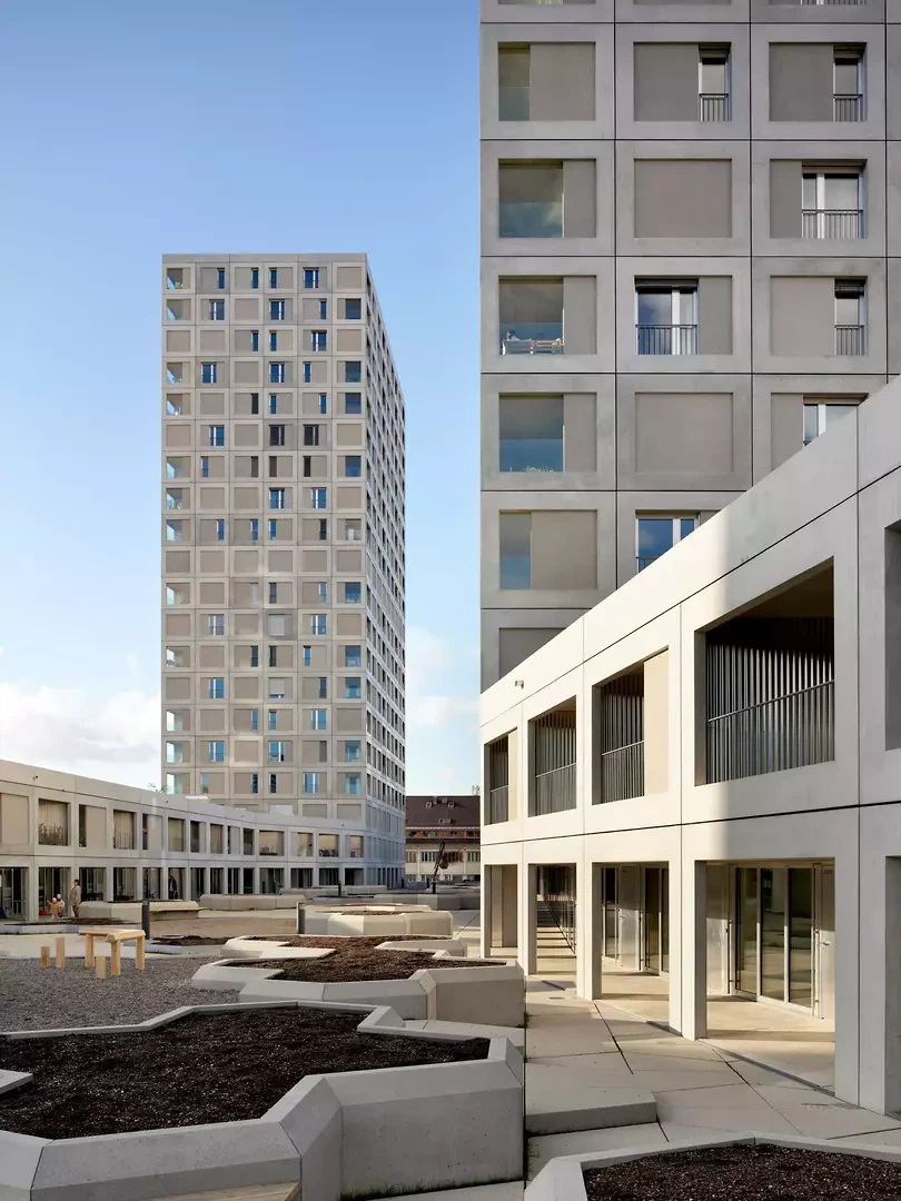 Les façades sont définies par les bâtiments existants, l’histoire industrielle de Zürich-West et la volonté d’unifier des usages différents. Le principe de la fenêtre en baie est repris des bâtiments historiques et réinterprété. Les façades recherchent des analogies avec l’architecture industrielle des XIXe et XXe siècles. Contrairement à la construction monolithique des bâtiments existants, une structure en cadres préfabriqués en béton caractérise le projet. Ces éléments, quasi identiques, sont des cadres comportant des vides structurels, dont les remplissages variés confèrent au bâtiment son expression tectonique. Les cadres en béton recyclé à parement lisse peuvent être entièrement ou partiellement fermés, ou totalement ouverts. Les remplissages sont en béton recyclé sablé, les fenêtres et les stores à lamelles en aluminium. Des garde-corps à barreaudage galvanisé sont placés devant les fenêtres. Pour des raisons acoustiques, les loggias sont équipées de garde-corps en verre. La composition tripartite en socle, corps et couronnement est traitée avec une grande retenue. La façade cherche à exprimer, au-delà des contraintes contextuelles, économiques et écologiques, une dimension sociale: la diversité dans l’unité. Des installations photovoltaïques couvrent entièrement les toitures des deux tours. Les toitures des townhouses, conçues selon le principe de l’«Animal-Aided Design», favorisent la création d’habitats et de biotopes pour diverses espèces animales et végétales.