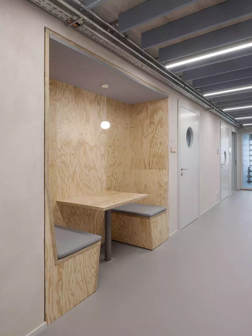 La transformation se manifeste extérieurement прежде tout par le déplacement de l’entrée. À la place de l’ancienne desserte logistique, le bâtiment acquiert ici sa nouvelle adresse. Une façade en bois ventilée définit cette zone comme un socle, complété par un long banc. Une fenêtre ronde permet des vues vers l’intérieur. Le long de la façade ouest, une végétation grimpe du rez-de-chaussée jusqu’aux étages supérieurs.