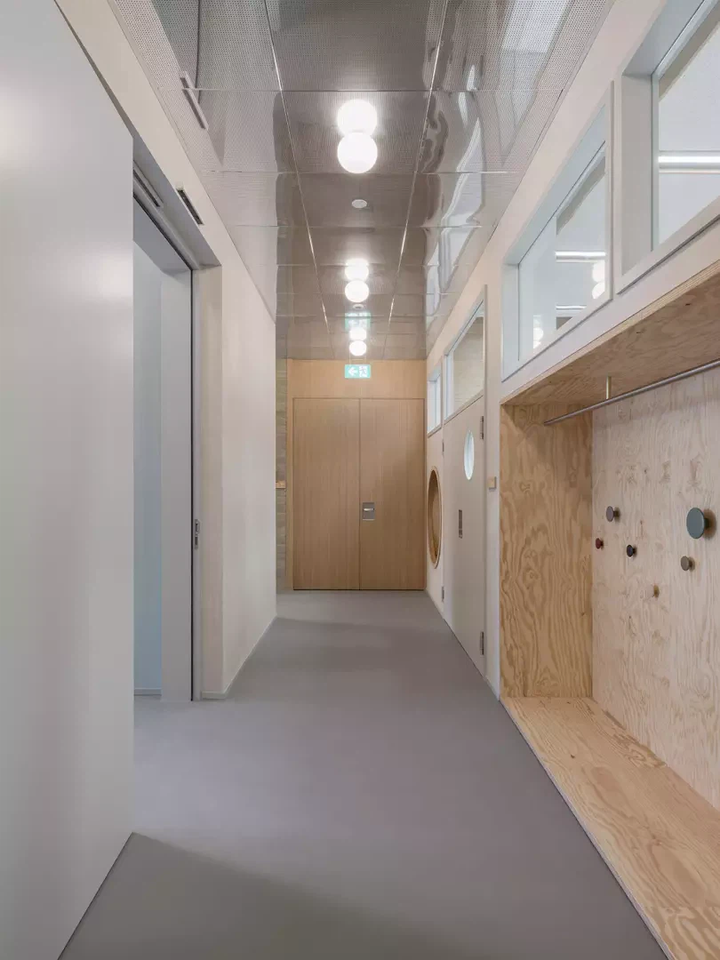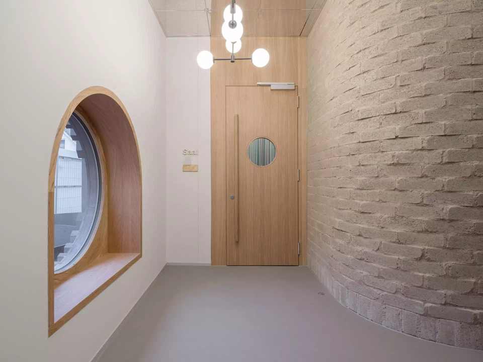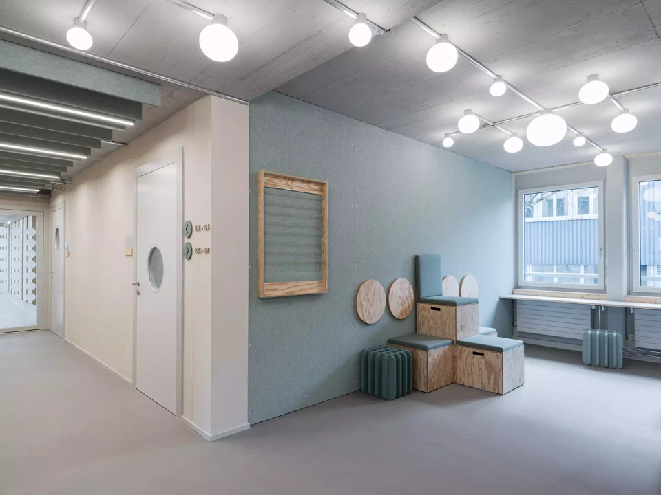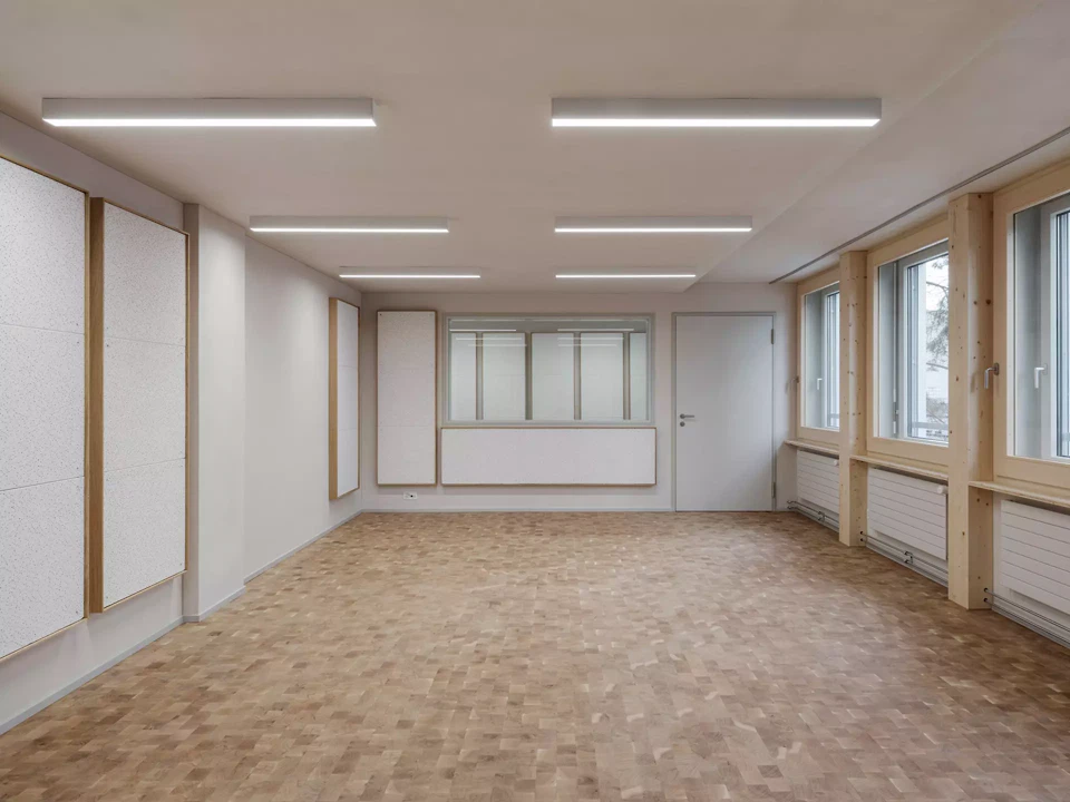 Au rez-de-chaussée se trouve la salle principale, pouvant accueillir jusqu’à 90 personnes. Elle sert à la fois de salle d’enseignement, de répétition et de concerts publics. Aux étages, répartis sur cinq niveaux, se trouvent des salles d’instruments, des salles de percussion, des salles pour groupes avec régie ainsi que des cabines de répétition individuelles insonorisées. Les espaces pour le personnel enseignant et la direction sont situés au 2e étage. Au sous-sol, trois salles de répétition louables complètent le programme. Les zones de circulation des étages supérieurs sont aménagées par des niches et des élargissements offrant différentes possibilités de séjour. Des étagères arrondies et des espaces de retrait répondent à l’usage par des enfants et des jeunes. La reconversion d’un immeuble de bureaux des années 1980 en école de musique a nécessité des interventions acoustiques ciblées. Derrière les fenêtres existantes, un second niveau de fenêtres en bois a été installé. Au rez-de-chaussée et au 1er étage, un système de « boîte dans la boîte » sépare les usages bruyants des usages plus sensibles.