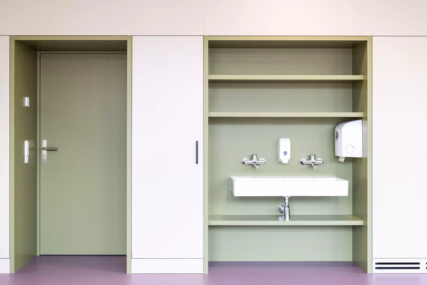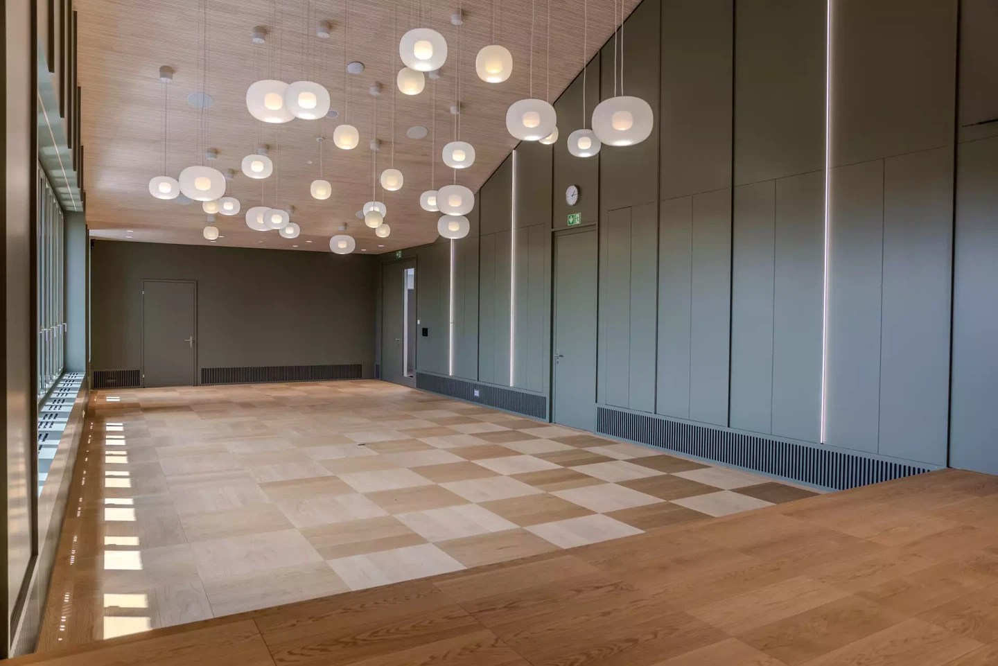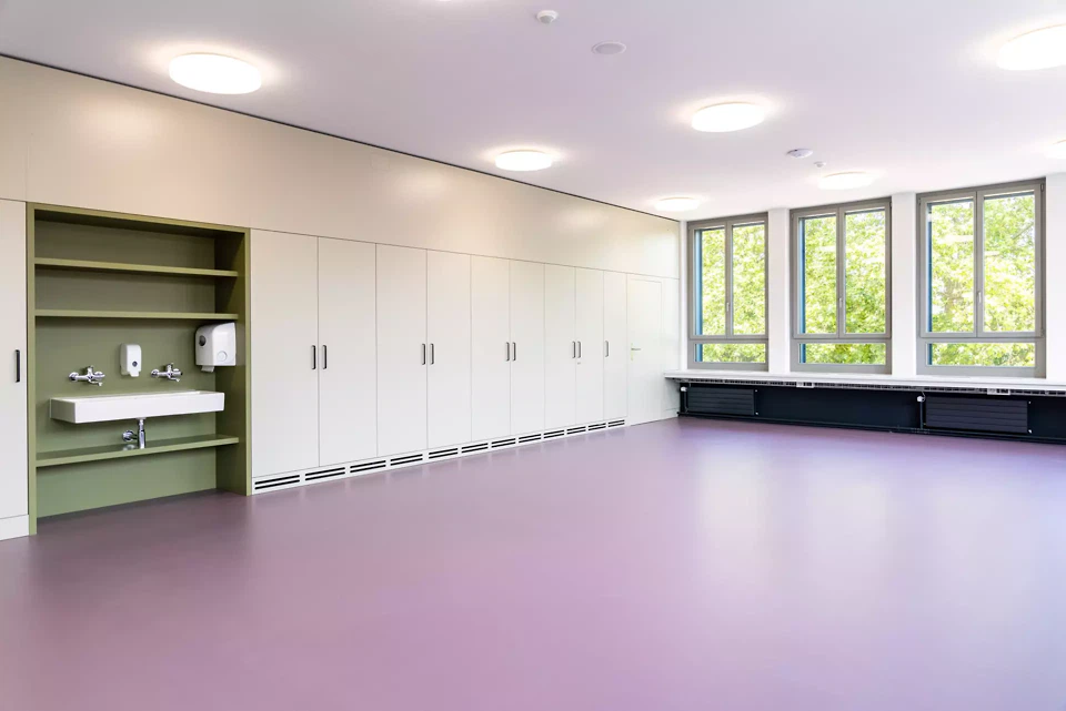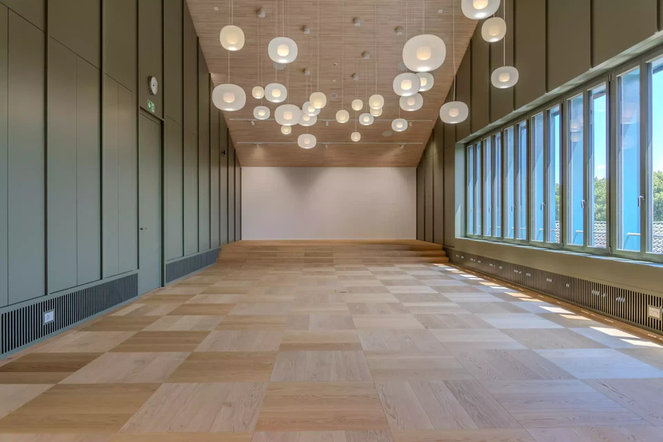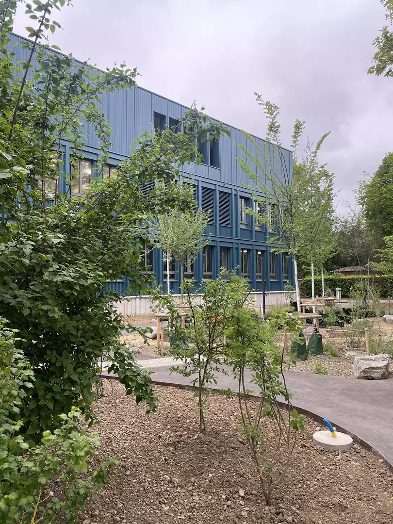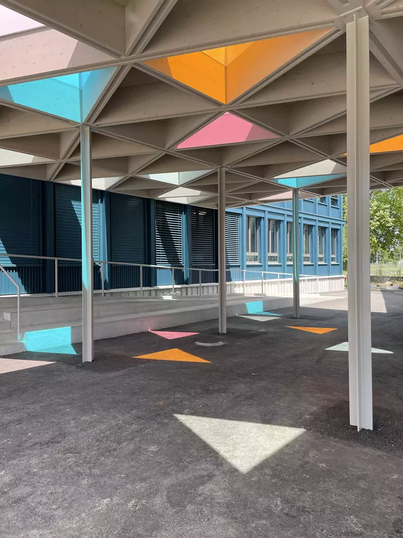 Le bâtiment scolaire Kreuzgut, situé au Trüllenbuck 23 à Schaffhouse, se présente comme un complexe allongé à trois étages (sous-sol, rez-de-chaussée, étage) avec une seule aile, dont le niveau inférieur est partiellement encastré dans le terrain. La partie centrale d'origine a été construite dans les années 1950 en même temps que le gymnase, puis complétée dans les années 1980 par des salles de classe supplémentaires. Le gymnase a été rénové en 2017. Dans le cadre de la rénovation complète actuelle, le bâtiment existant a été agrandi vers le nord-est par une extension de quatre étages (sous-sol, rez-de-chaussée, étage, combles) et réorganisé sur le plan structurel. Pour ce faire, une partie du bâtiment existant a été démolie. L'extension, une construction hybride composée d'éléments en acier, en béton et en bois, est reliée directement au bâtiment existant à tous les niveaux, à l'exception des combles, par des passerelles. Elle comprend des salles de classe et des salles de groupe supplémentaires, une salle de réunion, un espace réservé aux enseignants avec une bibliothèque et une salle de détente, ainsi que diverses pièces annexes et débarras au sous-sol. La nouvelle construction délimite clairement l'espace de la cour de récréation du Kreuzgutweg et améliore considérablement sa qualité de vie grâce à la valorisation de la cour couverte et au réaménagement de l'entrée principale entre l'école et le gymnase. La structure en bois du toit de la cour de récréation est conçue comme une structure triangulée dans laquelle des panneaux individuels sont équipés de lucarnes colorées qui créent un jeu de lumière vivant sur la place. Les parties existantes du bâtiment ont été entièrement rénovées et renforcées pour résister aux séismes. Les différentes étapes de construction restent clairement visibles et témoignent de l'évolution historique de l'ensemble. Le nouveau bâtiment répond à la norme Minergie-P-ECO, tandis que les parties rénovées répondent à la norme Minergie-ECO.