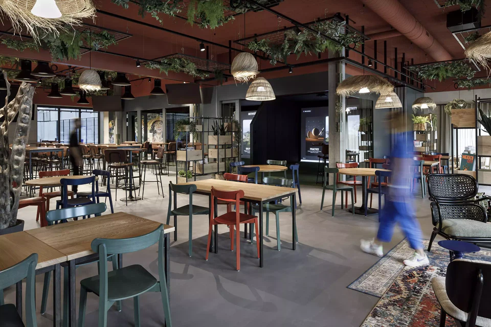 L’idée de conception s’inspire des origines sud-américaines de ce sport. Ce «charme sud-américain» a été interprété comme un fil conducteur créatif et traduit de manière cohérente dans l’espace, les matériaux et la palette de couleurs. Il ne s’agissait pas d’un simple effet décoratif, mais de traduire l’énergie, la convivialité et le mouvement en une expérience spatiale. Les locaux devaient capter la dynamique du jeu et la prolonger dans les espaces de détente.