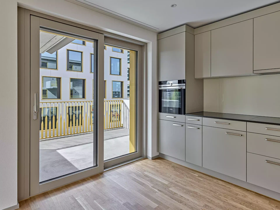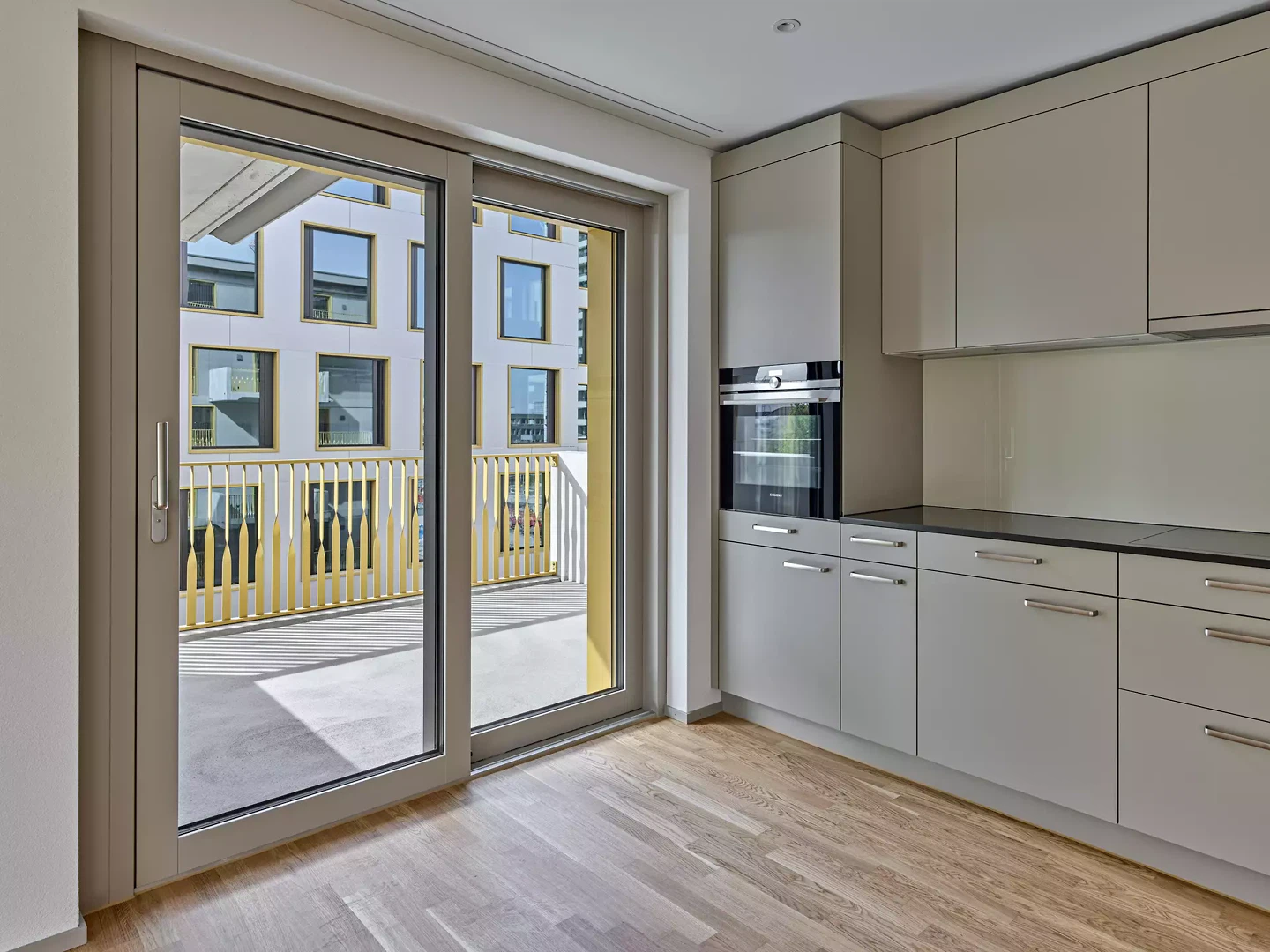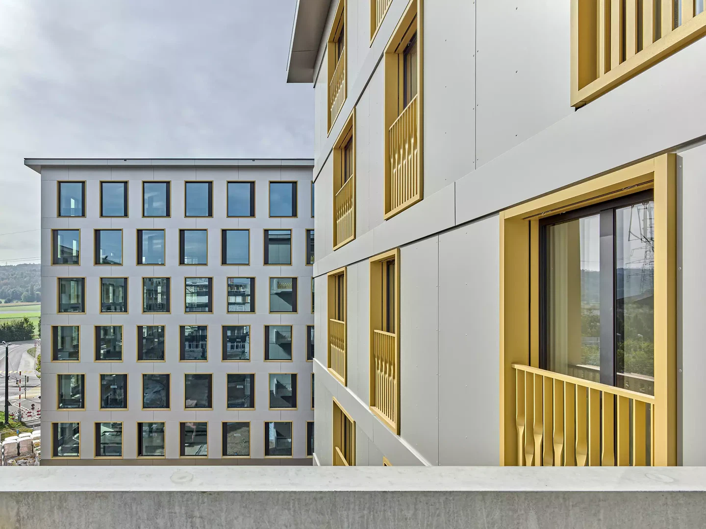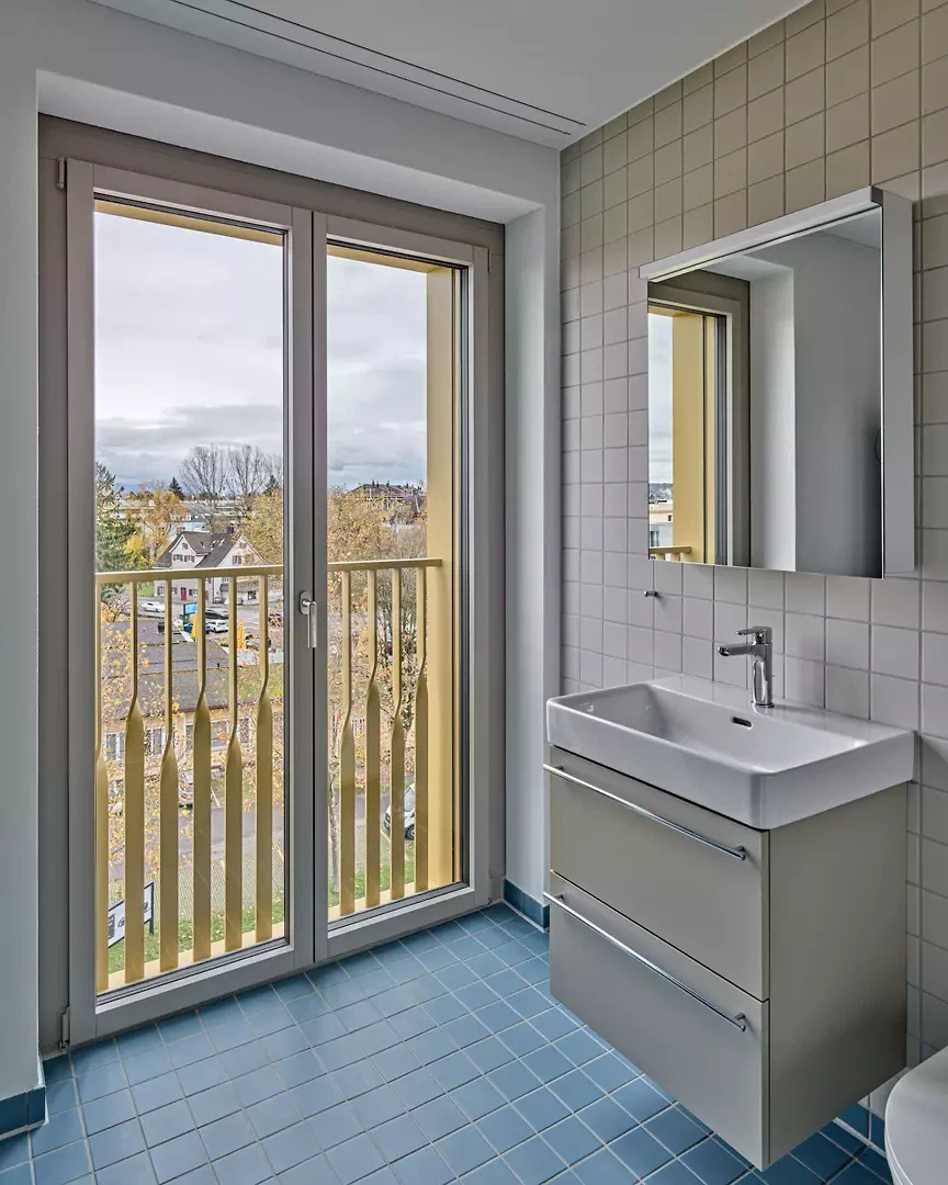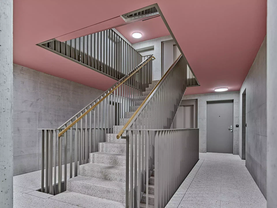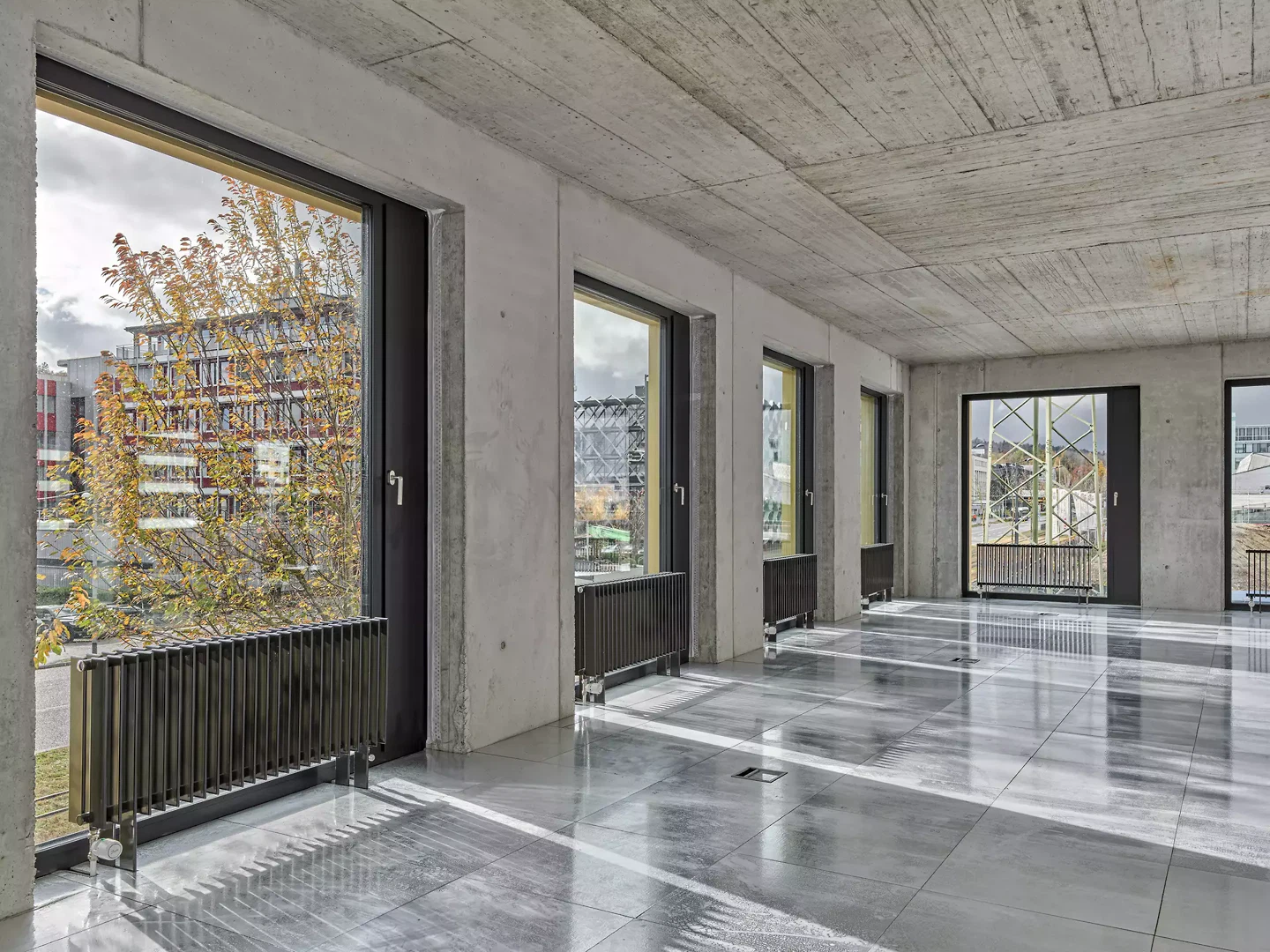 Qu'il s'agisse d'habitation ou de travail, les façades sont dominées par une trame rigoureuse composée de seulement six types de fenêtres. Décalées d'étage en étage, elles alternent avec des balcons en saillie donnant sur la cour. Elles masquent la variabilité intérieure des 162 appartements. Cela traduit le grand écart entre économie et durabilité : tout est maintenu aussi simple que possible, les matériaux sont investis au bon endroit. L'utilisation du béton a été soigneusement étudiée en tenant compte de l'impact environnemental et des performances telles que la durabilité et la masse (isolation acoustique). Cela a permis de réaliser des plafonds de 18 cm d'épaisseur, ce qui a compliqué la planification en raison de la disposition verticale des installations techniques. Dans l'ensemble, malgré sa masse imposante, le bâtiment donne l'impression d'un ensemble spacieux qui se fond dans le paysage urbain.