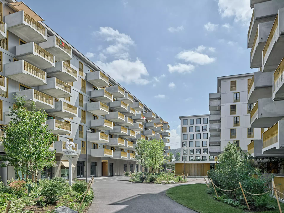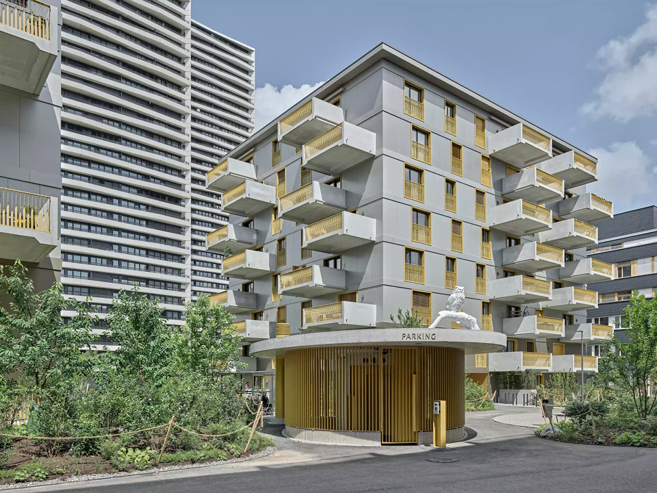 L'ensemble entoure un centre soigneusement zoné. Vers l'extérieur, vers les rues principales, une tête et une traverse imposantes servent d'introduction – ou de conclusion encadrée – au quadrilatère du site. Leur ouverture résolument en angle invite à entrer dans la cour. Malgré les mesures antibruit, les bâtiments donnant sur la rue ne sont pas hermétiques. Segmentés en petits espaces commerciaux et crèches et dotés de passages, les rez-de-chaussée sont poreux et visent à animer les lieux. Côté parc, le complexe se divise en deux bâtiments ponctuels. Ils font office de passerelles vers la verdure, leur disposition offrant à presque tous les appartements une vue sur le parc.