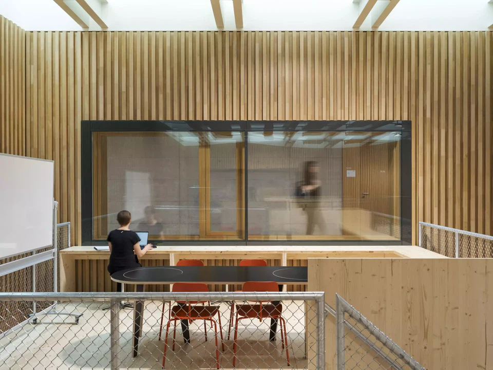 La hauteur de la salle de sport est exploitée de manière optimale grâce à l’intervention sur deux niveaux. Les galeries à différentes hauteurs offrent non seulement des possibilités de retrait, mais aussi des perspectives variées sur l’espace. Les ouvertures visuelles vers les couloirs du 2e étage ont été intégrées de manière consciente: les niveaux des galeries dialoguent avec les niches d’assise des fenêtres côté couloir, créant une interaction ludique avec l’environnement. Ces points de contact renforcent également la continuité spatiale à l’échelle du bâtiment.