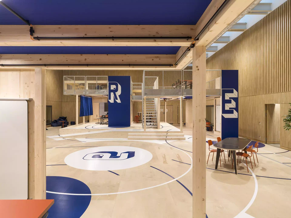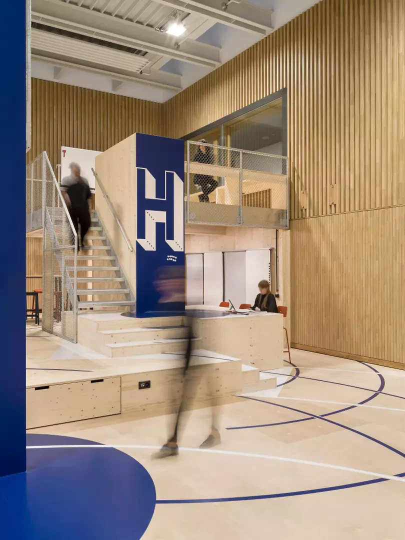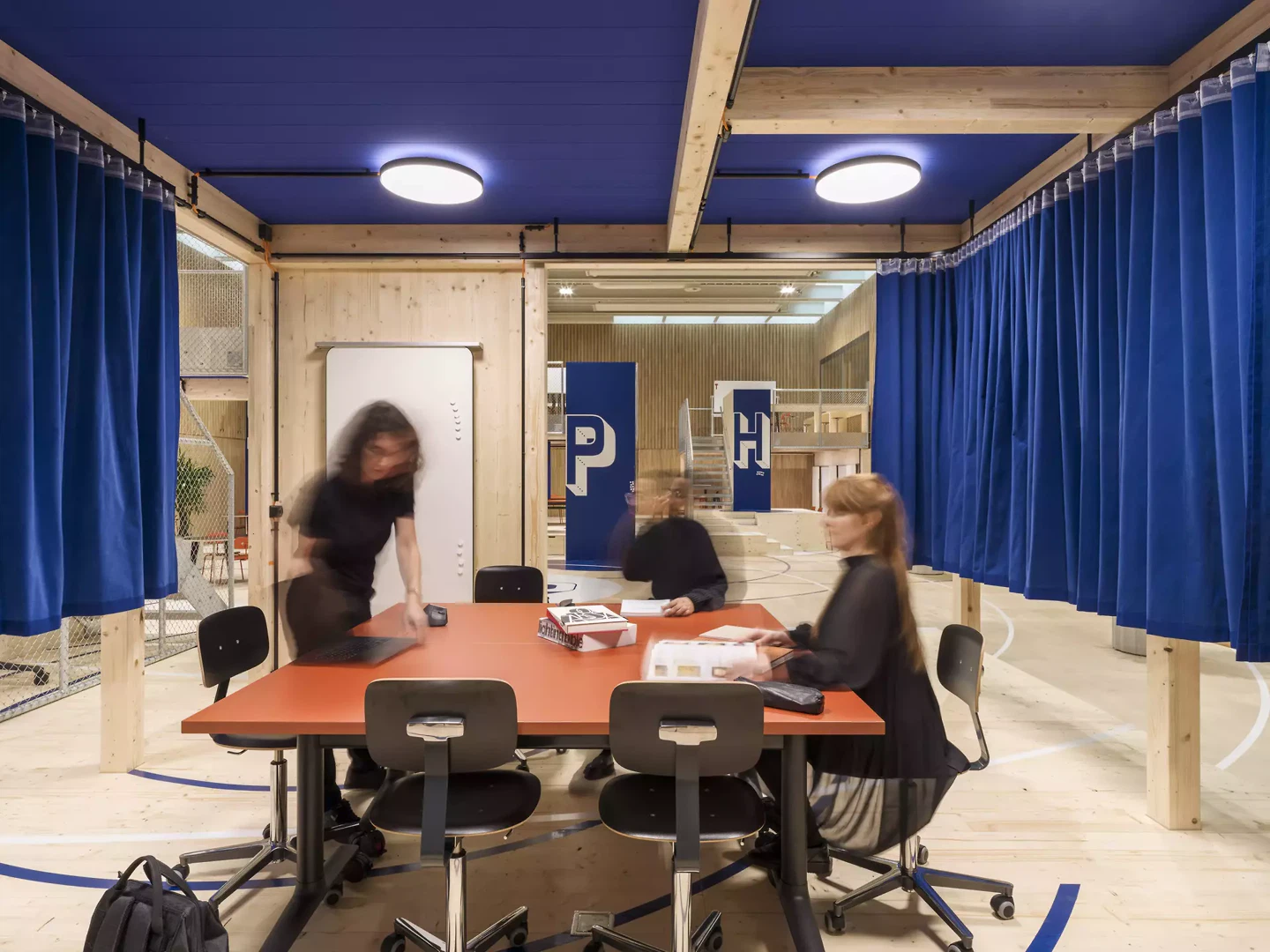 Le nouvel espace éducatif polyvalent associe innovation pédagogique et contraintes structurelles du lieu. Tous les aménagements ont été conçus comme légers, modulaires et entièrement démontables. Une attention particulière a été portée à l’honnêteté et à la simplicité des matériaux. La nouvelle surface d’apprentissage devait conserver un caractère temporaire tout en offrant une flexibilité maximale d’usage. La réutilisation des matériaux après leur utilisation actuelle a été intégrée dès la conception. Le sol sportif existant a été protégé par des panneaux en contreplaqué de bouleau. De nouvelles structures en poteaux d’épicéa et panneaux contrecollés, ainsi que des escaliers et garde-corps en acier galvanisé, forment une construction robuste et réversible, optimisée pour la répartition des charges. Des panneaux en feutre améliorent l’acoustique et servent de surfaces d’affichage. L’éclairage existant est conservé et complété par un concept lumineux ciblé sous les galeries, garantissant un éclairage homogène de l’ensemble des espaces d’apprentissage. Sur le plan formel, un concept clair de couleurs et de matériaux structure l’atmosphère. Le bleu agit comme couleur directrice, soulignant murs, sous-faces de plafond et rideaux, allégeant ainsi la matérialité dominée par le bois et créant un contraste volontaire avec l’architecture en béton du bâtiment scolaire. Des meubles en orange brûlé apportent des accents chaleureux. Des éléments graphiques tels que la séquence de lettres «S-P-H-E-R-E» remplissent des fonctions à la fois d’orientation et de composition, tout en reprenant, par des motifs circulaires, le concept de goutte d’eau en référence à l’usage initial du lieu. Le mobilier est entièrement pensé pour la flexibilité: tables réglables en hauteur et pliables sur roulettes, chaises empilables et mobiles, poufs, écrans mobiles, tableaux blancs et panneaux en feutre permettent différentes formes d’enseignement. Des estrades avec rangements intégrés, des tables hautes et des éléments mobiles autorisent des reconfigurations rapides; le mobilier non utilisé peut être stocké dans l’ancien local d’équipement. Des rideaux permettent de créer des espaces séparés selon les besoins.