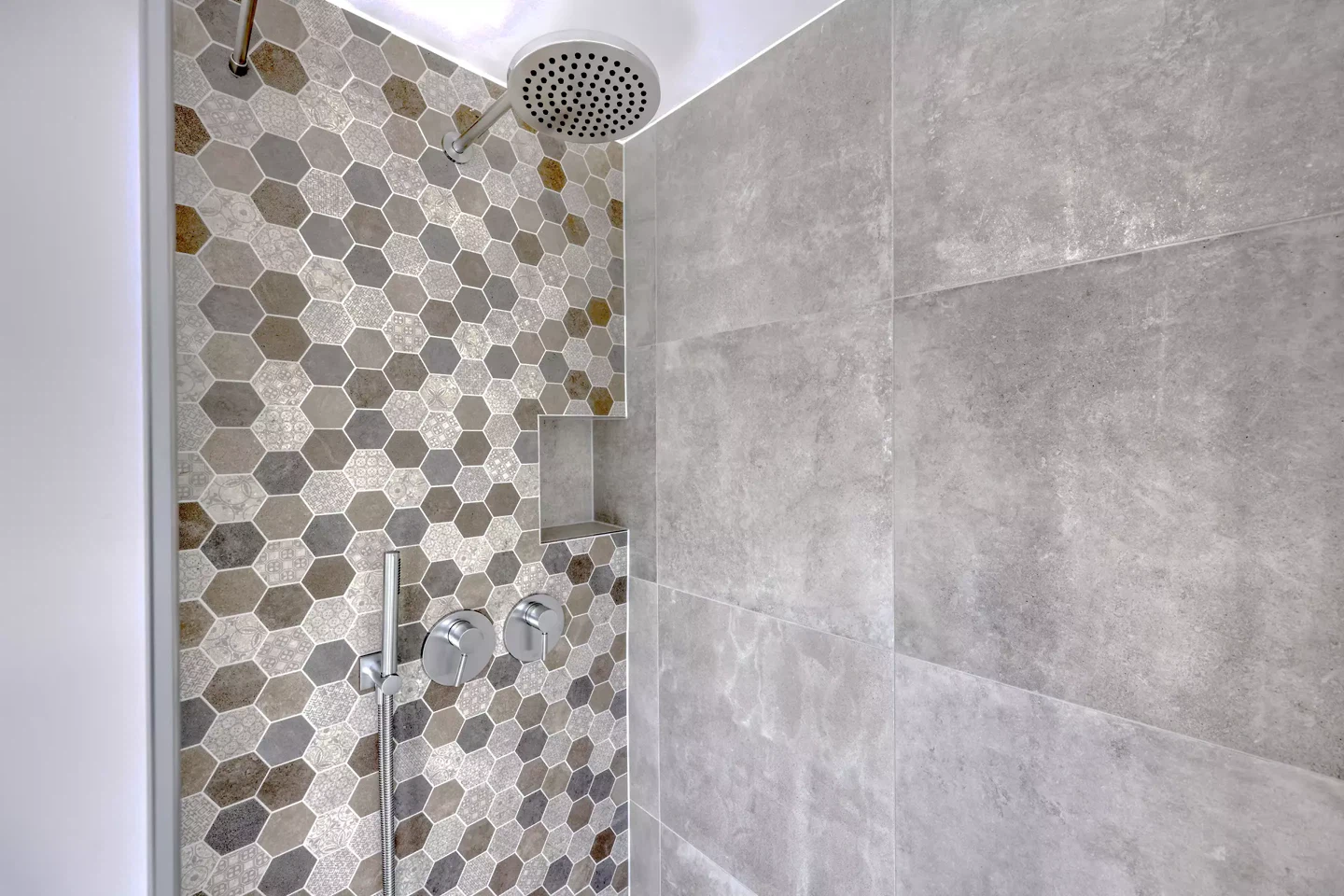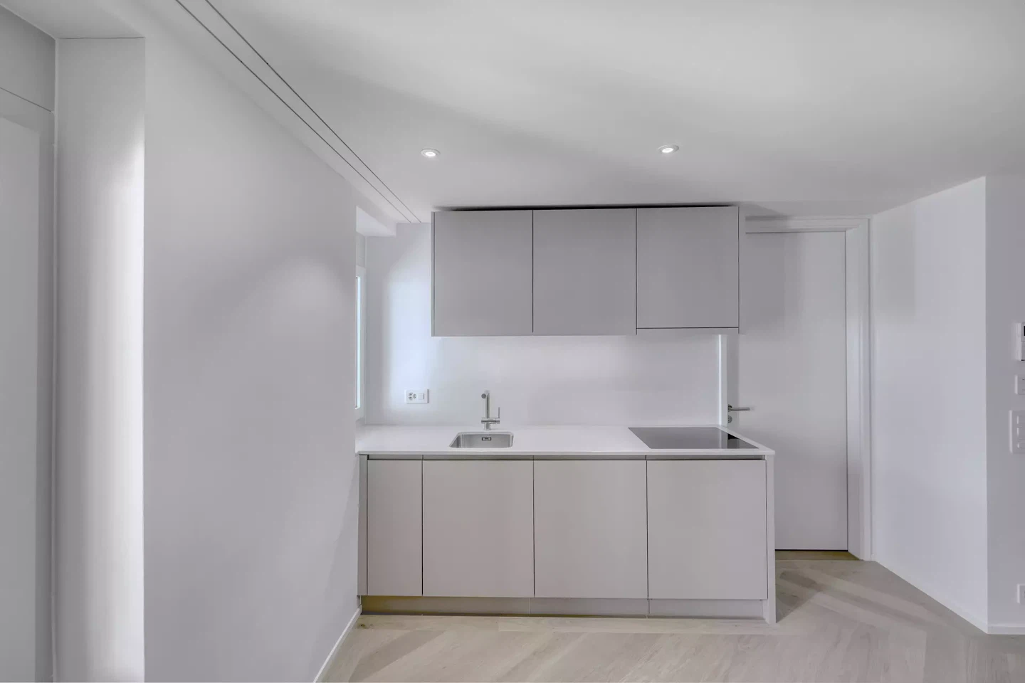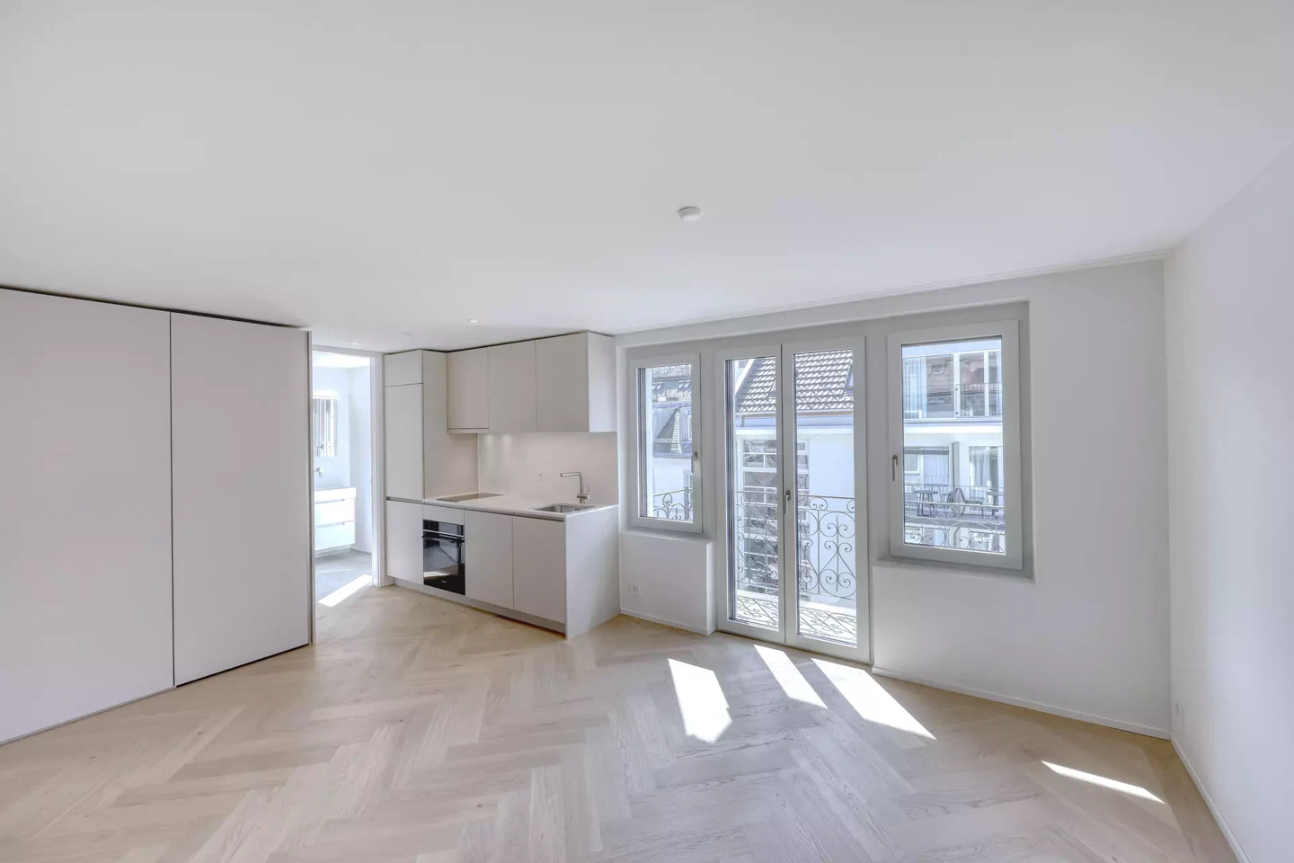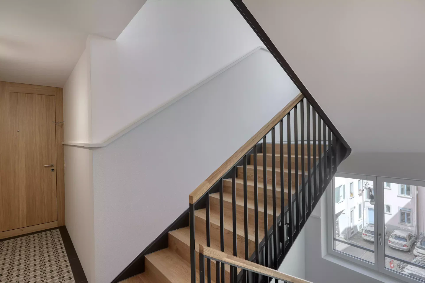 Au cœur du concept se trouve une palette de couleurs et de matériaux sobre et harmonieuse. Le parquet en chêne huilé à motif chevrons, les dalles en céramique et les couleurs assorties créent une atmosphère contemporaine qui allie tradition et modernité. La conception réinterprète avec respect la structure existante de la façade, par exemple par des adaptations ciblées au niveau des fenêtres et des balustrades, renforçant ainsi l'identité architecturale du bâtiment.