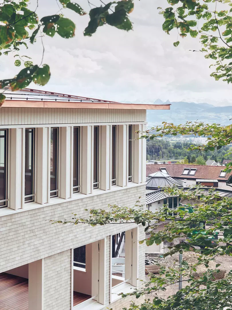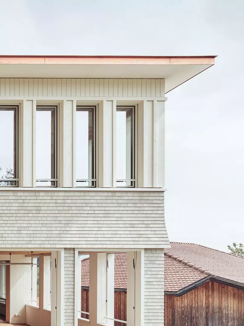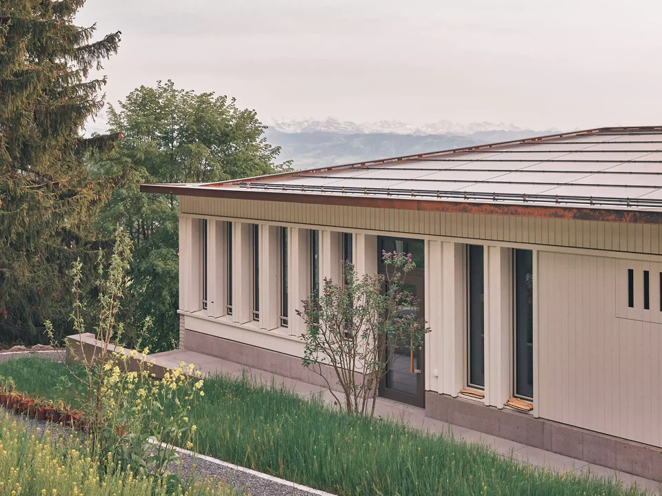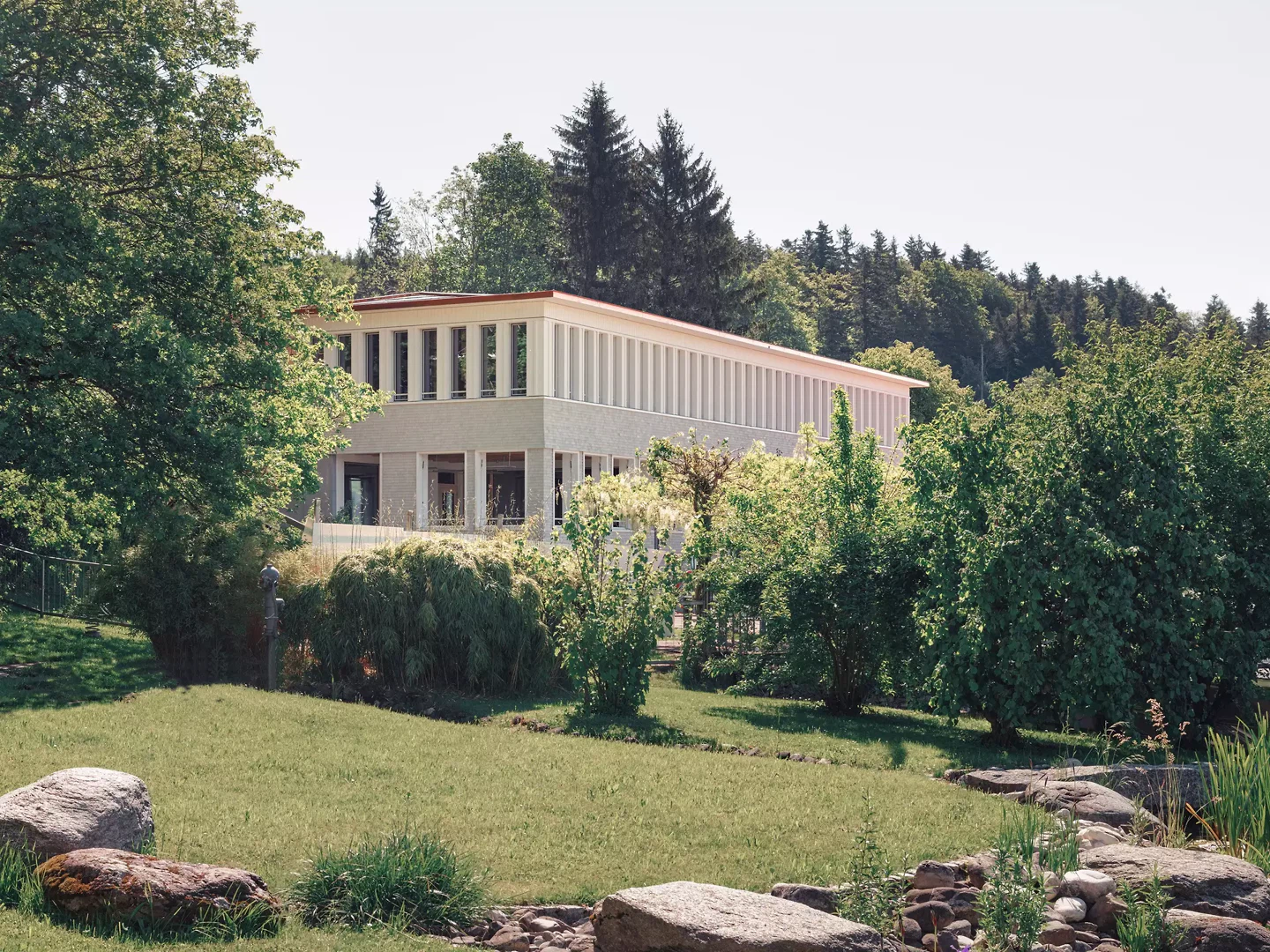 L'extension s'intègre dans le paysage et l'ensemble architectural existant sous la forme d'un volume allongé. La résidence, une ancienne maison de repos datant de 1905, constitue le bâtiment principal, dont la façade principale donne sur la vallée, et se distingue par une façade en bois aux détails finement travaillés. Les étages supérieurs reposent sur le socle massif du bâtiment et sont recouverts d'un parement en bardeaux de bois. L'étage mansardé est constitué de menuiseries ornées et est couronné par une toiture aux lignes ondulées. La nouvelle construction reprend ces principes caractéristiques du bâtiment principal et se niche naturellement sur la pente légèrement orientée vers l'ouest. La structure architecturale, suggérée par l'esquisse d'un étage mansardé, fait le lien avec l'école située au sud, tout en restant un bâtiment fonctionnel simple destiné à des ateliers à l'allure agricole.