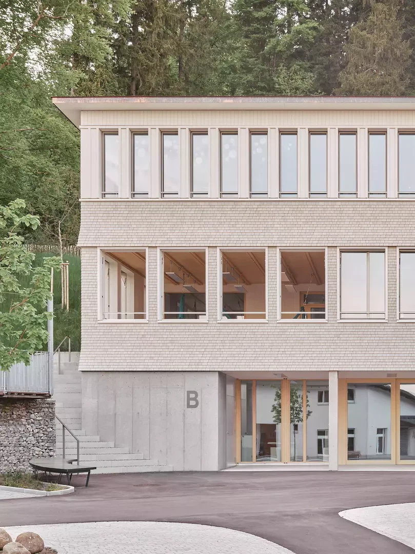 Les salles de classe, ainsi que les locaux annexes qui leur sont associés, sont proposés sous la forme d'espaces contigus attrayants aux étages supérieurs. En principe, leur disposition est flexible et adaptable aux besoins. Grâce à cette disposition, toutes les surfaces utiles principales bénéficient d'un éclairage équivalent. Les cloisons transversales ne sont pas porteuses et peuvent donc être modifiées à long terme. Cette disposition de base garantit une marge de manœuvre maximale pour la mise en œuvre de différentes formes d'enseignement pédagogique. L'espace réservé aux enseignants et la direction de l'école sont facilement accessibles, situés à côté de l'entrée principale avec vue sur la cour de récréation. Les salles de garderie et de détente se trouvent au dernier étage et disposent d'un accès à la cour de récréation voisine ainsi qu'à l'espace extérieur attenant. Les salles de garderie et de détente se trouvent au dernier étage et disposent d'un accès à la cour de récréation voisine ainsi qu'à l'espace extérieur attenant.